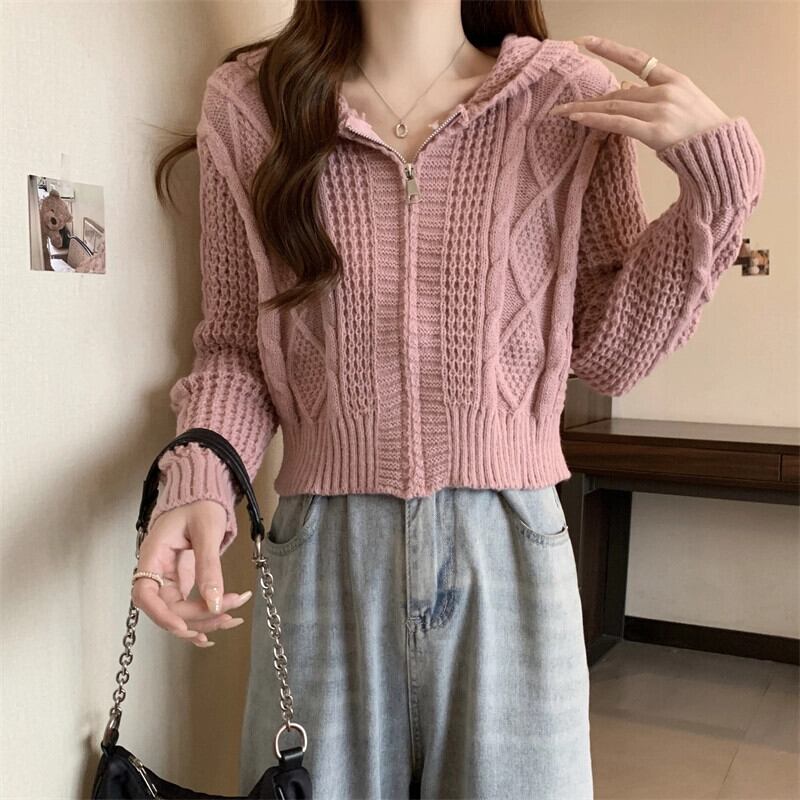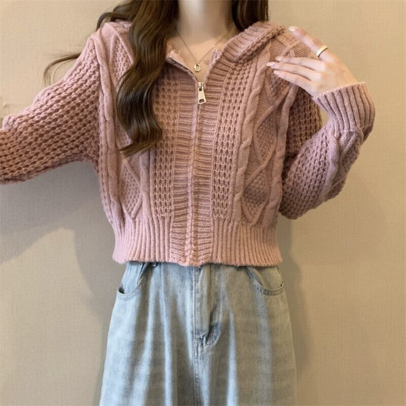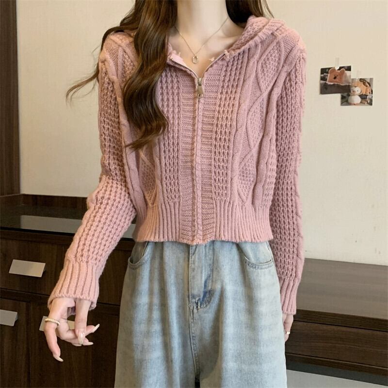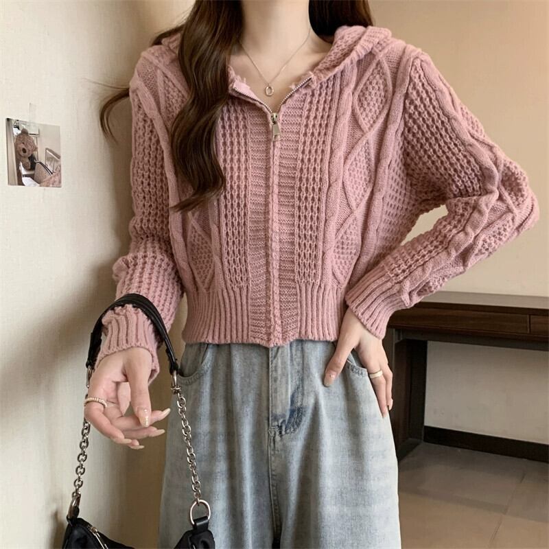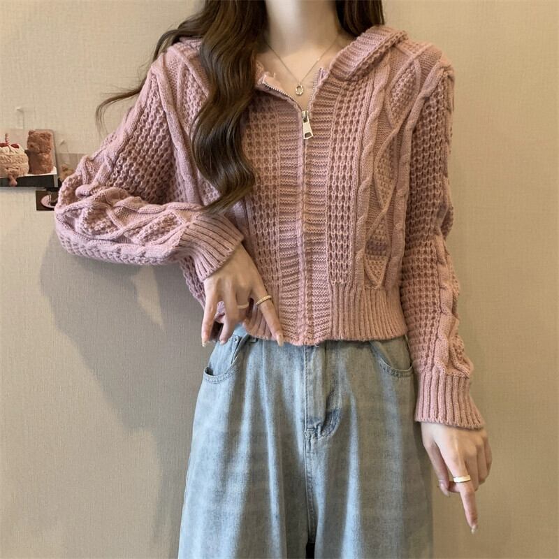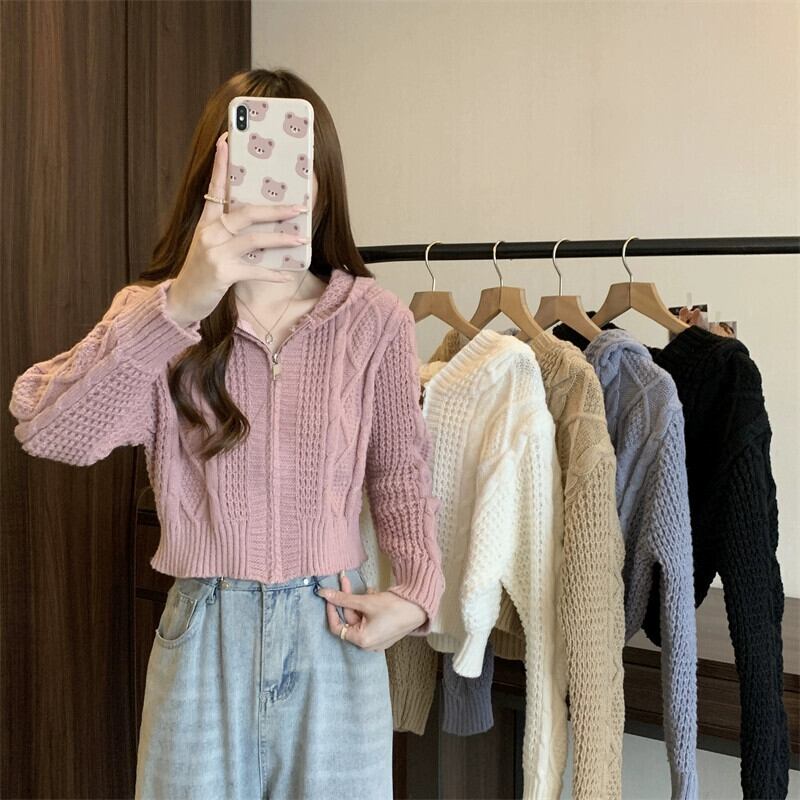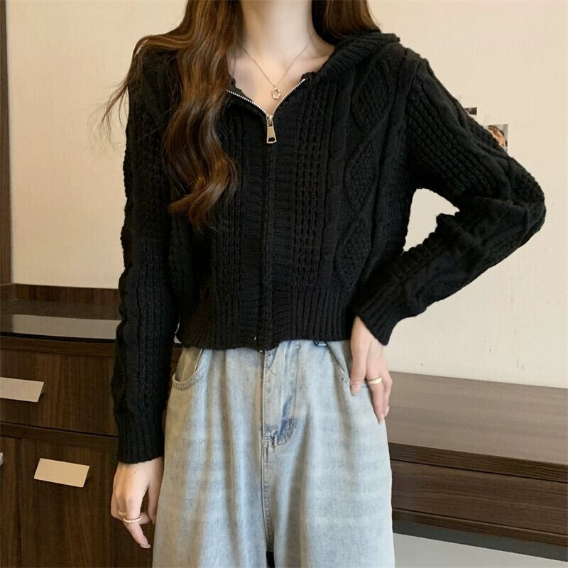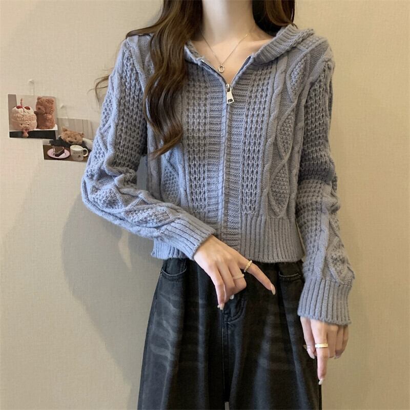 ツイストフード付きセータージャケット女性秋冬 2023 新しいスタイルルーズアウタージッパーショートニットカーディガン オータム 秋物 ウィンター 冬物 7460022601596463 | framboise21