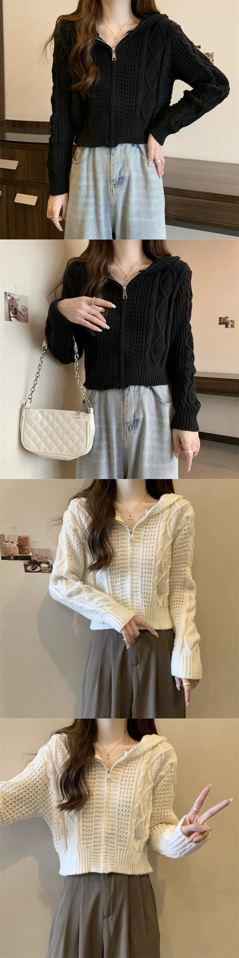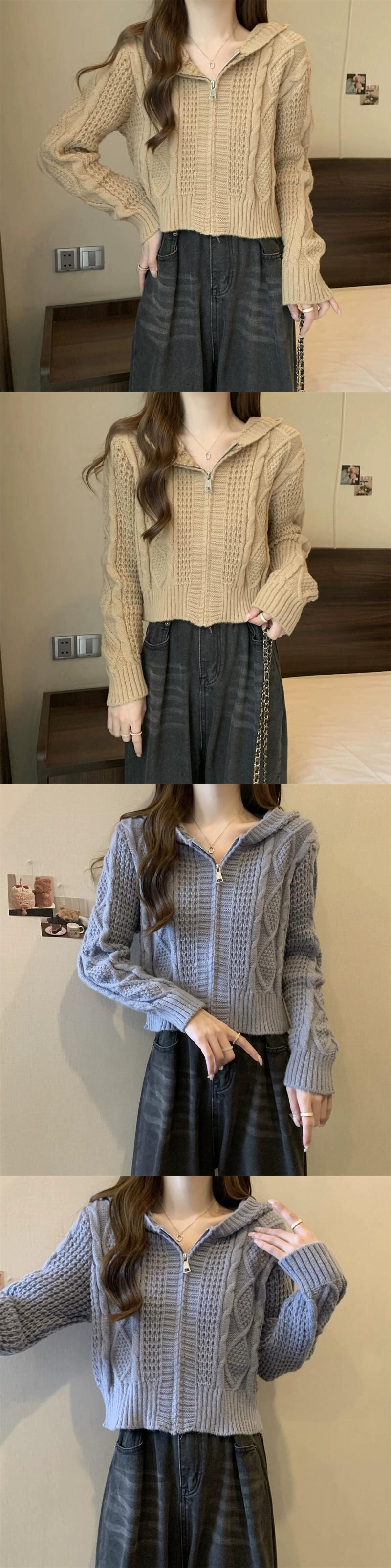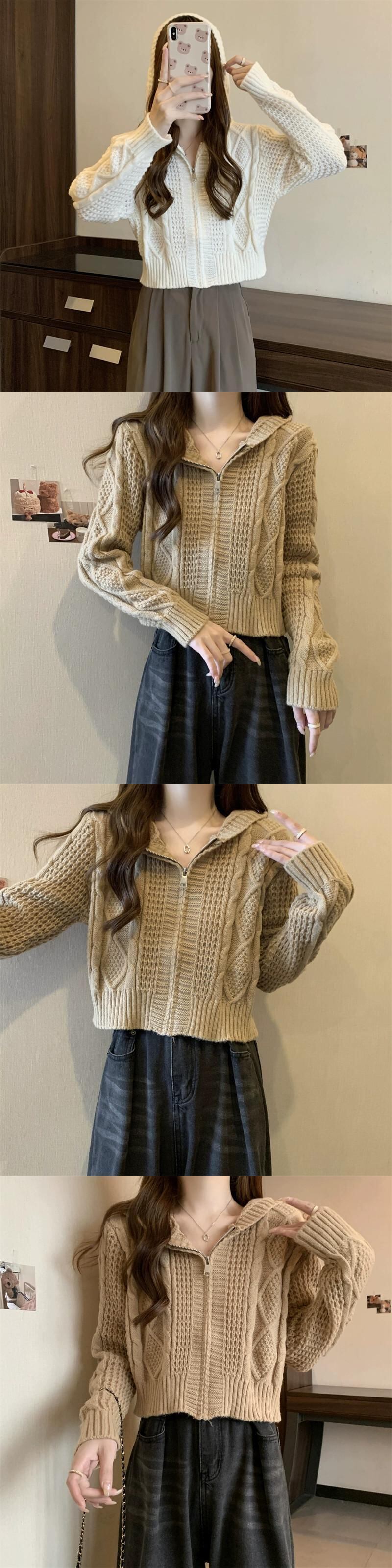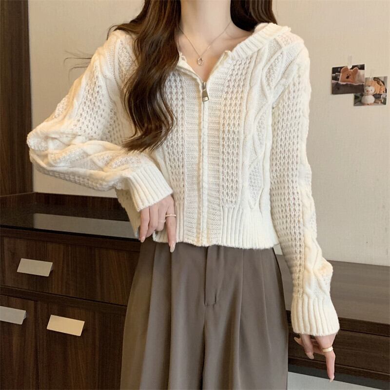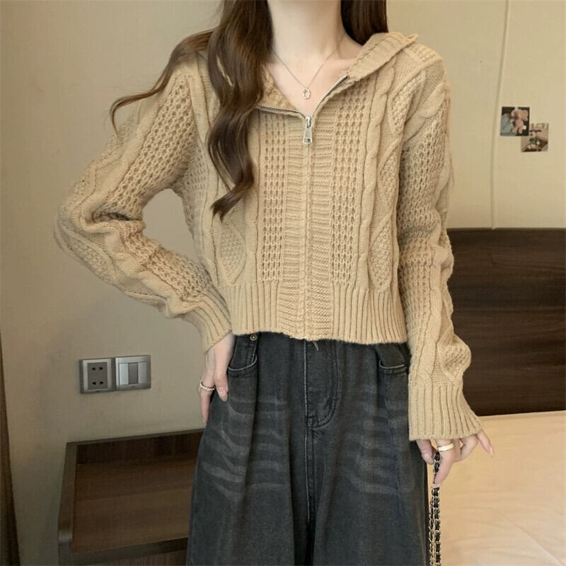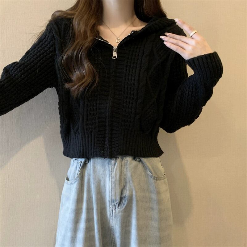 ツイストフード付きセータージャケット女性秋冬 2023 新しいスタイルルーズアウタージッパーショートニットカーディガン オータム 秋物 ウィンター 冬物 7460022601596463 | framboise21