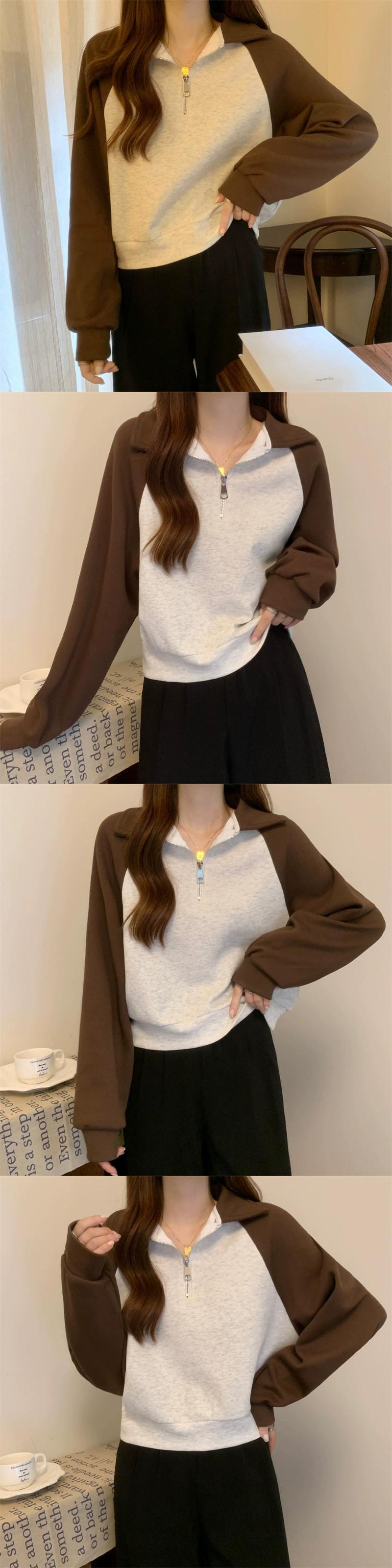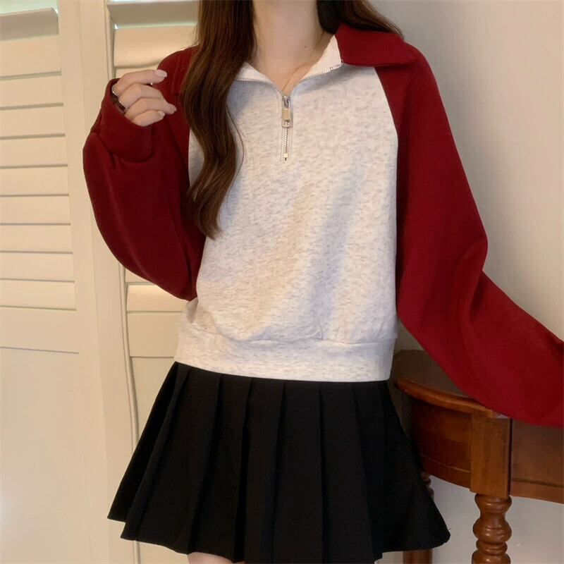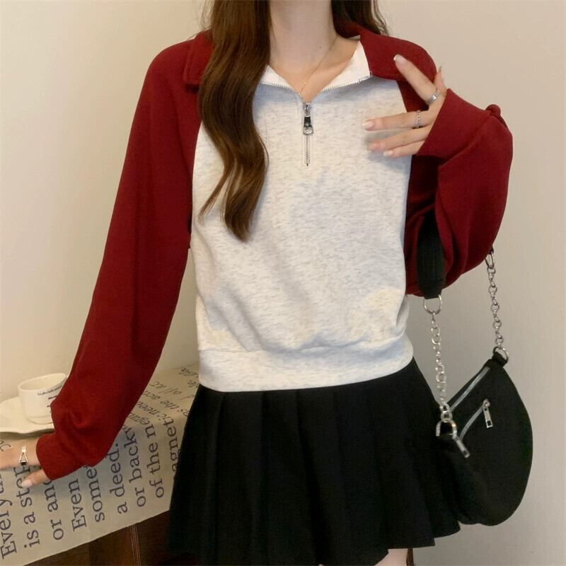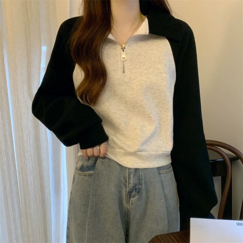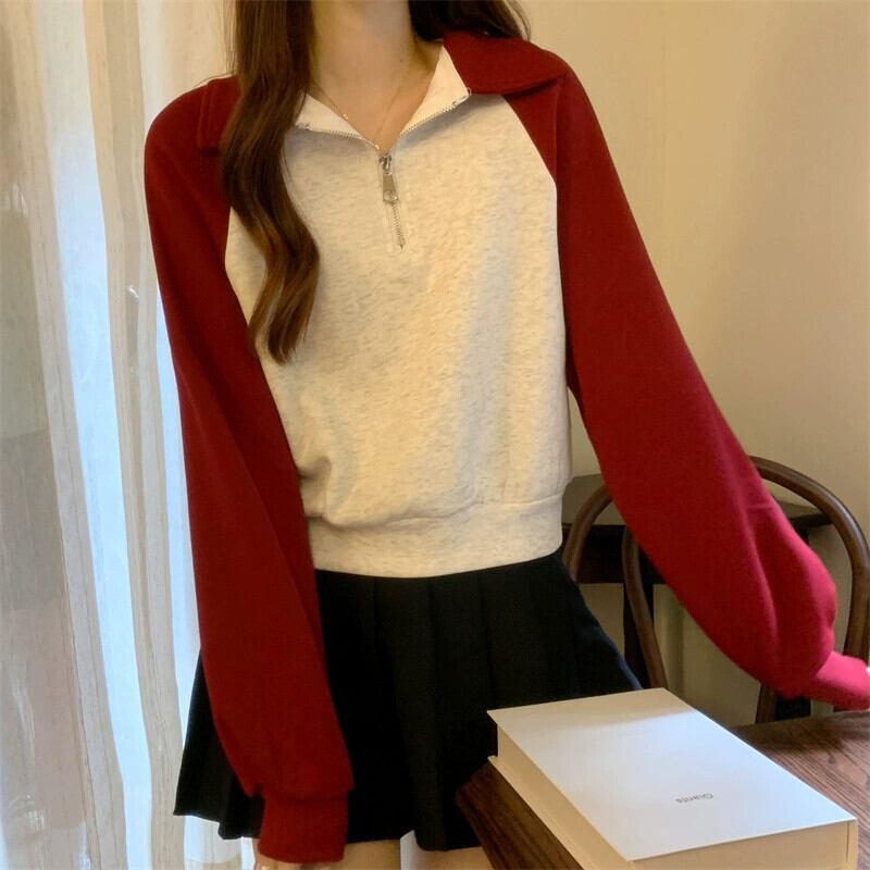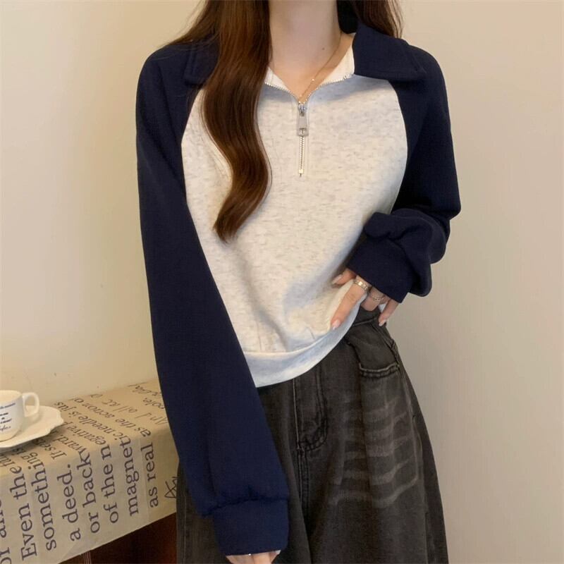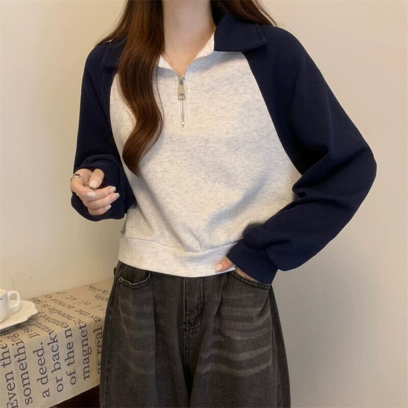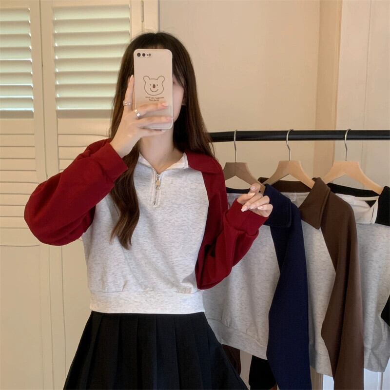 ポロカラーハーフジップスウェットシャツ女性春と秋アメリカンレトロ小さなルーズ多目的ラグランスリーブショートトップトレンディ スプリング 春物 オータム 秋物 7460095401060777 | framboise21