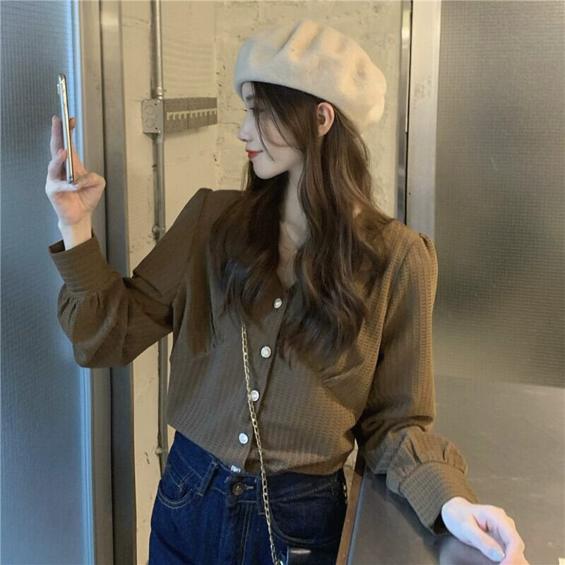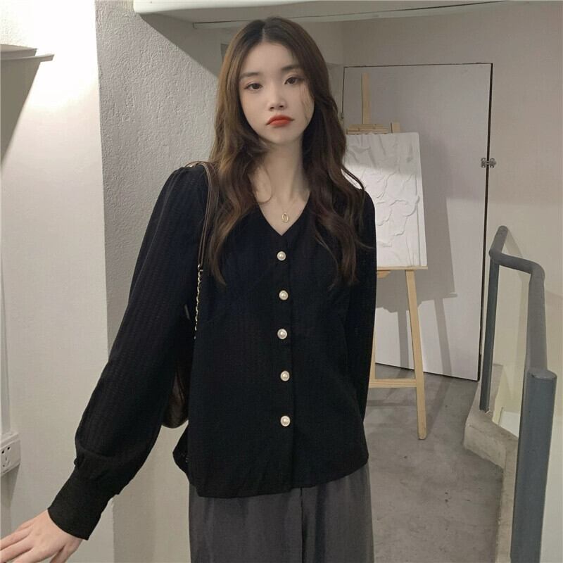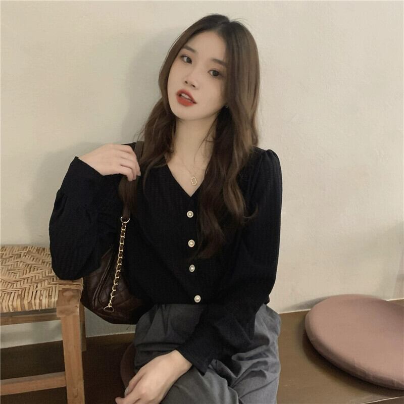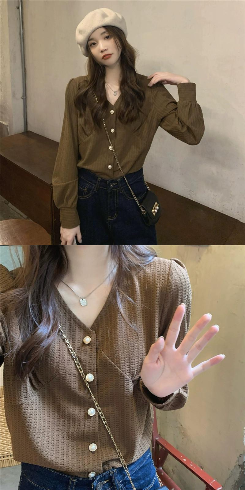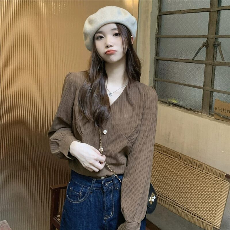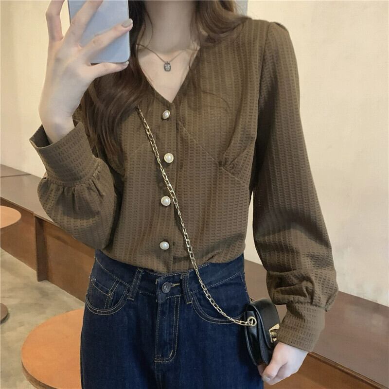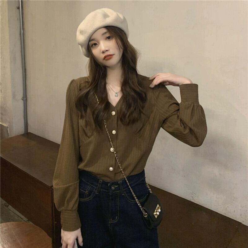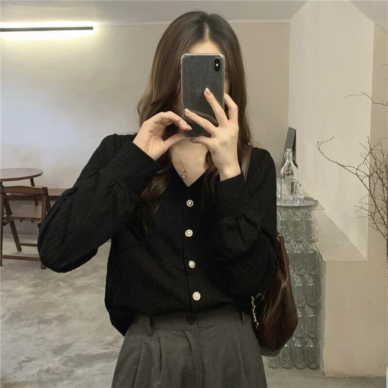 フレンチ V ネック長袖トップス 2023 秋の新デザインの女性、ゆったりとシック、痩身インナー カーディガン シャツ ロング オータム 秋物 Vネック 7460023758645199 | framboise21