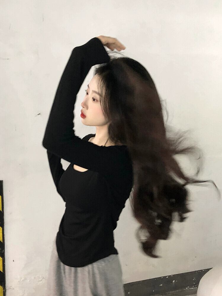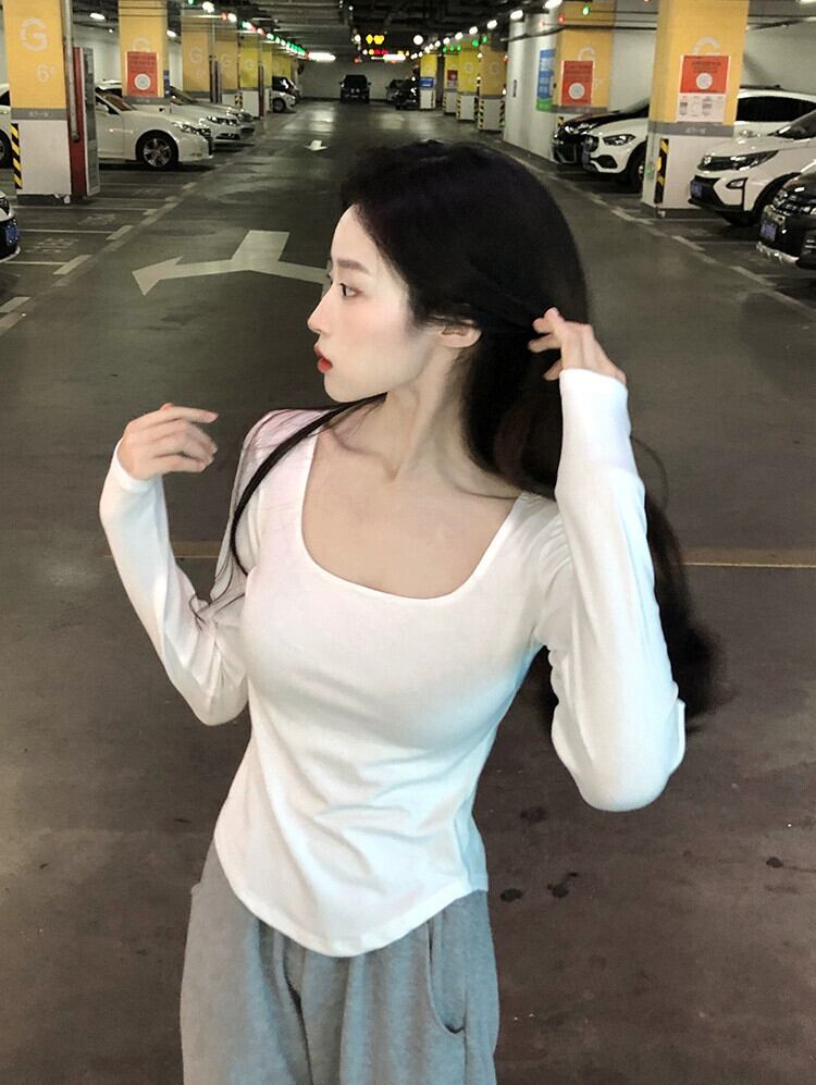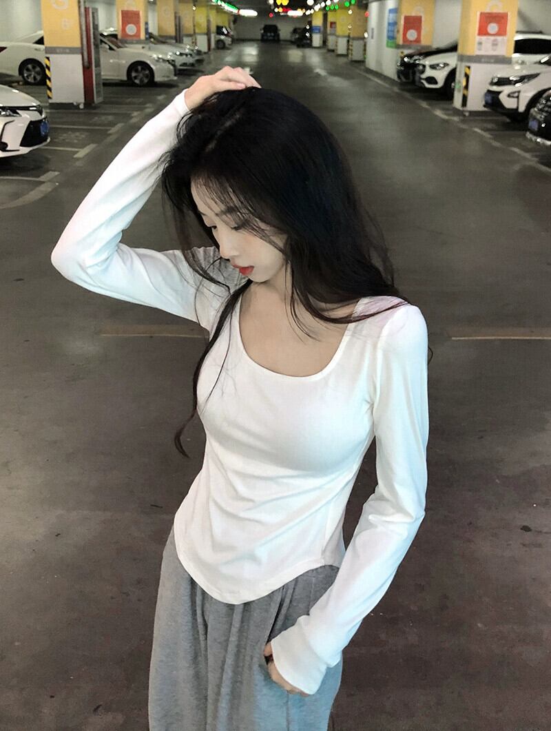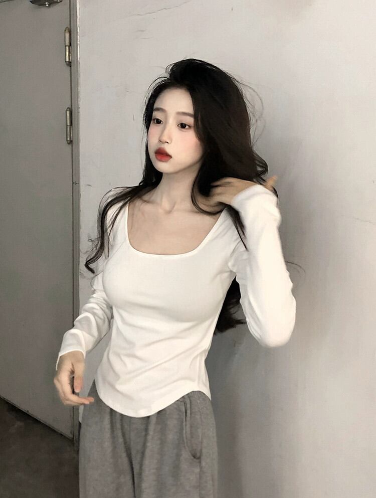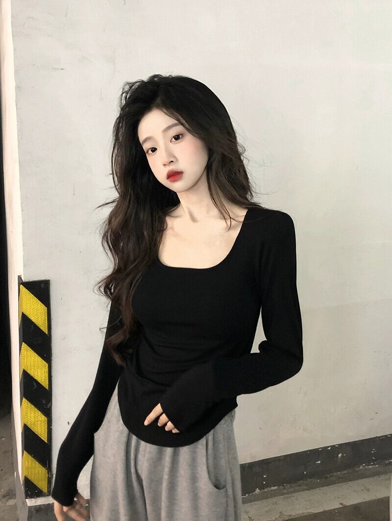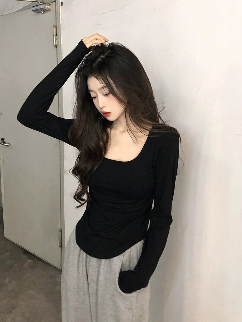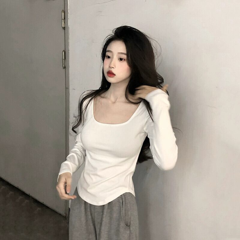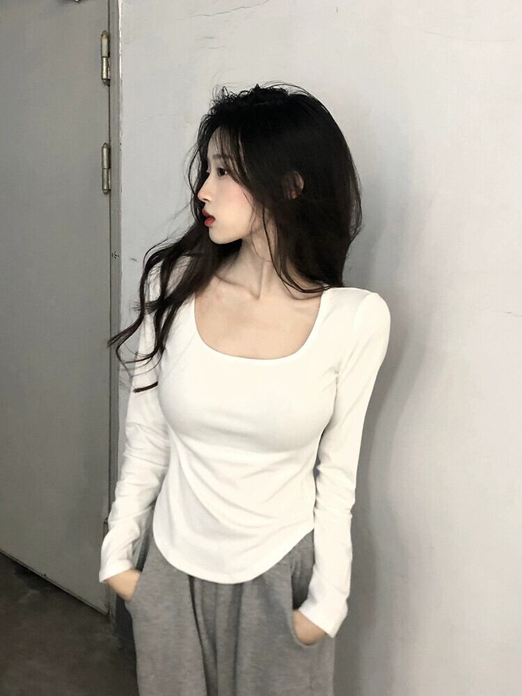 ローネックボトムシャツレディース、秋冬風インナー、イレギュラーショートトップス、デザイン入りスリムスクエアネック長袖Tシャツ ロング オータム 秋物 ウィンター 冬物 スクウェア 7460098575515564 | framboise21
