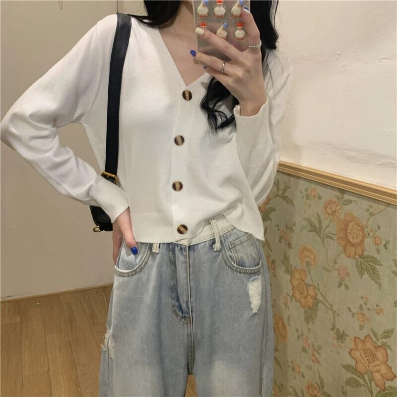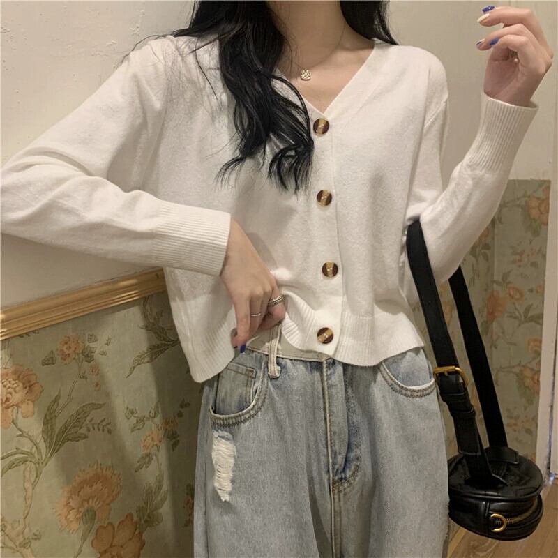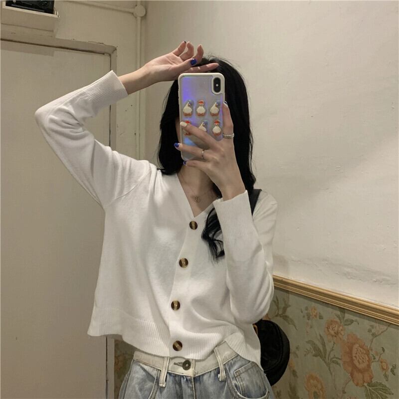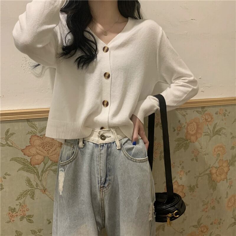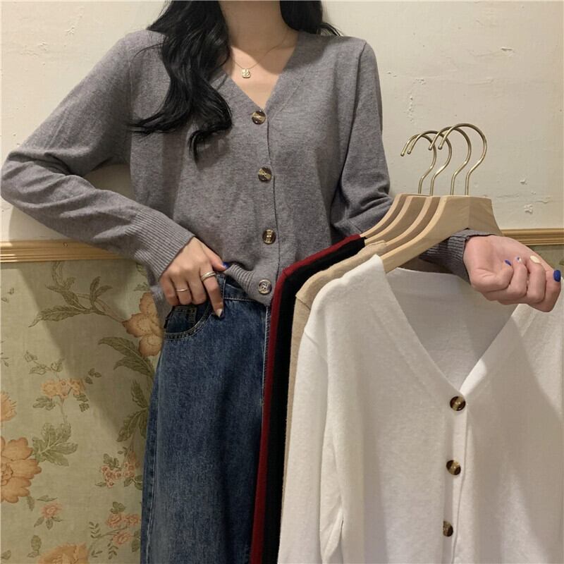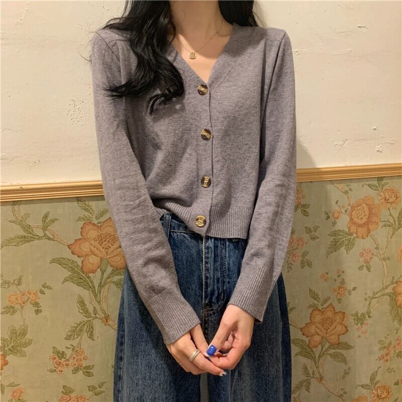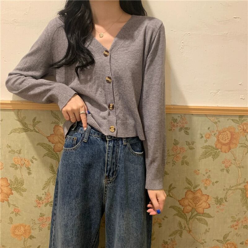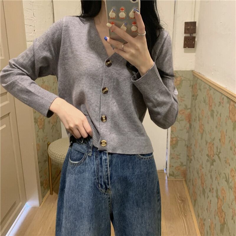 グレー V ネックニットカーディガン女性春と秋 202 新しいアウターセータールーズ痩身多目的ショート長袖トップ ロング スプリング 春物 オータム 秋物 Vネック 7460064817039031 | framboise21
