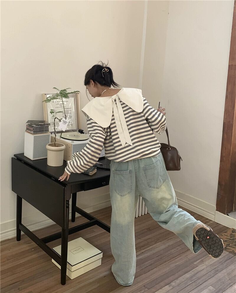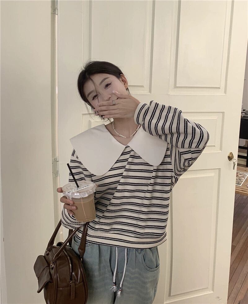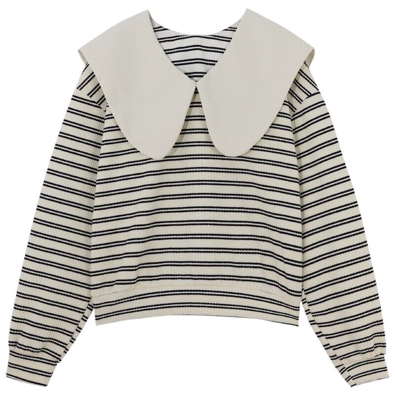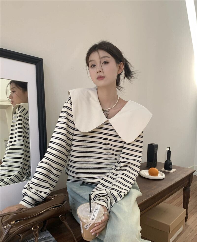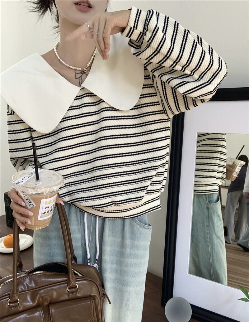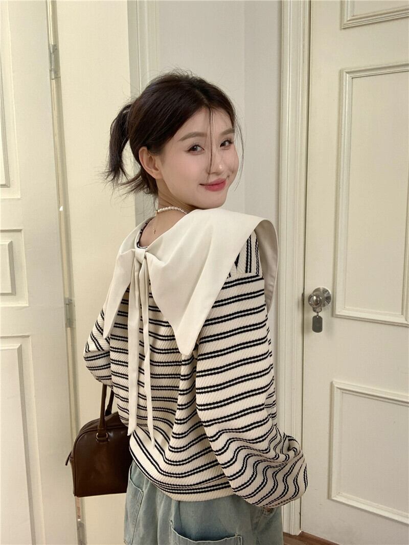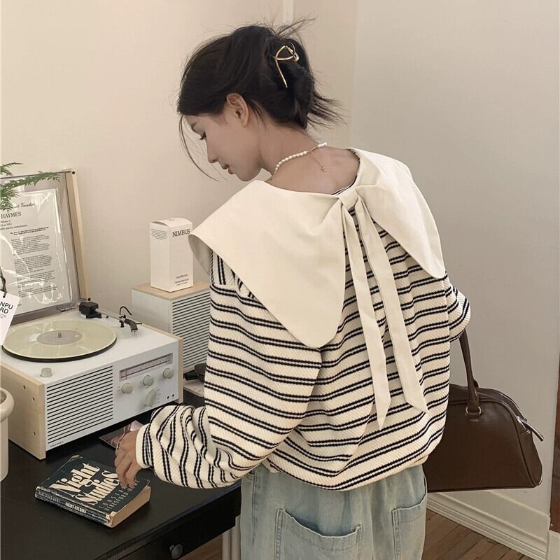 弓人形の襟のストライプのスウェットシャツの女性、春と秋のデザイン、ルーズで怠惰なスタイル、ショートプルオーバー長袖トップ ロング スプリング 春物 オータム 秋物 7460040793884891 | framboise21