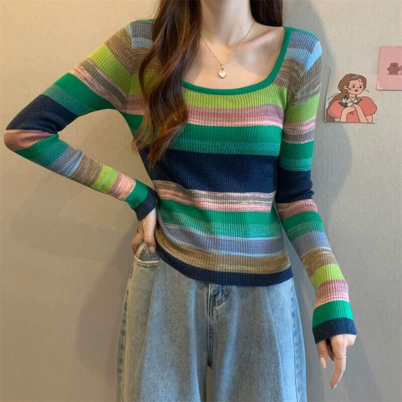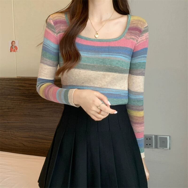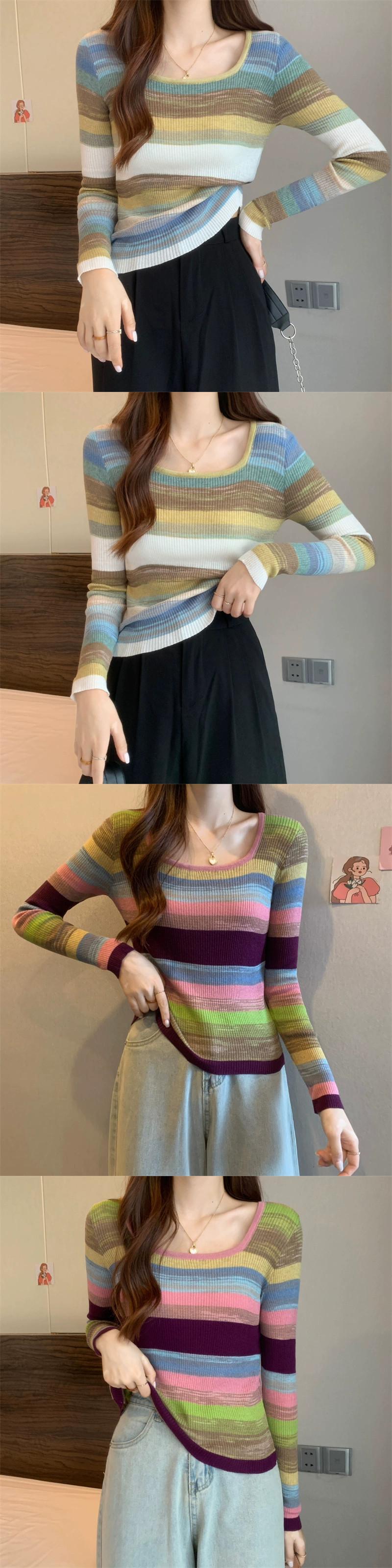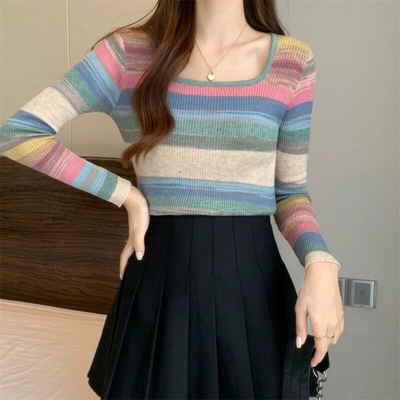 秋冬のコントラストカラーのレインボーストライプのボトムシャツ、ウエスタンスタイルのスリムフィットショートセーター、スクエアネックの長袖ニットトップ ロング オータム 秋物 ウィンター 冬物 スクウェア 7460061911330510 | framboise21