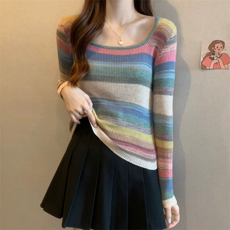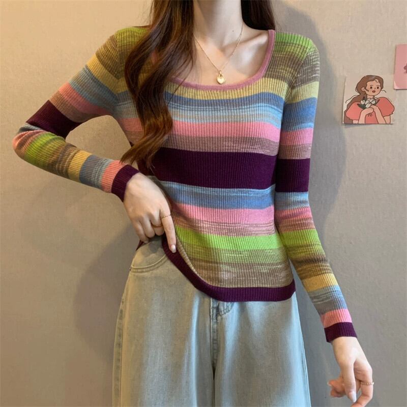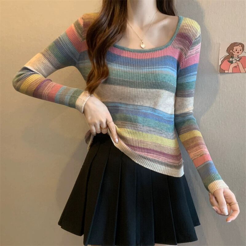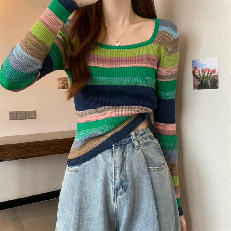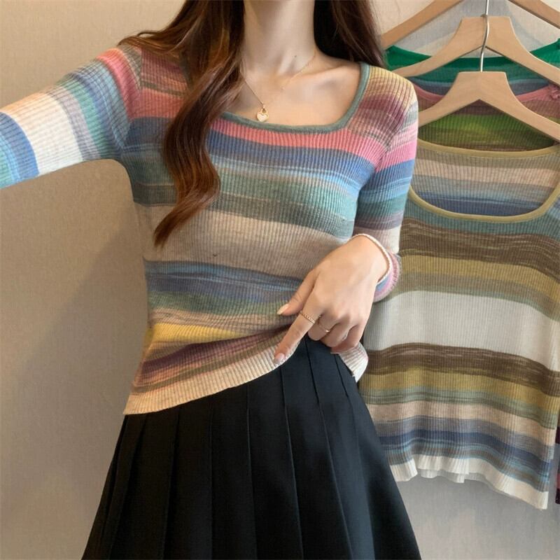 秋冬のコントラストカラーのレインボーストライプのボトムシャツ、ウエスタンスタイルのスリムフィットショートセーター、スクエアネックの長袖ニットトップ ロング オータム 秋物 ウィンター 冬物 スクウェア 7460061911330510 | framboise21
