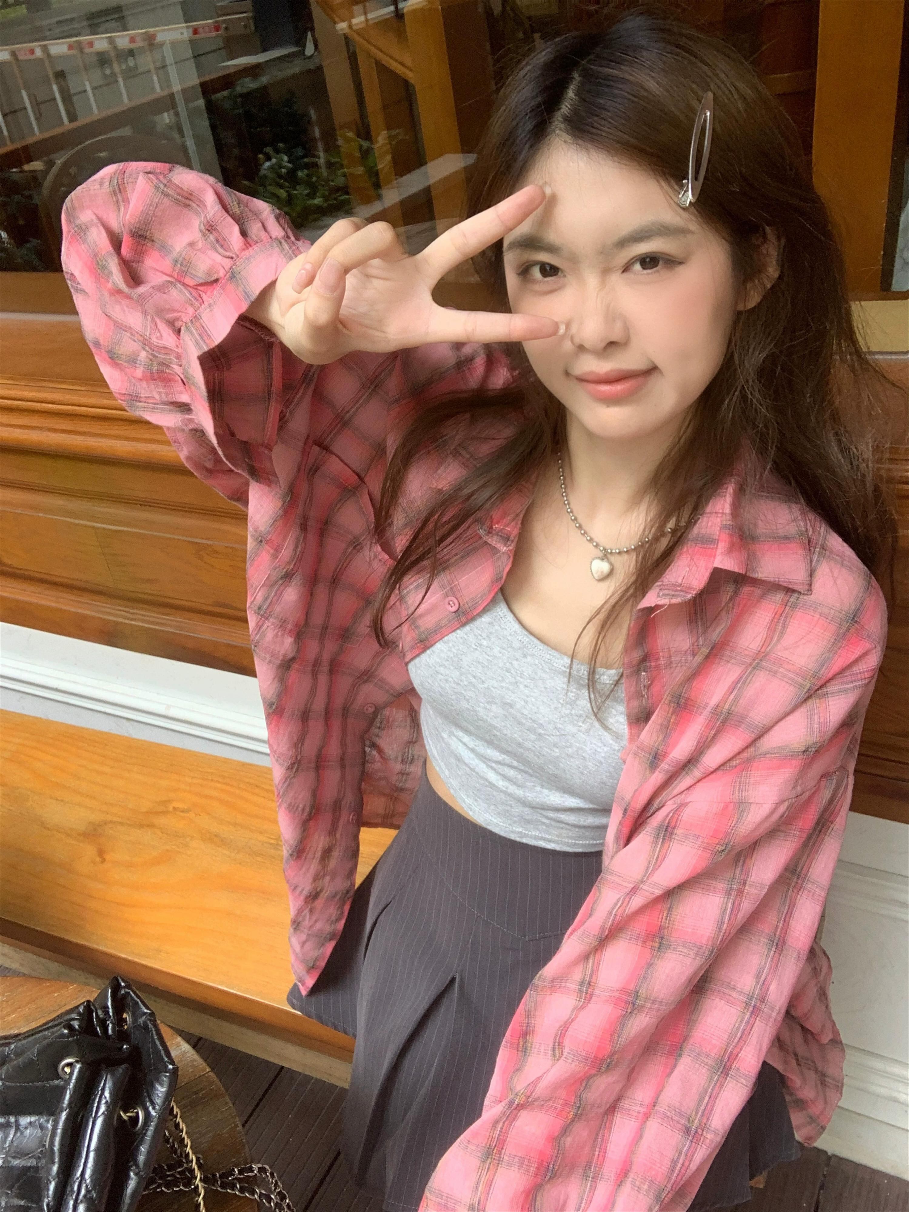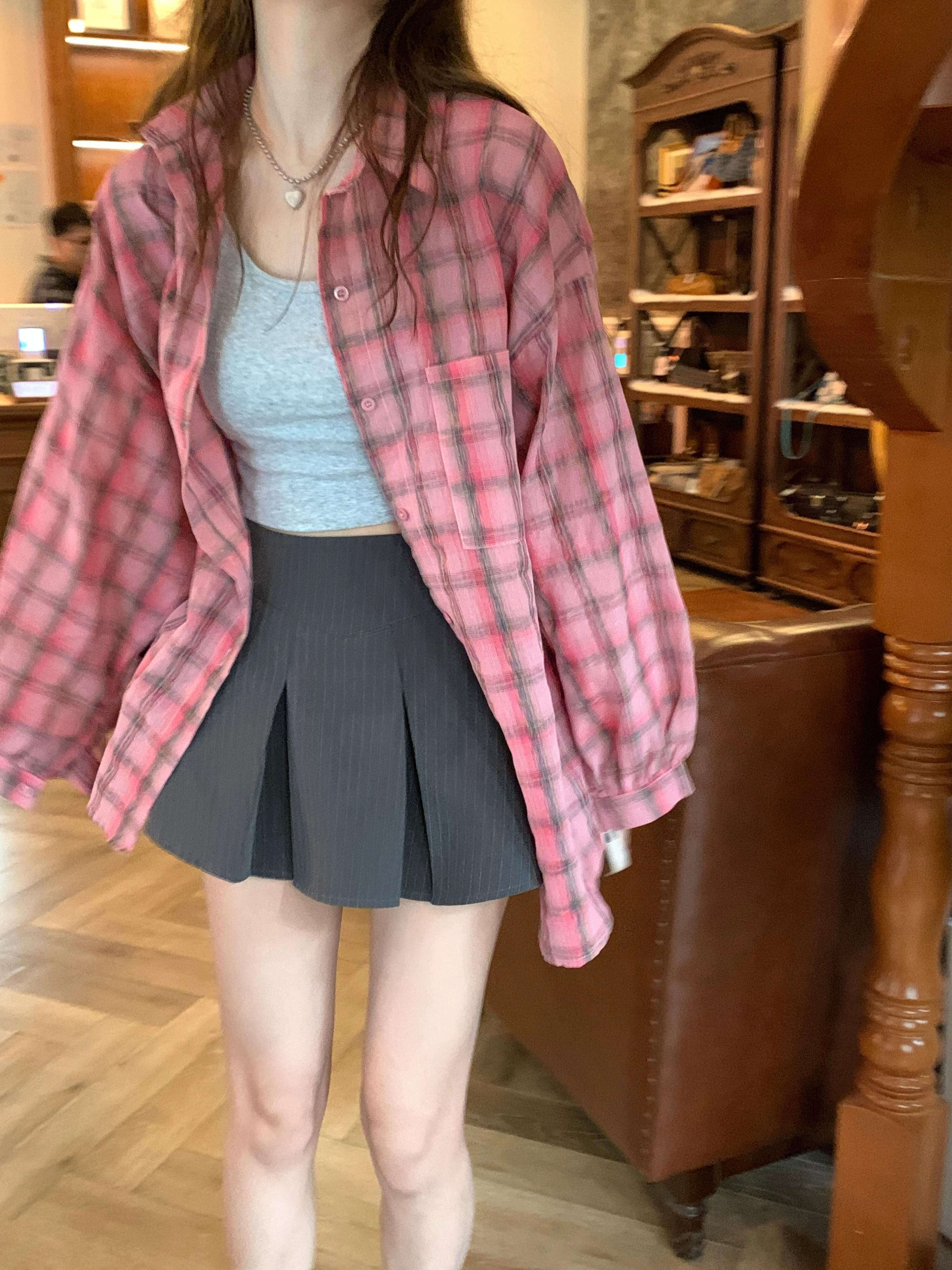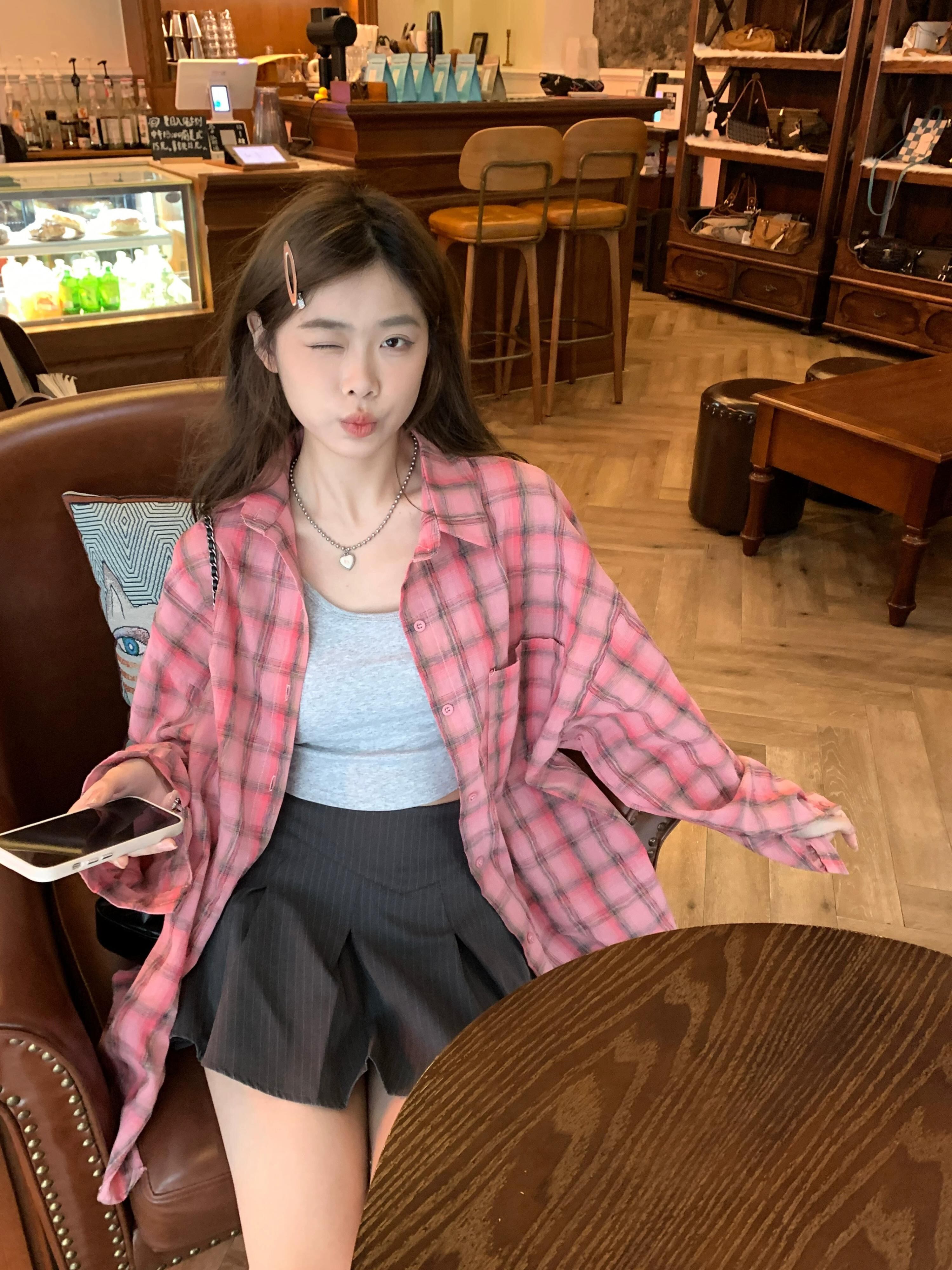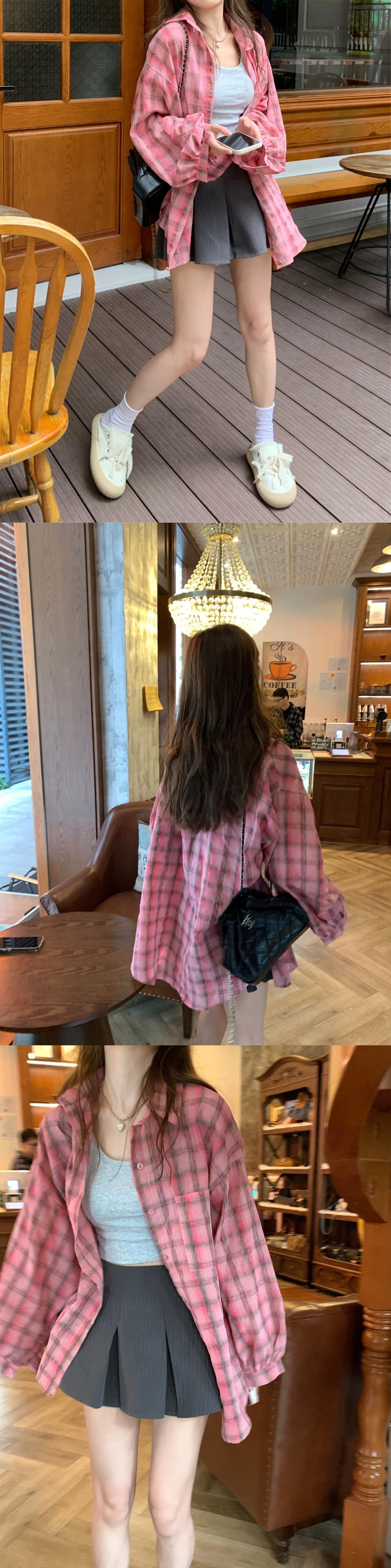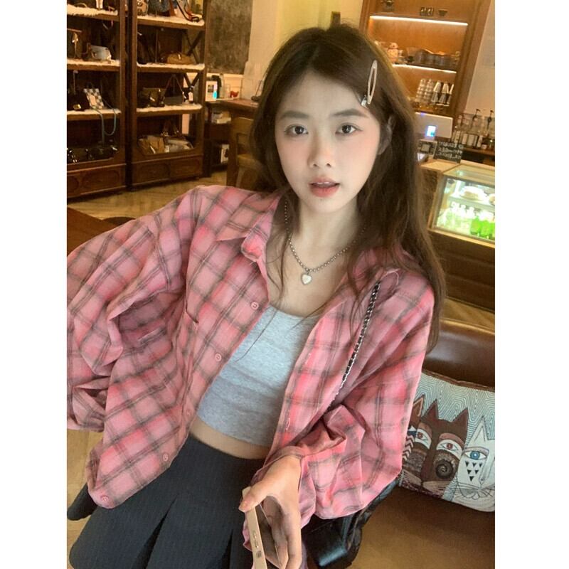 ミッドレングスのピンクの格子縞のシャツジャケットの女性、春と秋のスタイル、怠惰なデザイン、ゆったりとしたカジュアルな長袖シャツ、トレンディな ロング スプリング 春物 オータム 秋物 7460025443327872 | framboise21