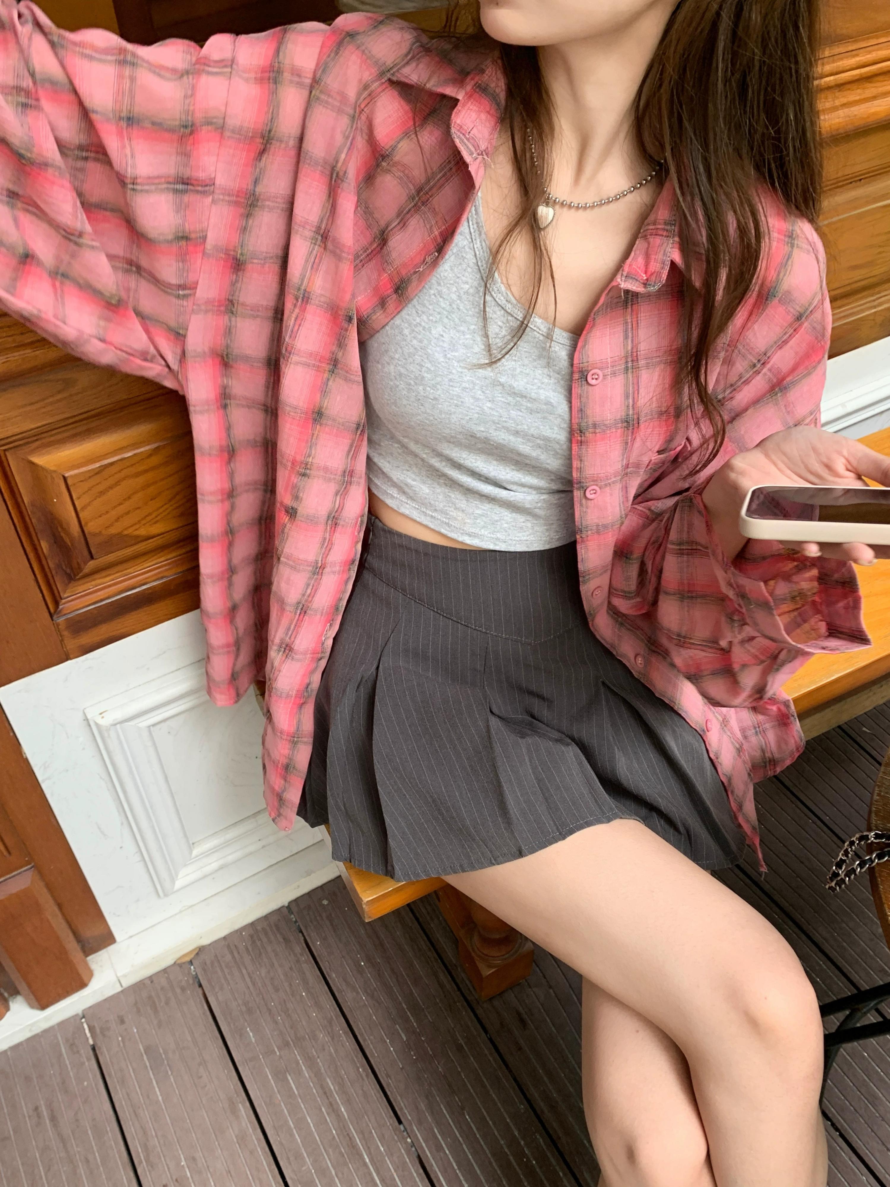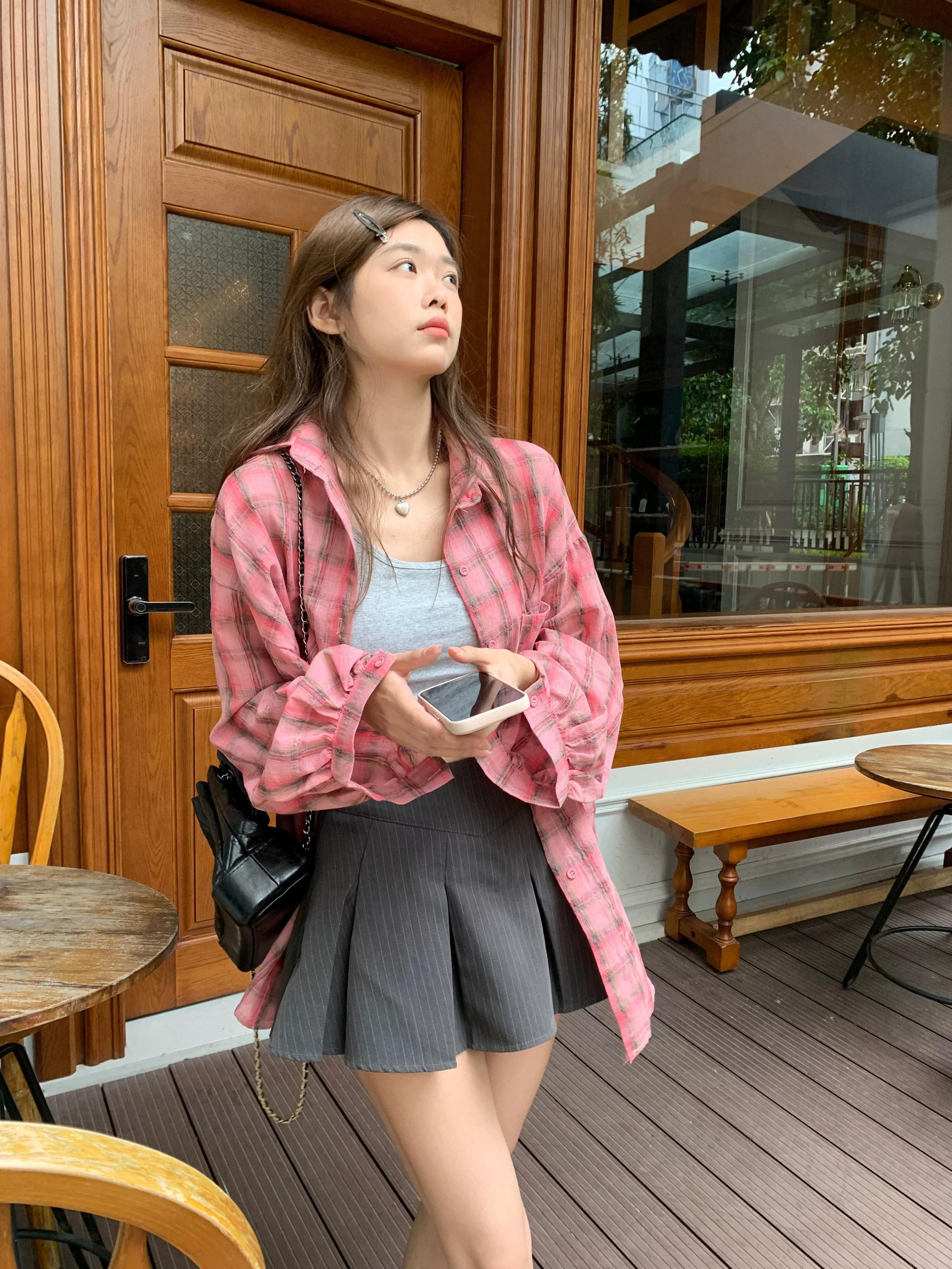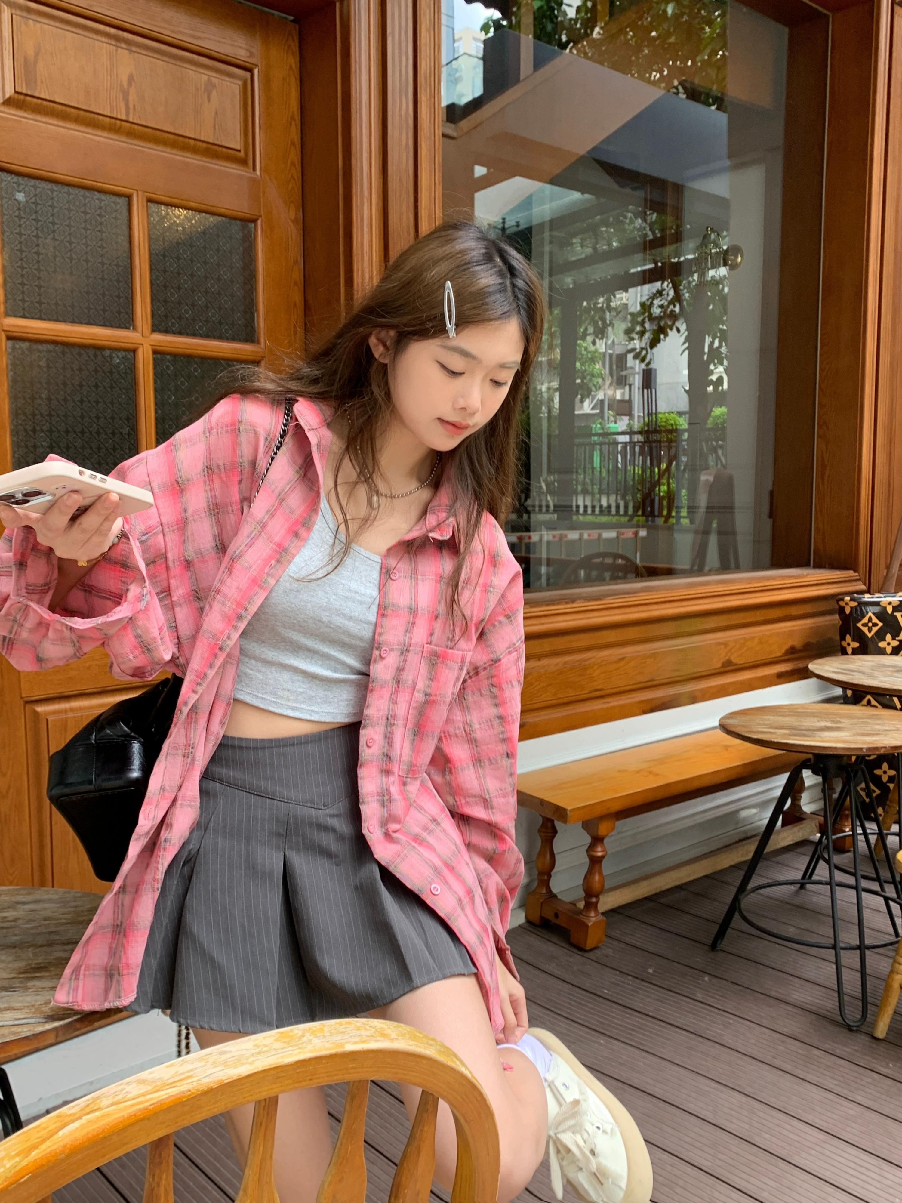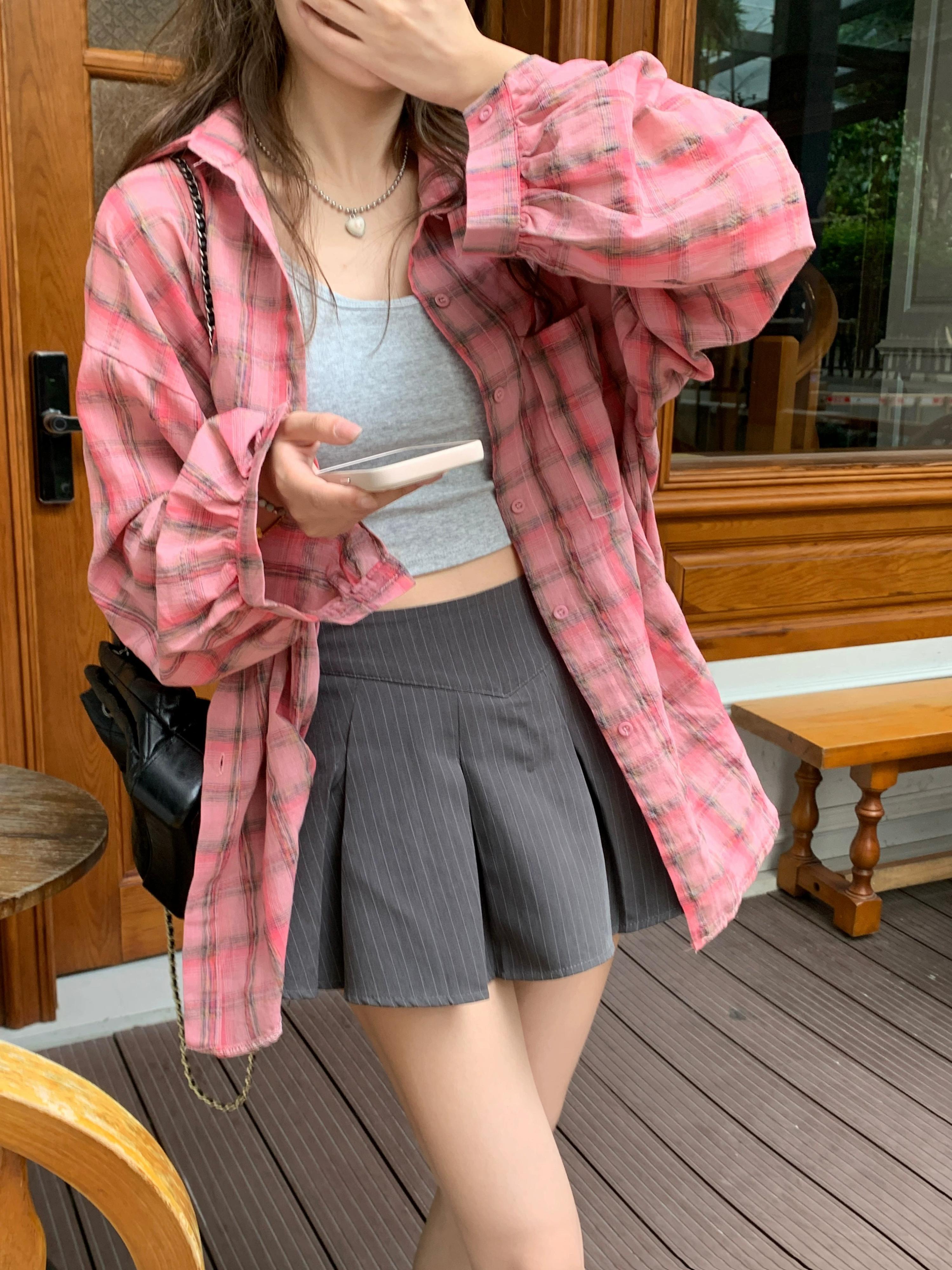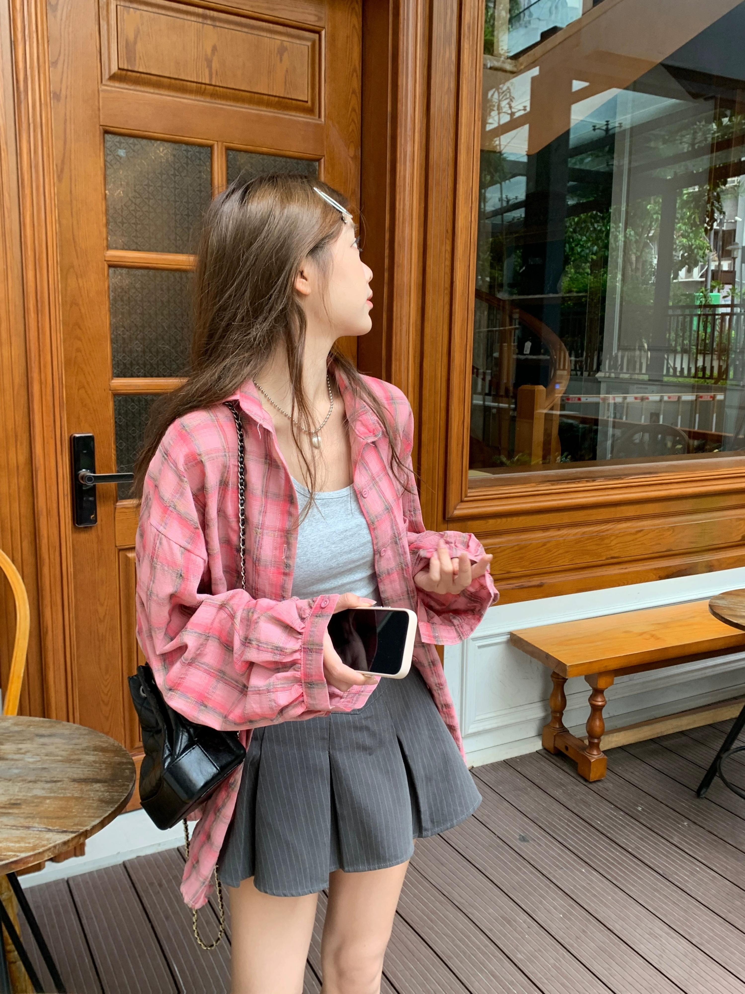 ミッドレングスのピンクの格子縞のシャツジャケットの女性、春と秋のスタイル、怠惰なデザイン、ゆったりとしたカジュアルな長袖シャツ、トレンディな ロング スプリング 春物 オータム 秋物 7460025443327872 | framboise21
