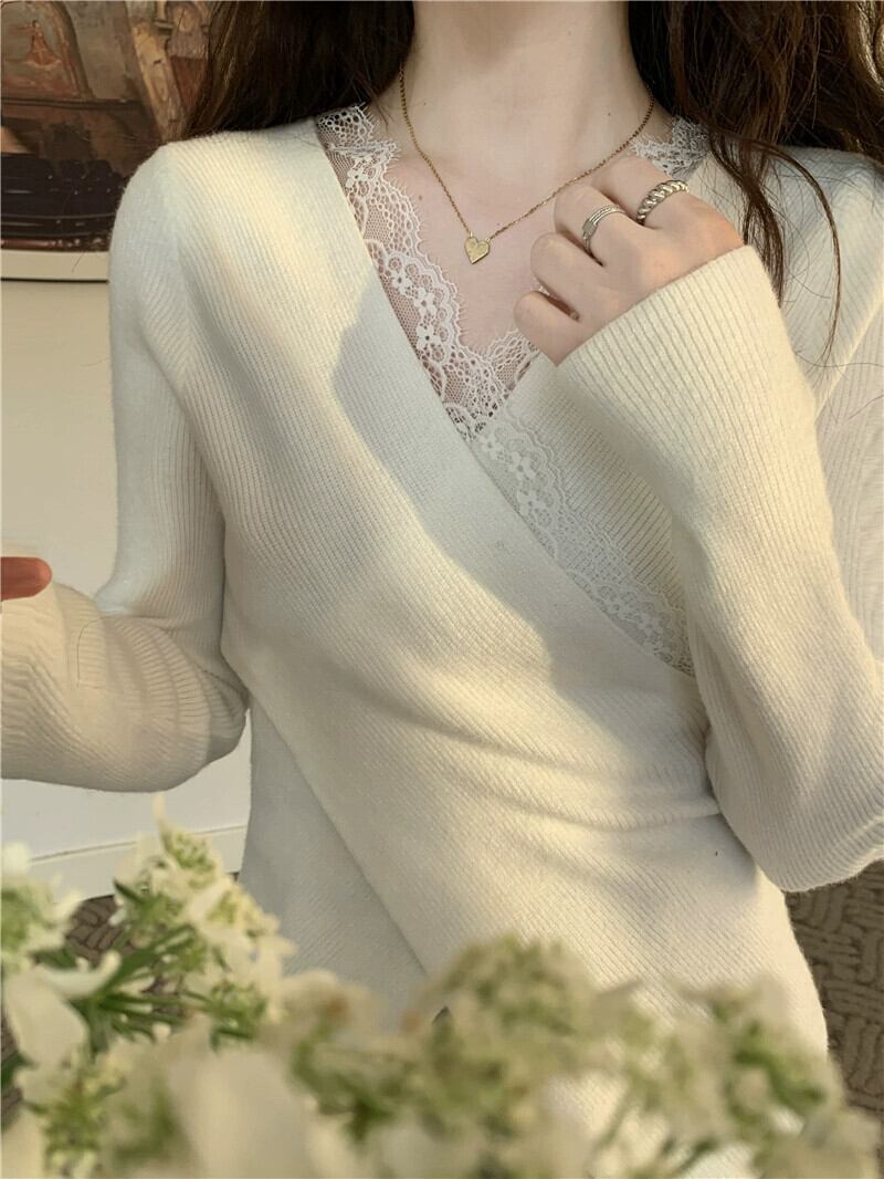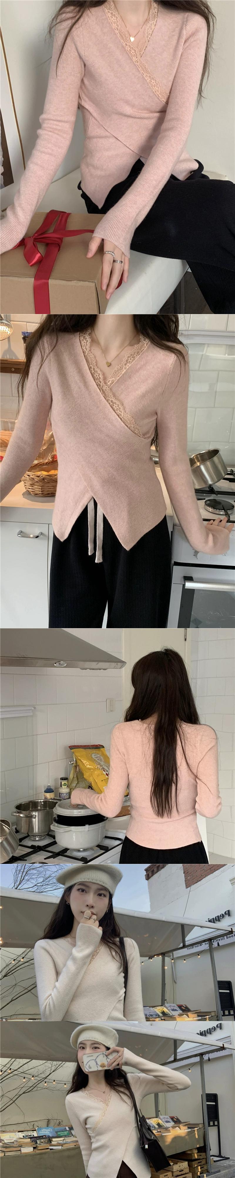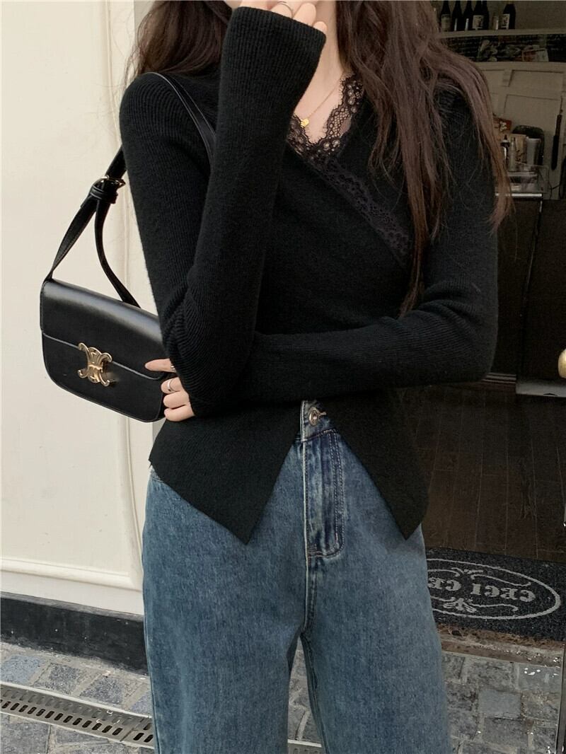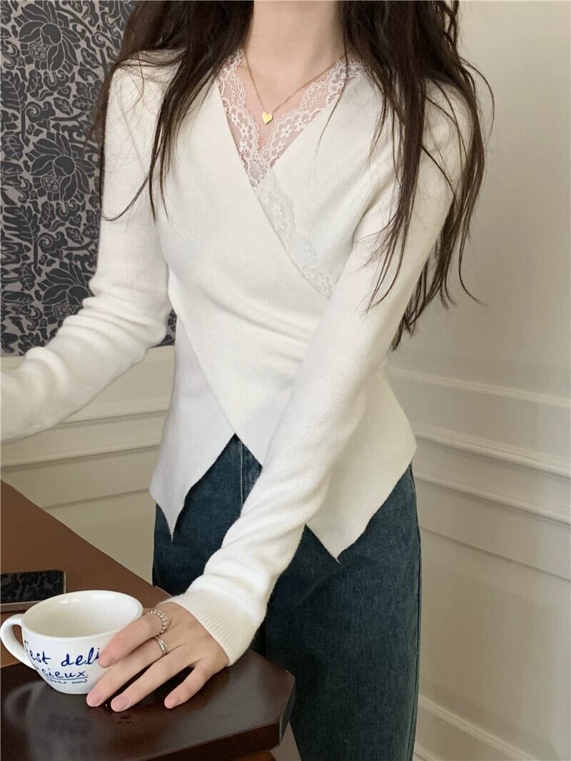 不規則なクロスショートニットボトリングシャツ女性の秋と冬のフレンチデザインのスリムフィットインナー長袖Vネックセーター ロング オータム 秋物 ウィンター 冬物 7460055607466828 | framboise21