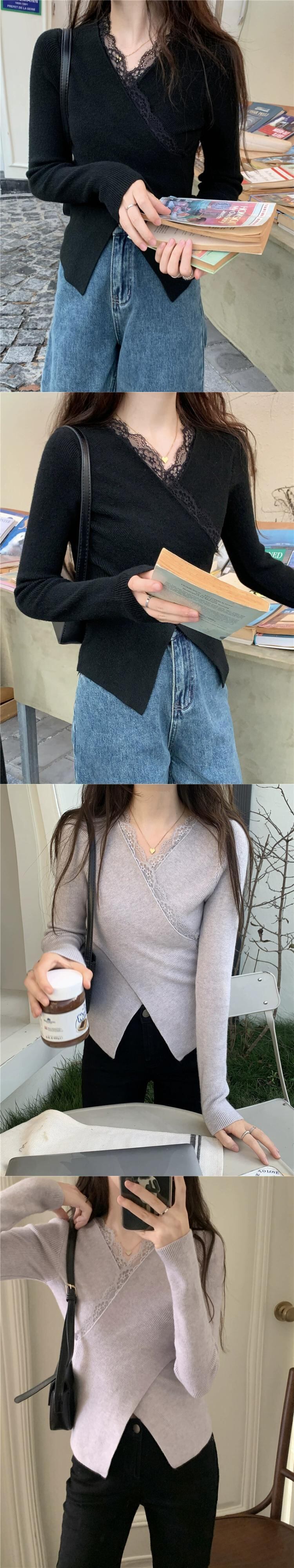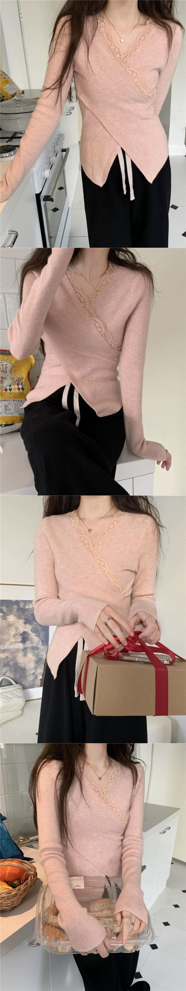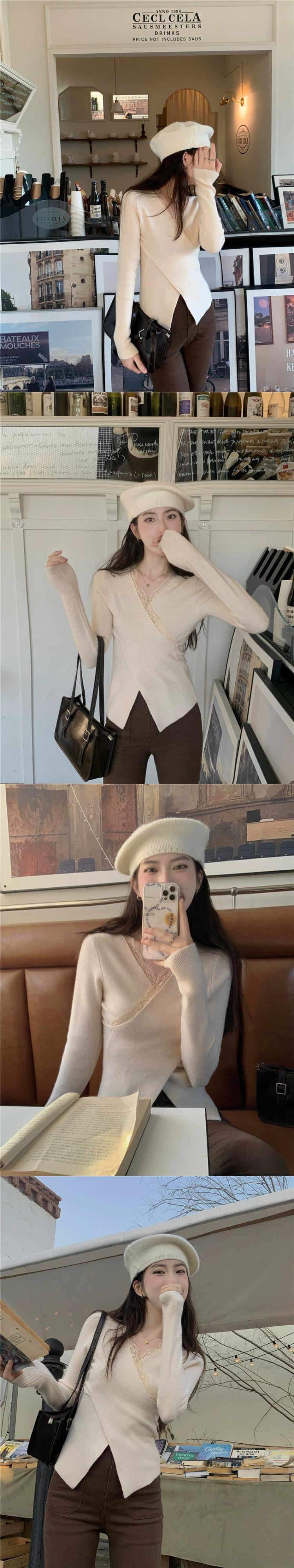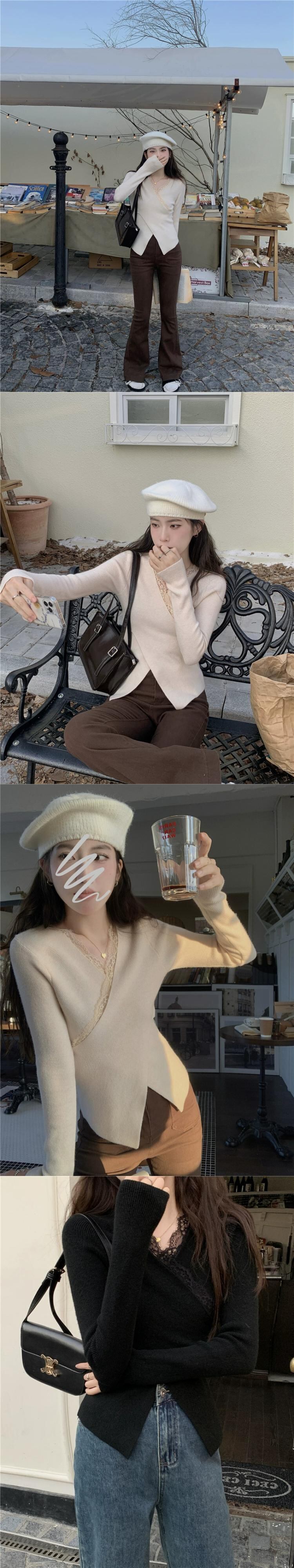 不規則なクロスショートニットボトリングシャツ女性の秋と冬のフレンチデザインのスリムフィットインナー長袖Vネックセーター ロング オータム 秋物 ウィンター 冬物 7460055607466828 | framboise21