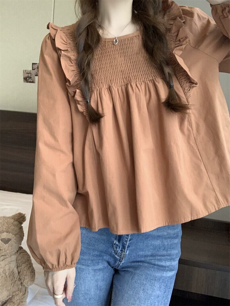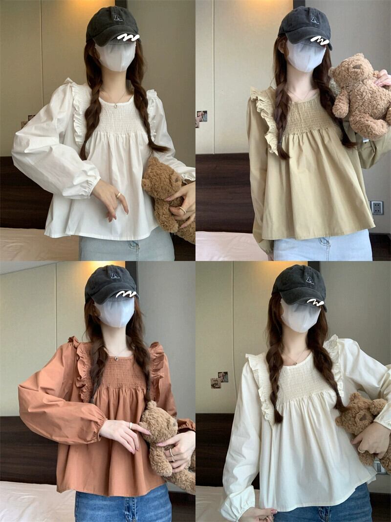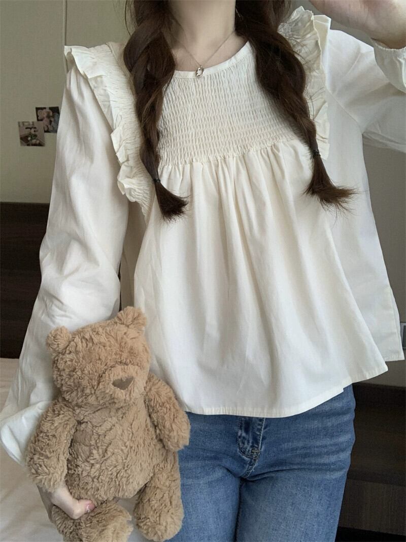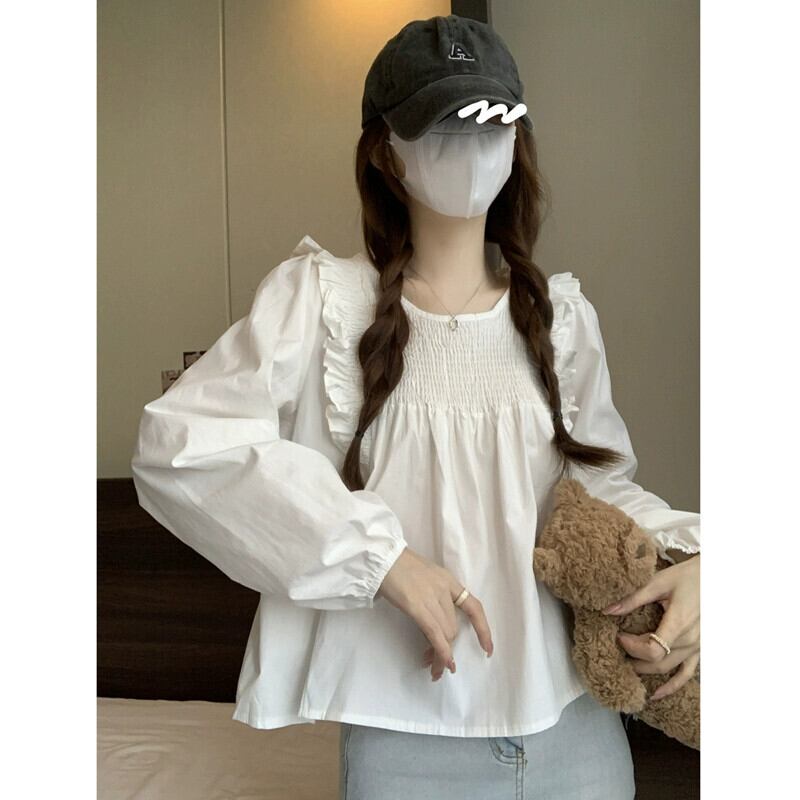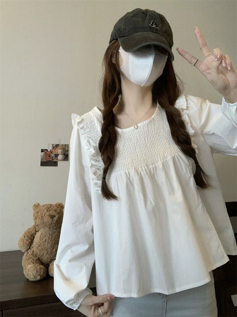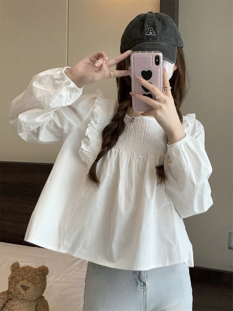 キノコエッジのベビードールトップ女性、春と秋のフランスのファッションデザイン、シックなルーズな白い長袖シャツ ロング ホワイト スプリング 春物 オータム 秋物 7460073895720191 | framboise21