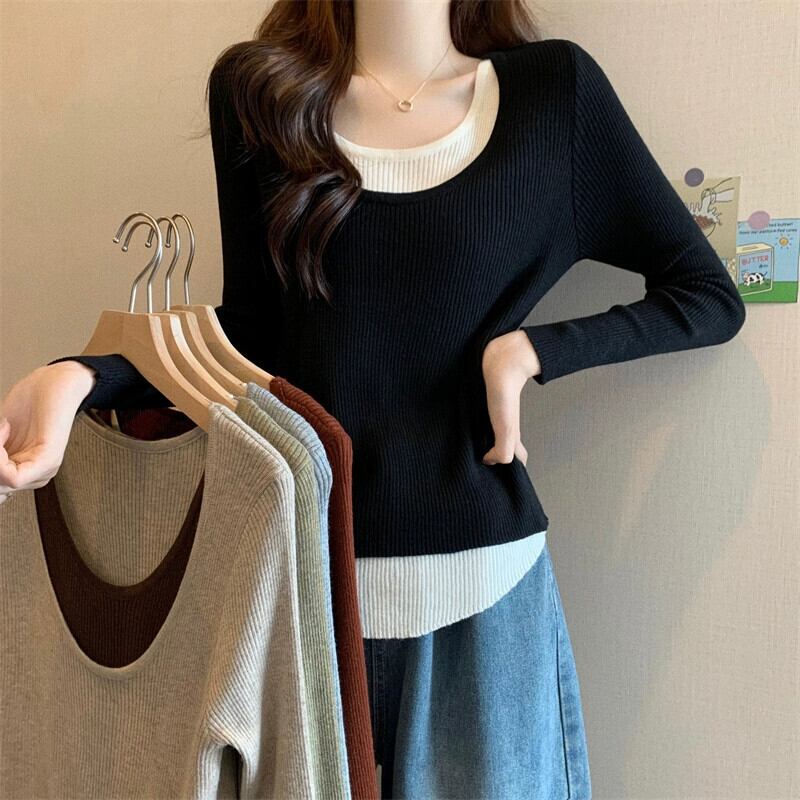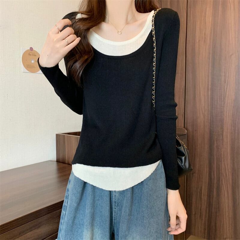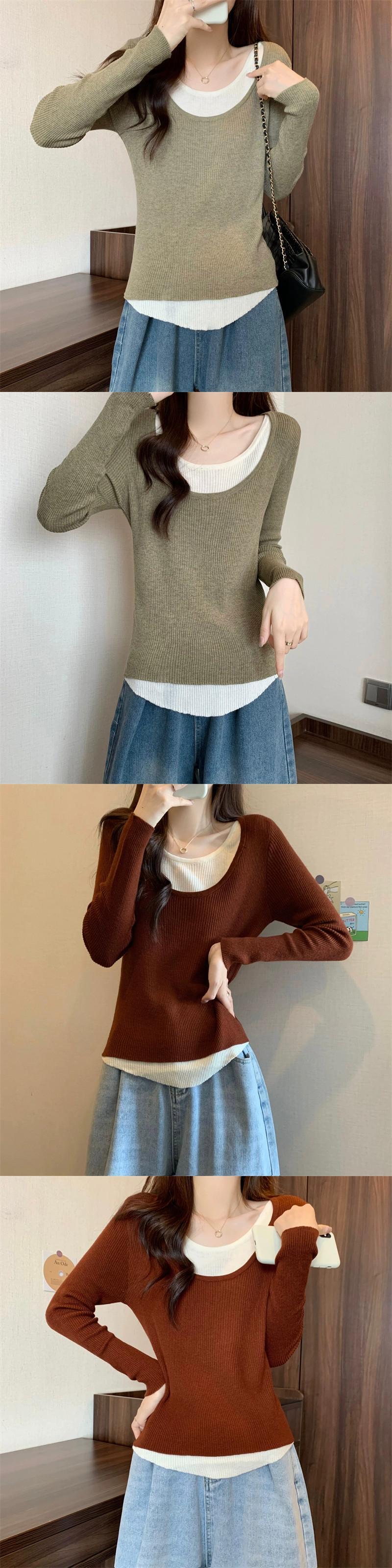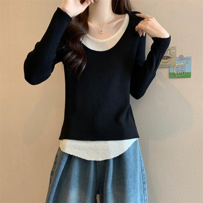 ステッチフェイクツーピースボトリングシャツレディース、秋冬スタイル、イレギュラーヘムのスリムフィットインナー、長袖ニットトップ ロング オータム 秋物 ウィンター 冬物 7460011032060578 | framboise21