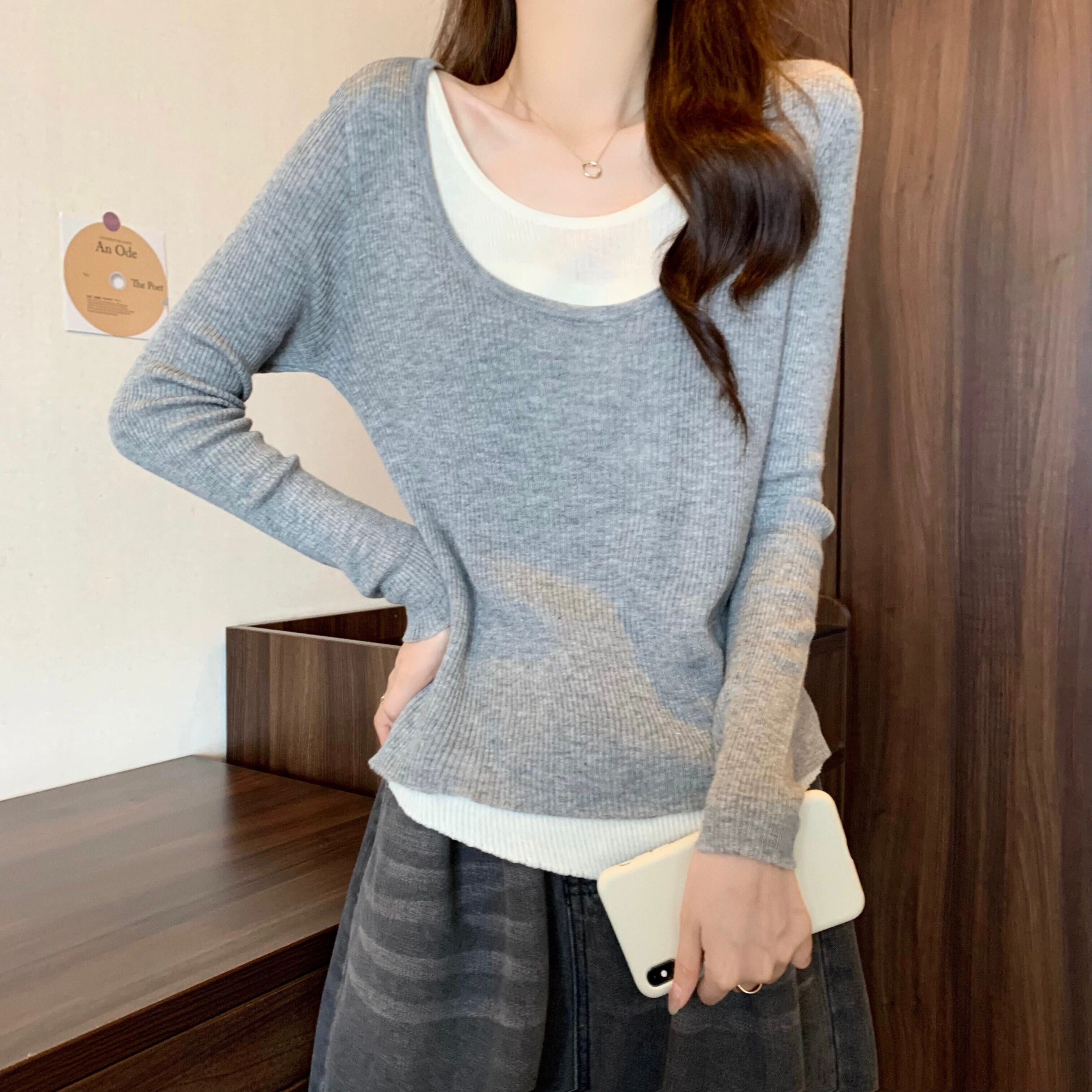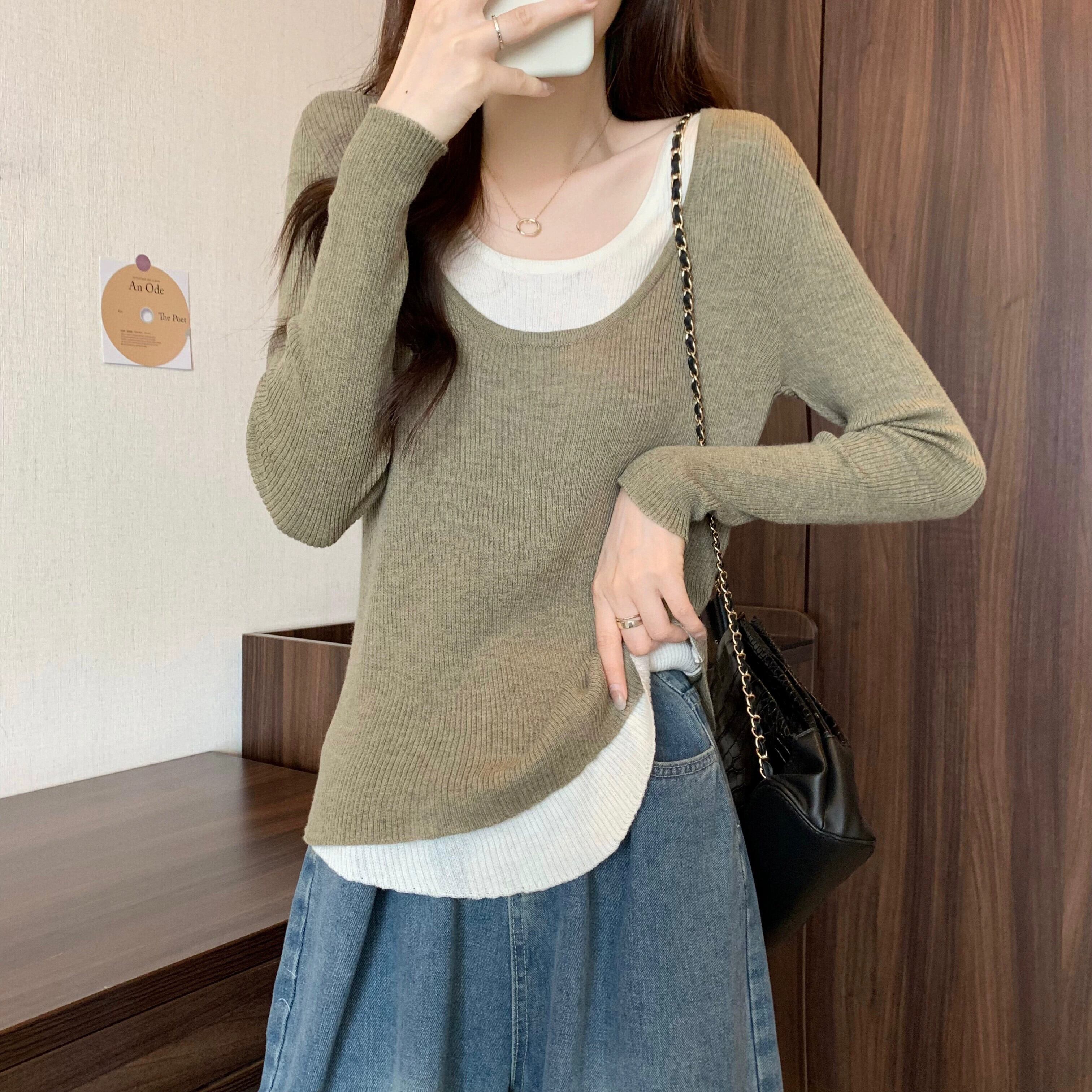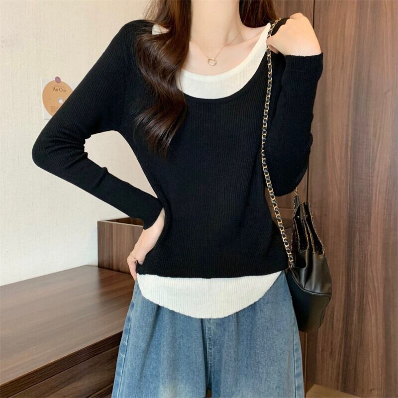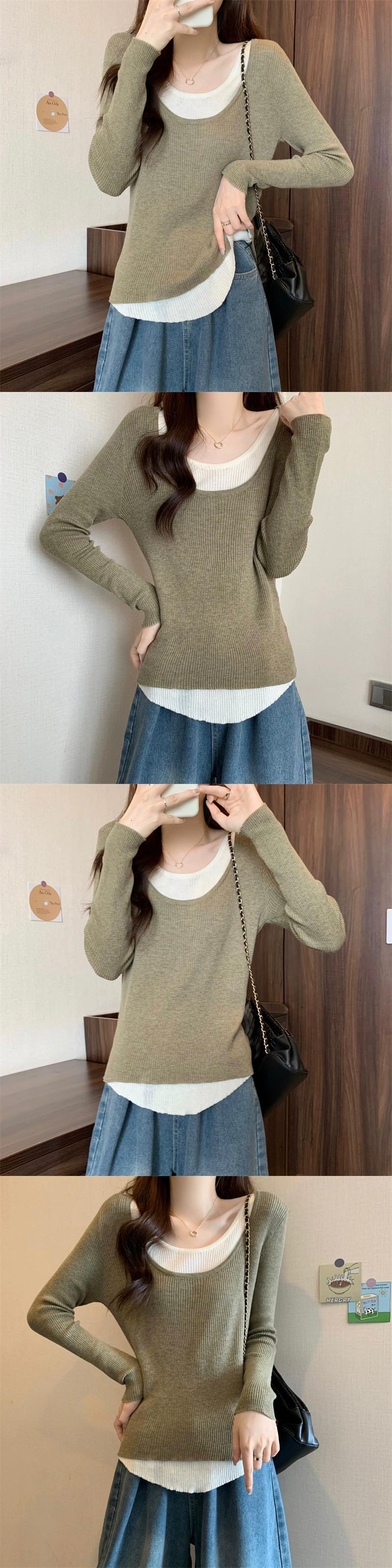 ステッチフェイクツーピースボトリングシャツレディース、秋冬スタイル、イレギュラーヘムのスリムフィットインナー、長袖ニットトップ ロング オータム 秋物 ウィンター 冬物 7460011032060578 | framboise21