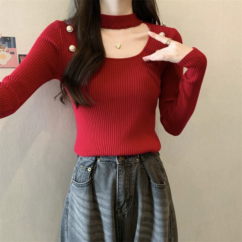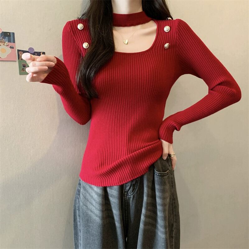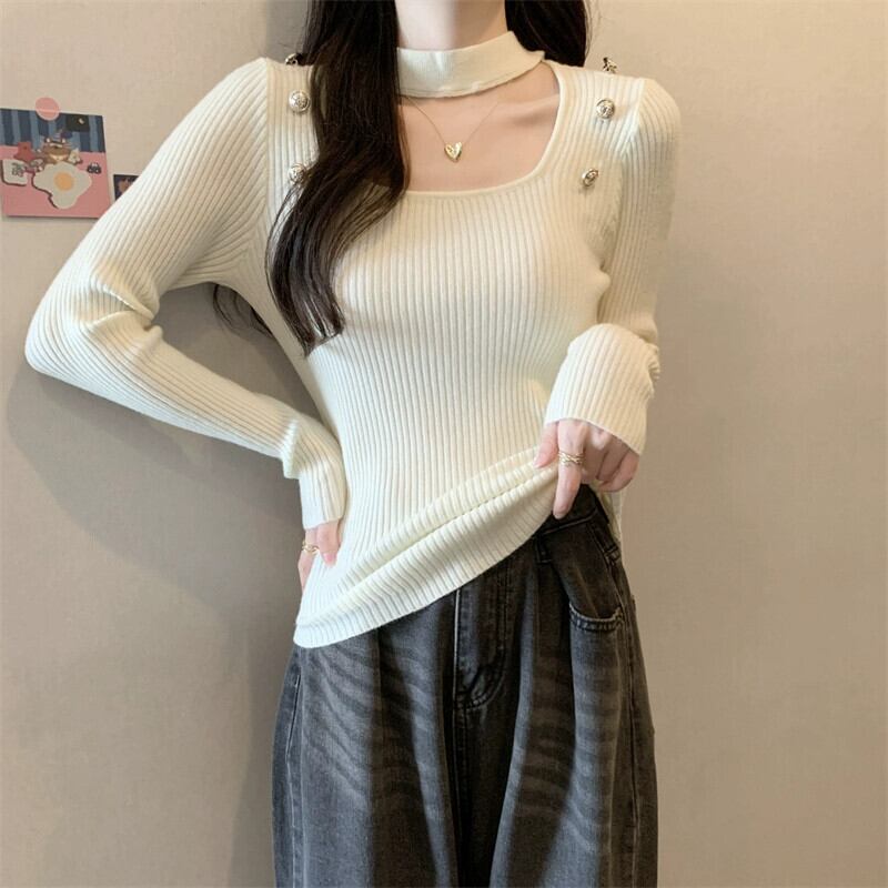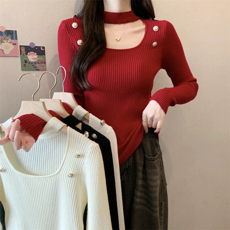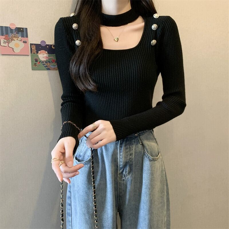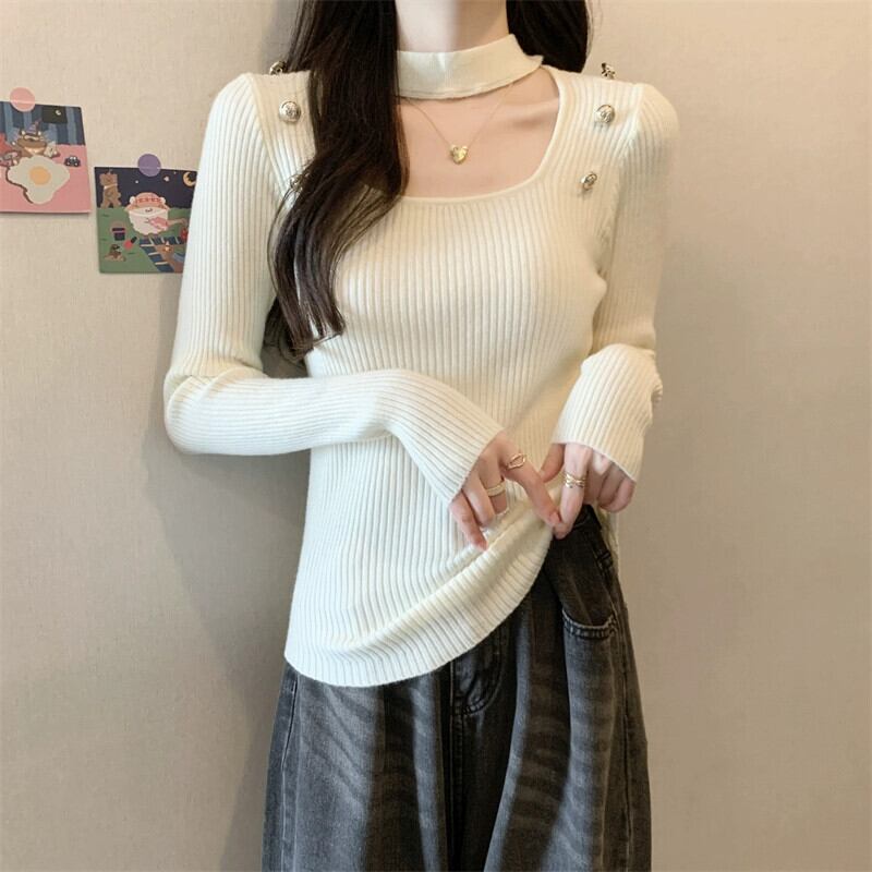 秋と冬のホルターネックハーフタートルネックボトリングシャツ女性、ハイエンド、ファッショナブルでスリムフィット、中空スクエアネック長袖ニットセーター ロング オータム 秋物 ウィンター 冬物 スクウェア 7460098548451417 | framboise21