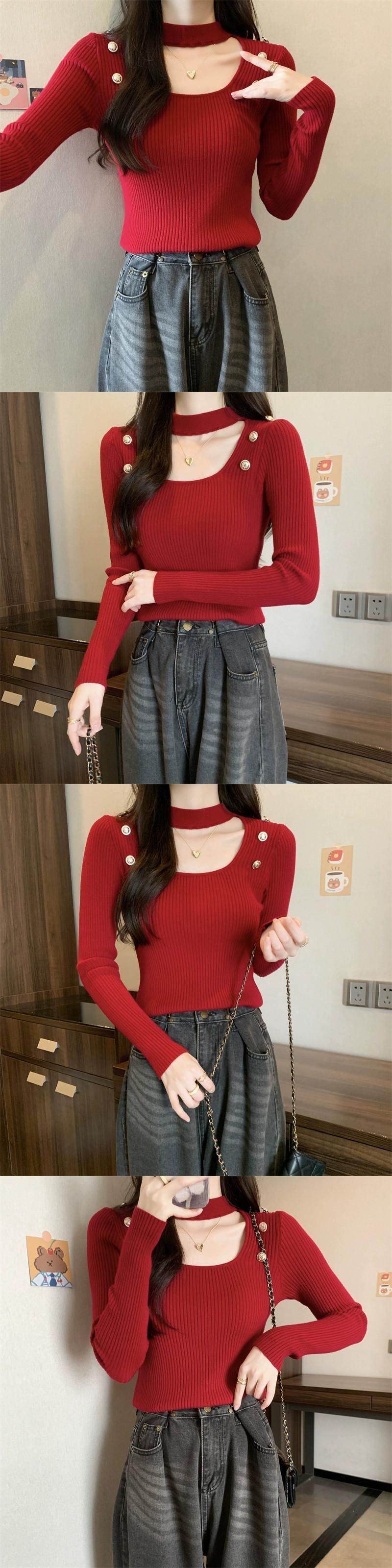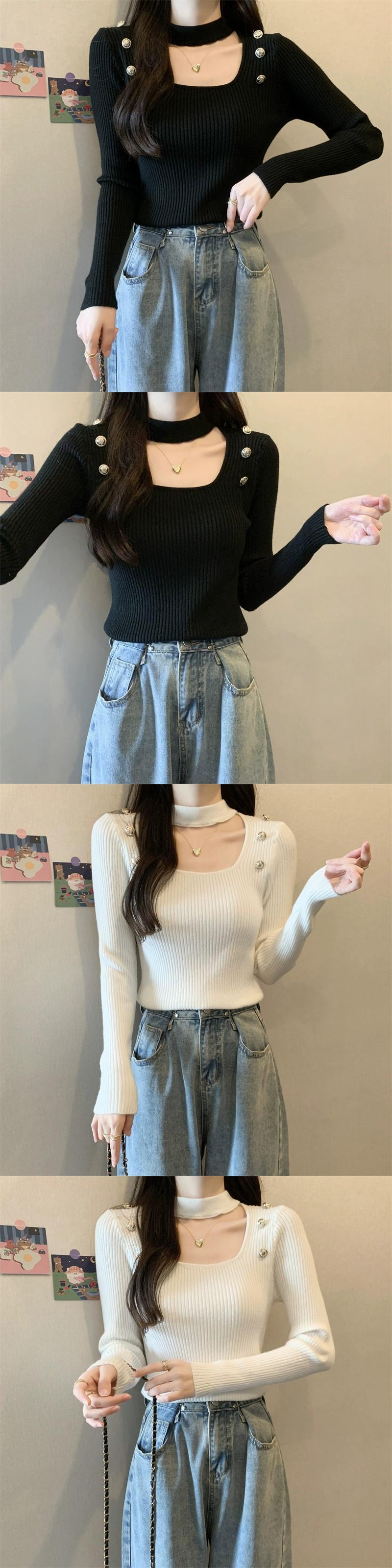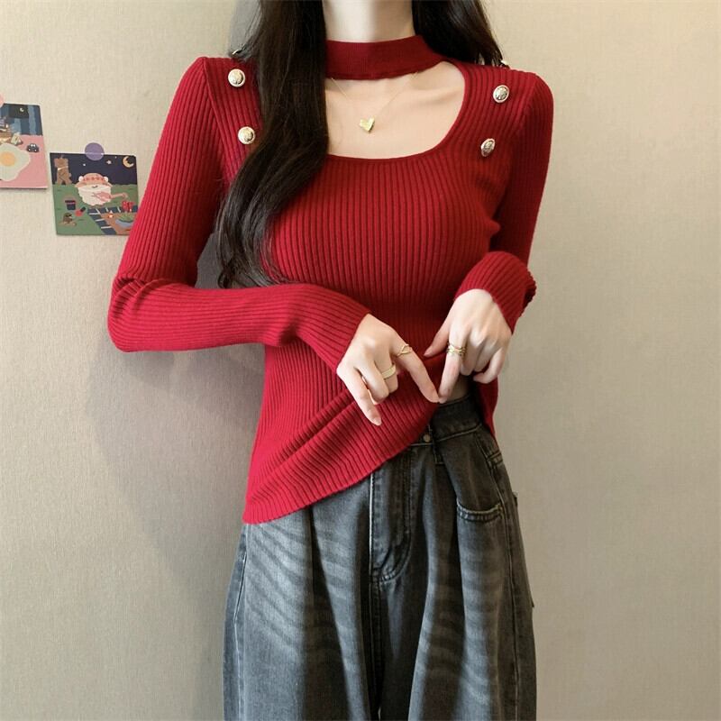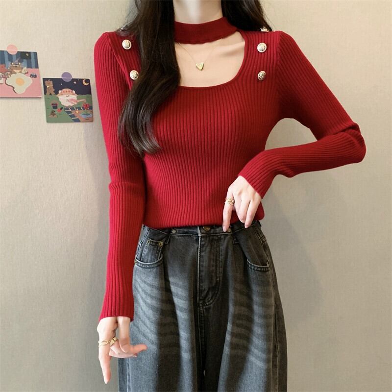 秋と冬のホルターネックハーフタートルネックボトリングシャツ女性、ハイエンド、ファッショナブルでスリムフィット、中空スクエアネック長袖ニットセーター ロング オータム 秋物 ウィンター 冬物 スクウェア 7460098548451417 | framboise21