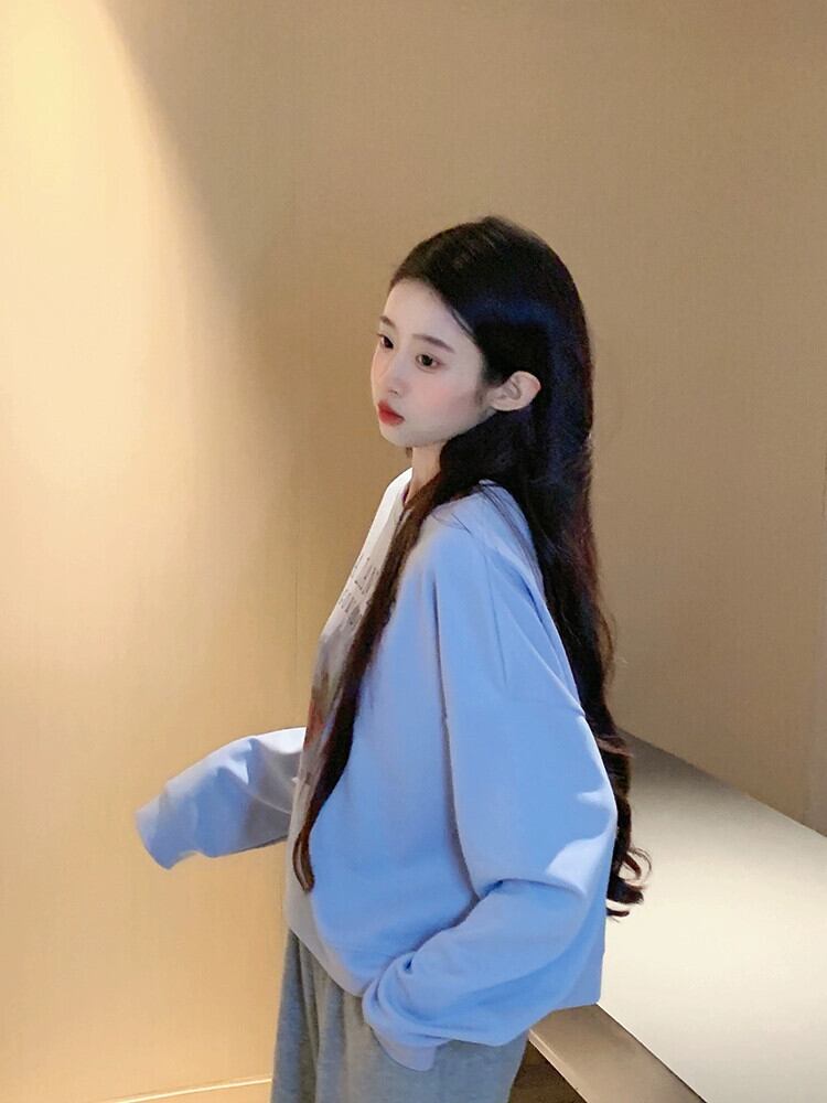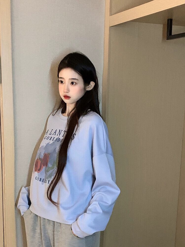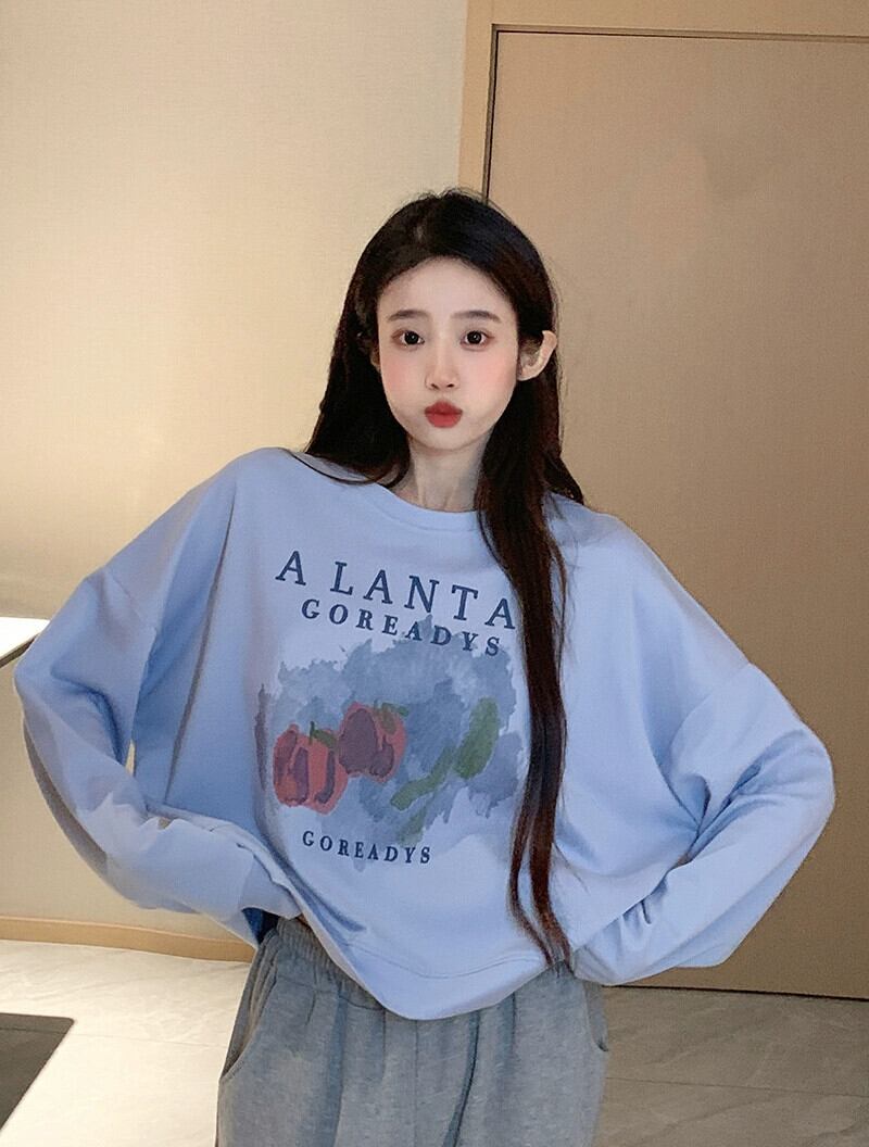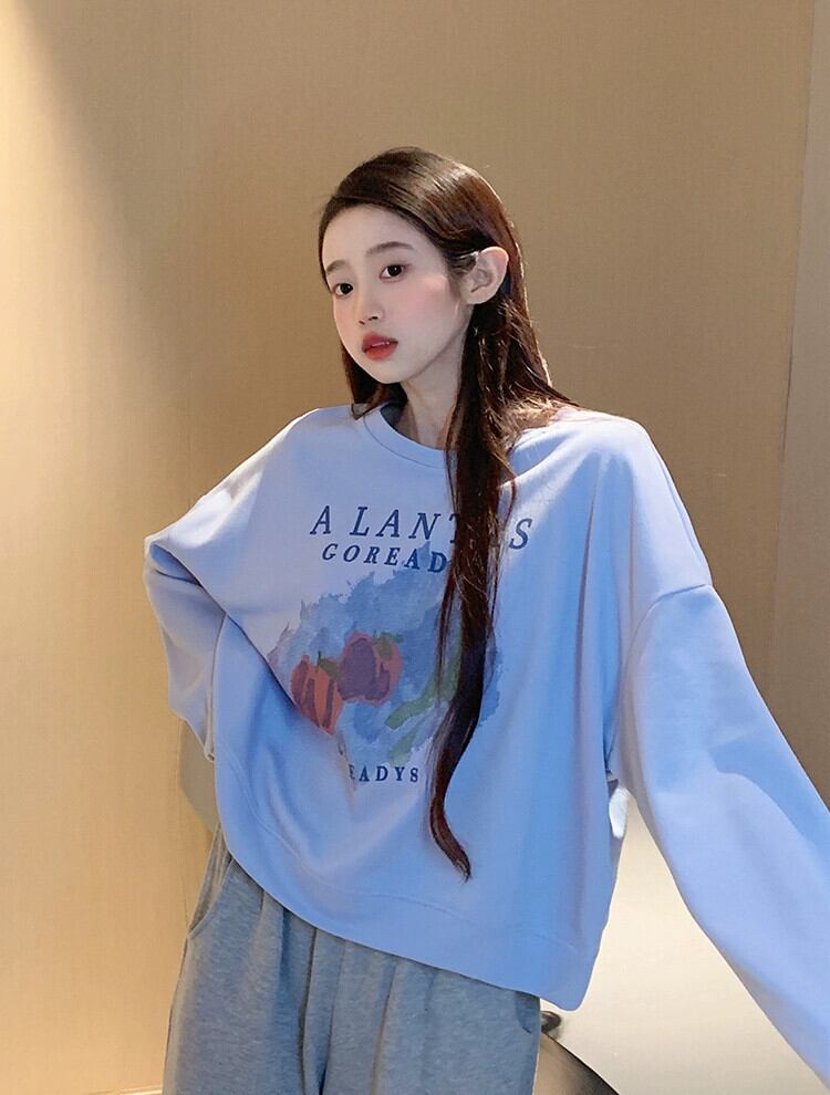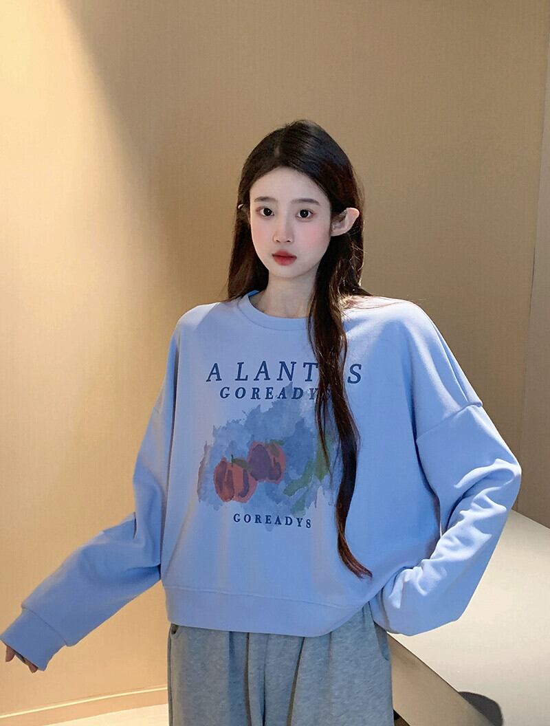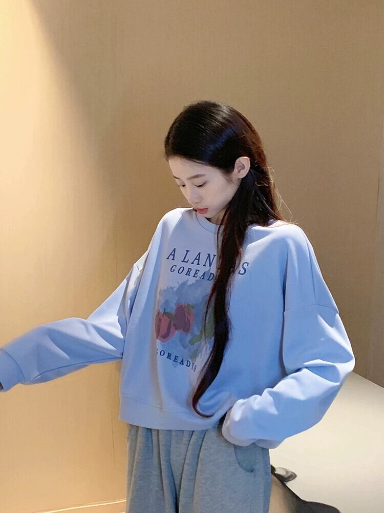 ブループリントショートスウェットシャツの女性の春と秋2023新しいスタイルの小さなルーズデザイン多目的ラウンドネックトップ スプリング 春物 オータム 秋物 Oネック 7460058383393555 | framboise21