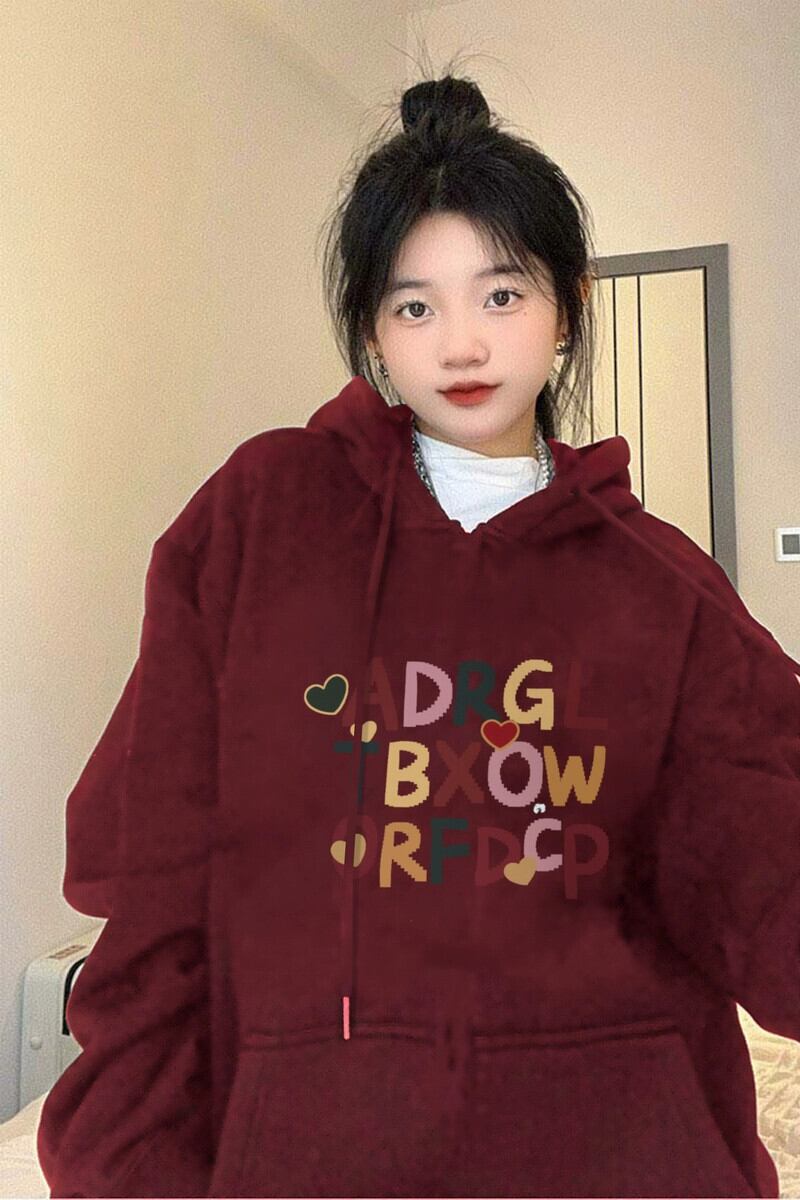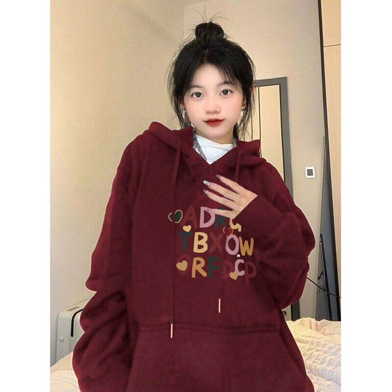 オーバーサイズのフード付きスウェットシャツの女性の秋冬デザインのアメリカンルーズレイジースタイルレタープリントバーガンディジャケット オータム 秋物 ウィンター 冬物 7460090851441611 | framboise21