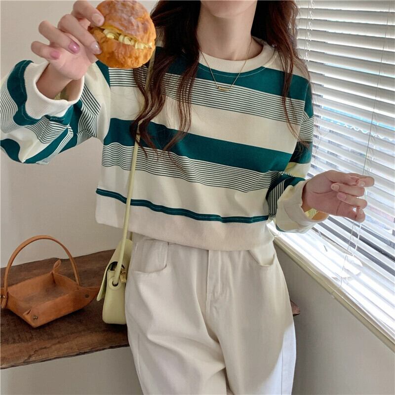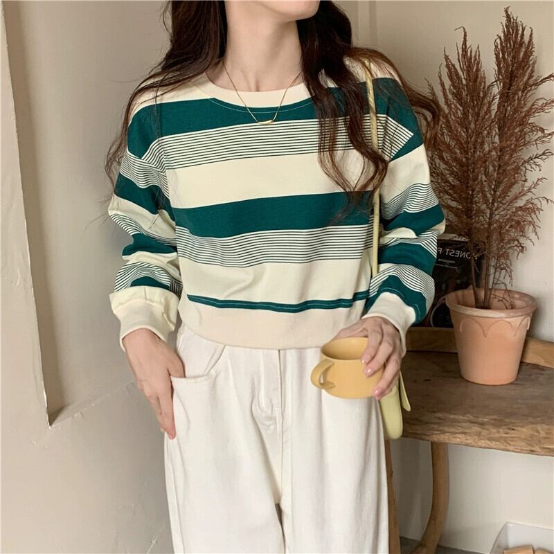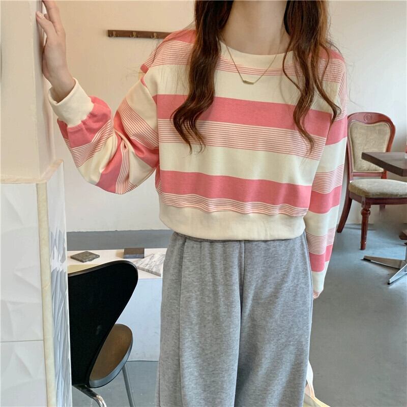 小さな短い縞模様のスウェットシャツの女性の2023春と秋の新しい人気のデザイン、ゆったりと多用途の長袖トップ ショート ロング スプリング 春物 オータム 秋物 ストライプ 7460051844117683 | framboise21