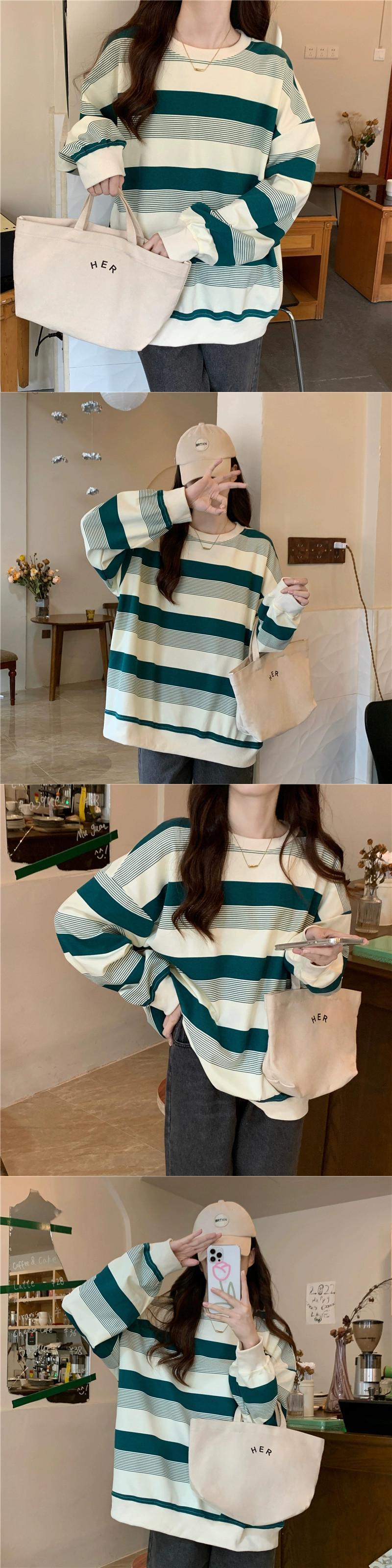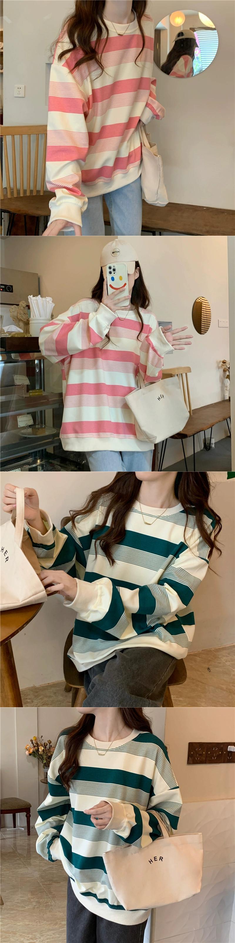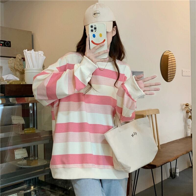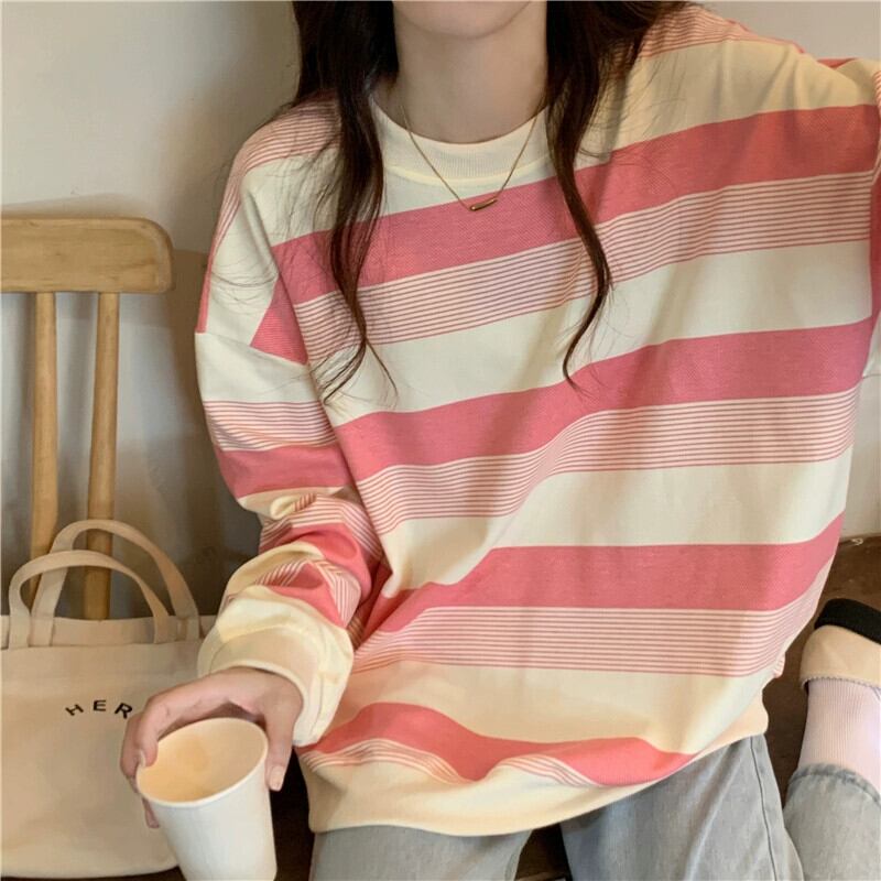 ピンクのストライプのミッドレングスのスウェットシャツの女性、春と秋のゆったりとしたデザイン、ゆったりとした怠惰なプルオーバー長袖トップ ロング スプリング 春物 オータム 秋物 7460025509415888 | framboise21