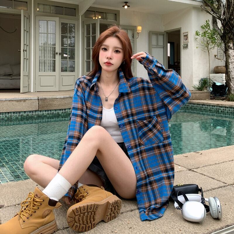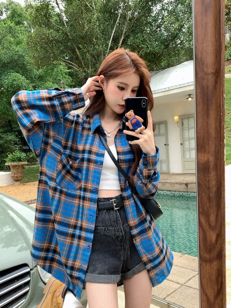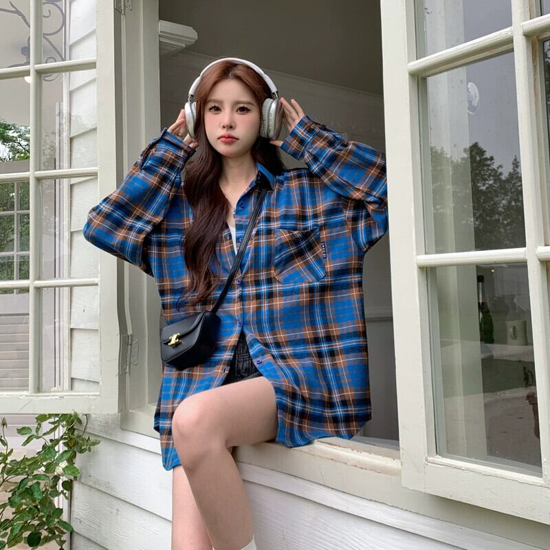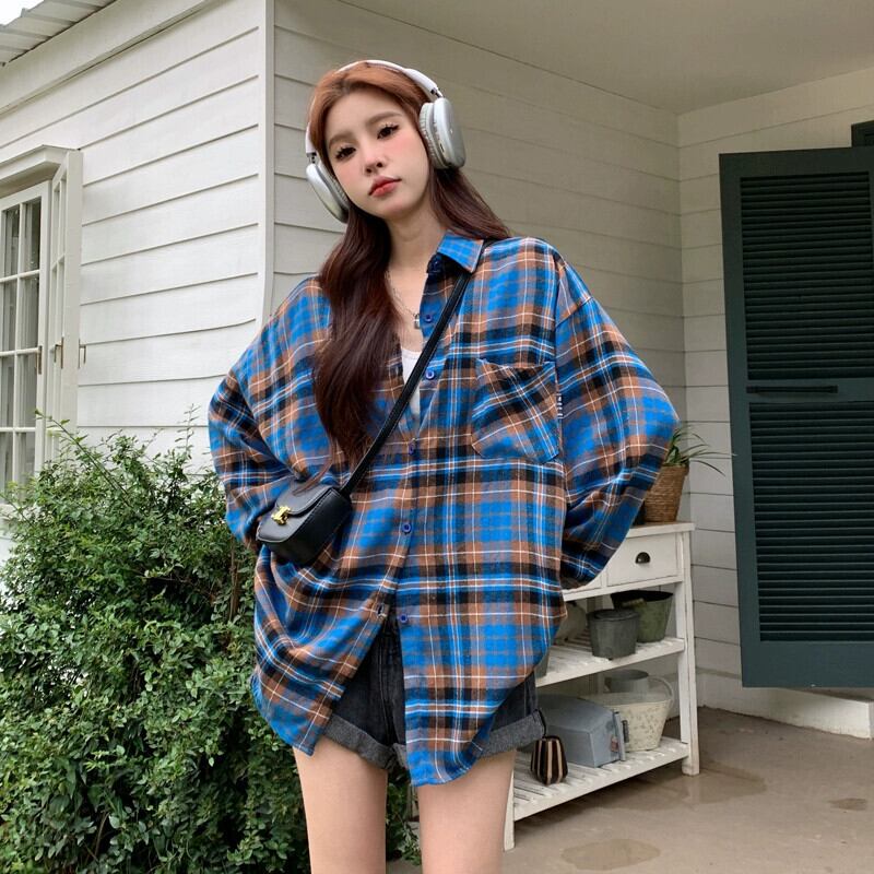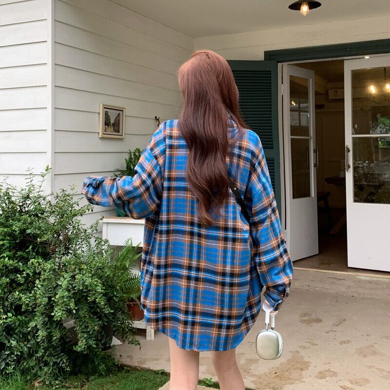 春と秋のミッドレングスのブルーのチェック柄のシャツジャケットの女性、ゆったりとしたカジュアルな長袖シャツとのアメリカンレトロな重ね着 ロング スプリング 春物 オータム 秋物 746005913108362 | framboise21