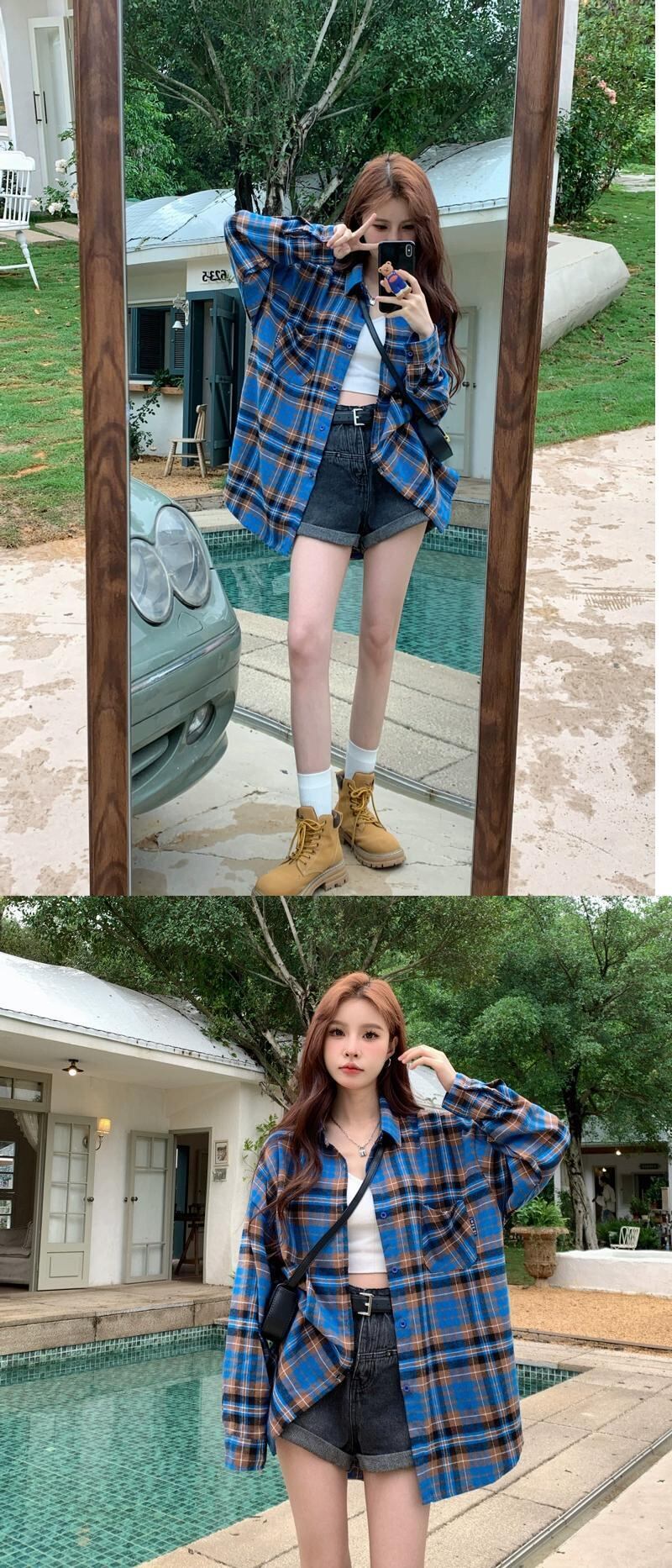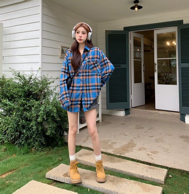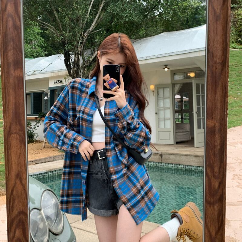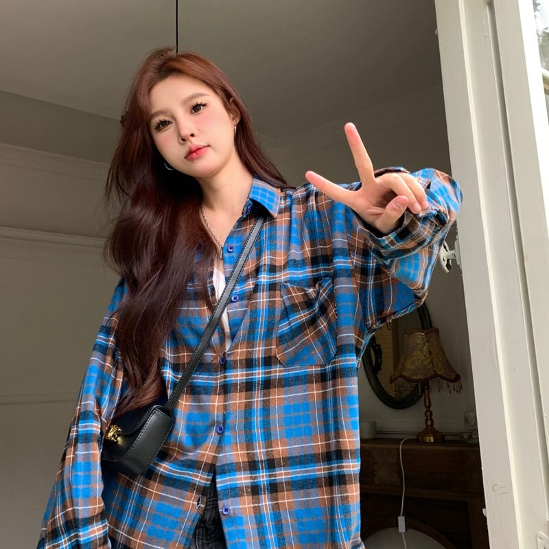 春と秋のミッドレングスのブルーのチェック柄のシャツジャケットの女性、ゆったりとしたカジュアルな長袖シャツとのアメリカンレトロな重ね着 ロング スプリング 春物 オータム 秋物 746005913108362 | framboise21