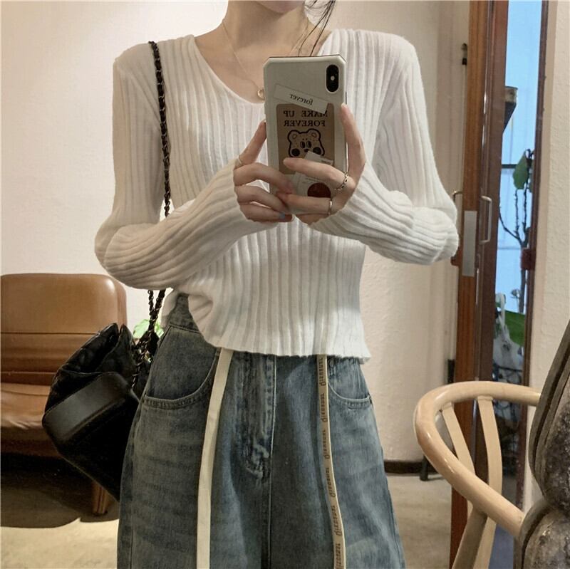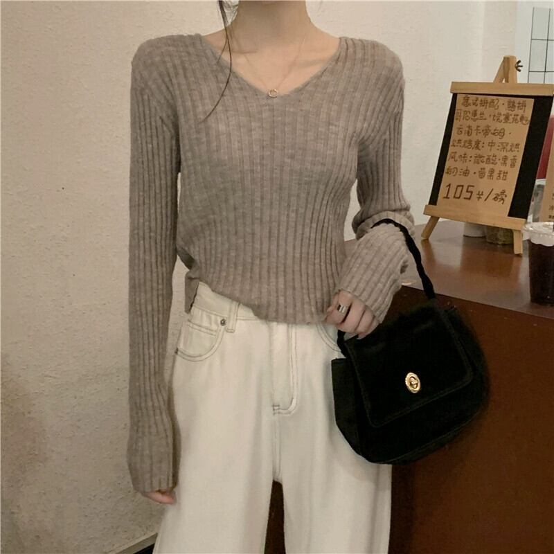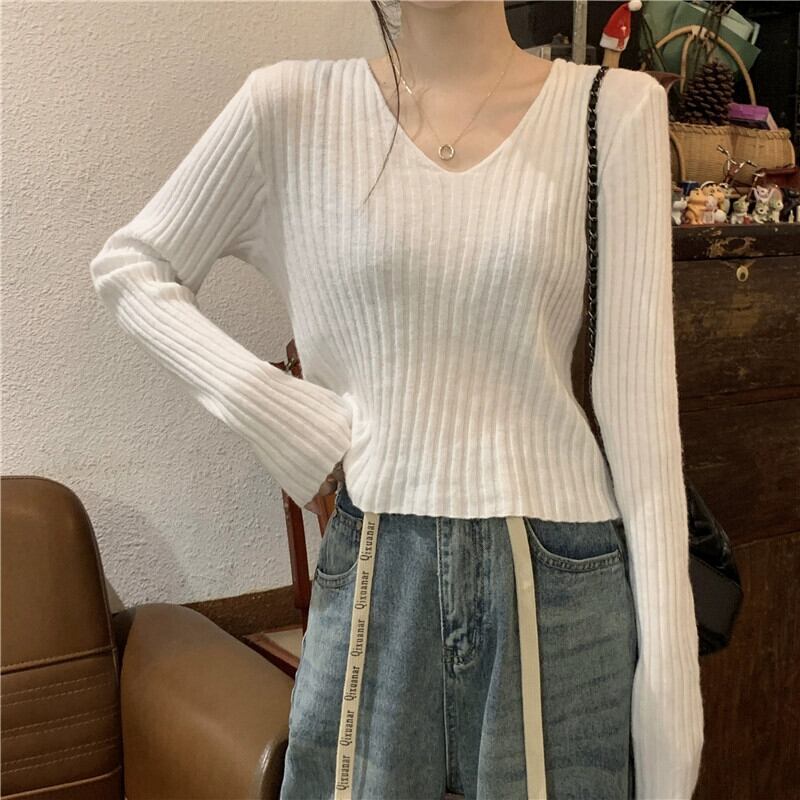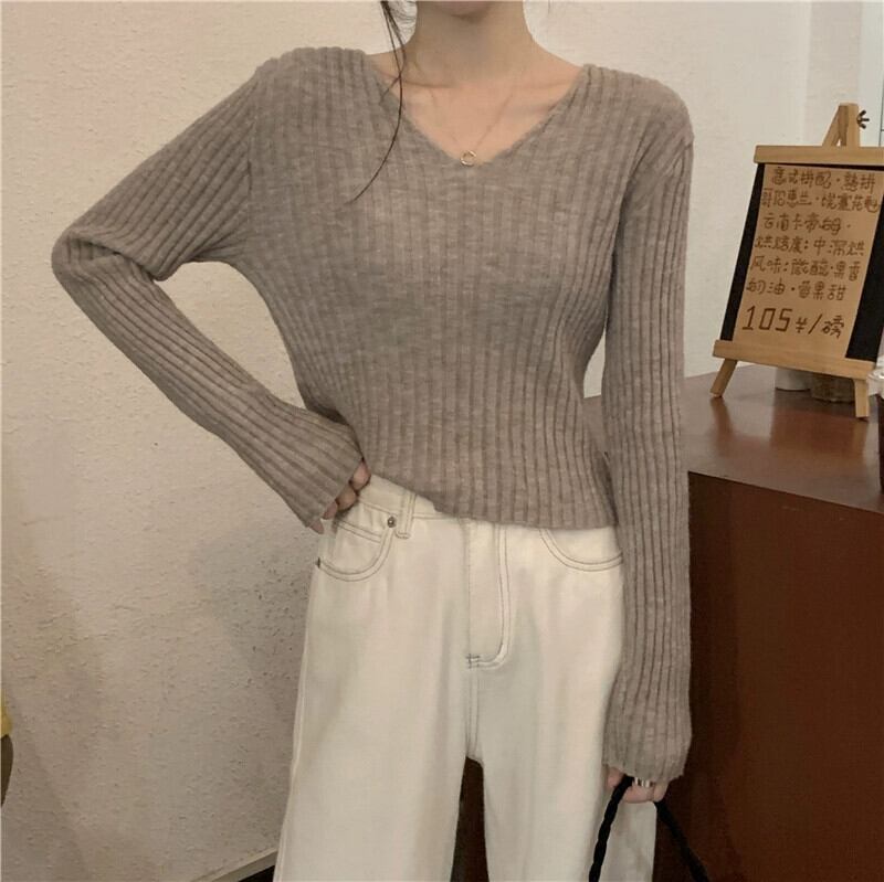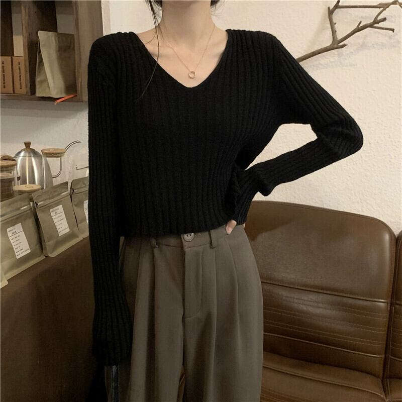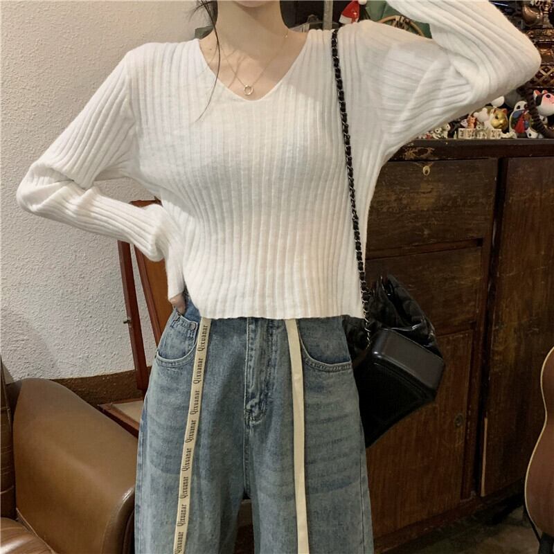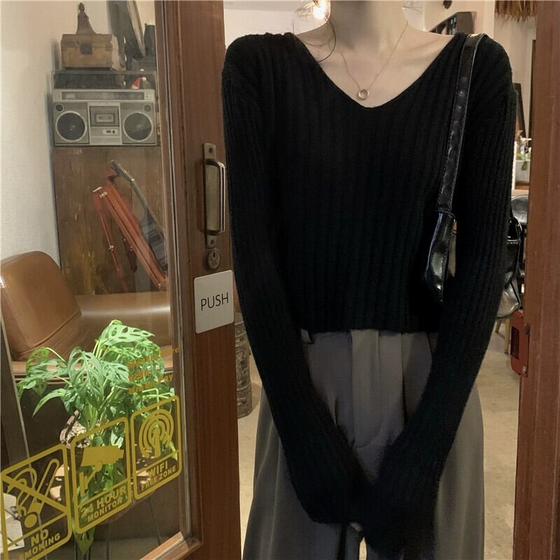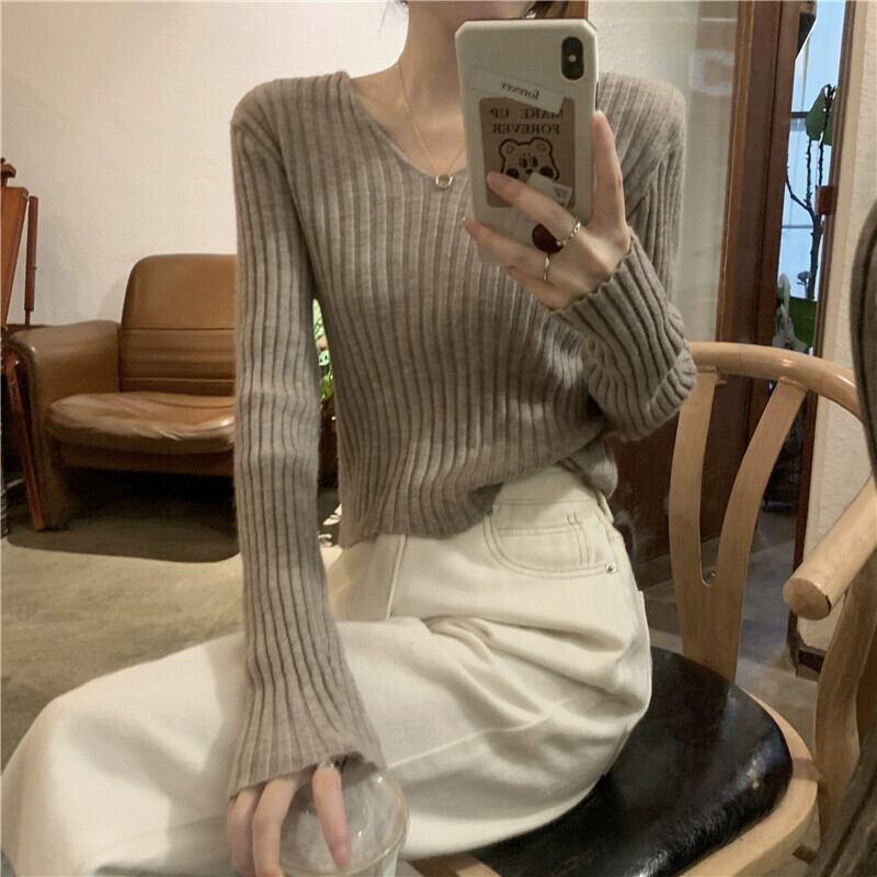 小さな短い長袖ボトリングシャツ女性の秋と冬のフランスのファッションスリムフィットインナー V ネックニットセーター ショート ロング オータム 秋物 ウィンター 冬物 Vネック 7460023589768887 | framboise21