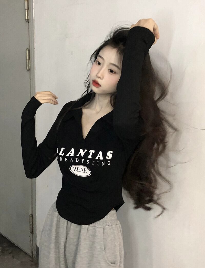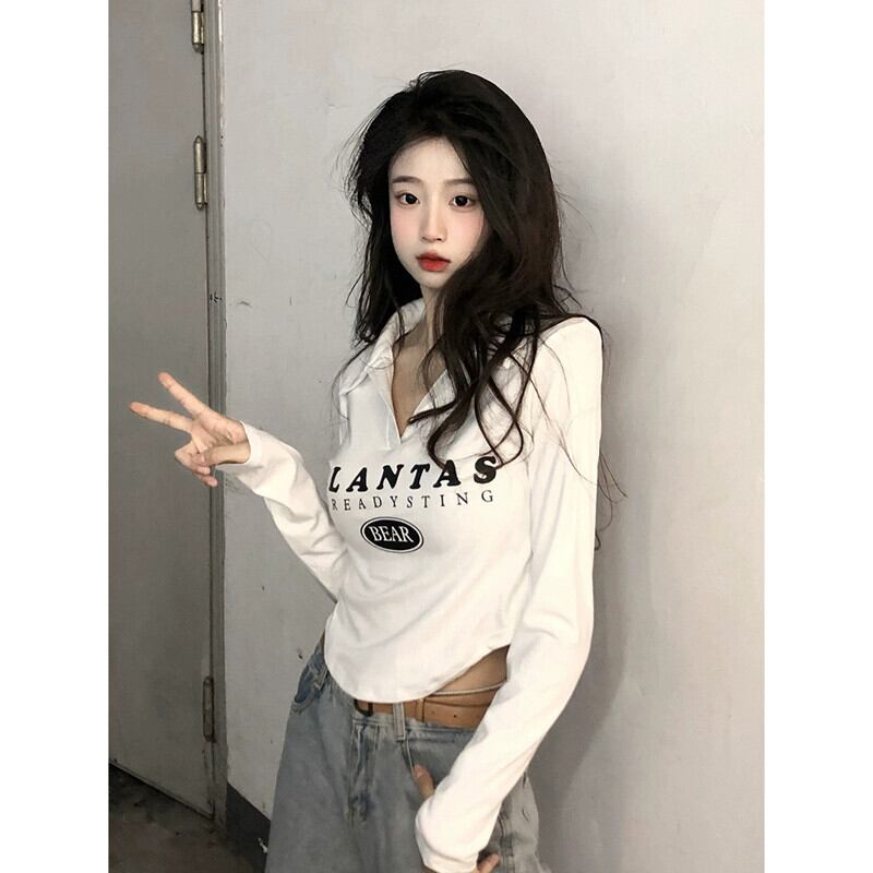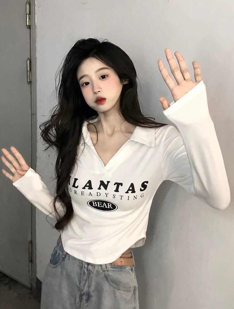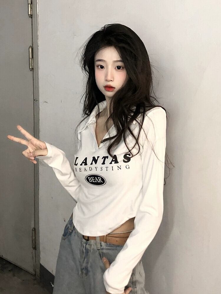 不規則な短い長袖トップス女性、春と秋のアメリカンファッションデザイン、内側にスリムフィット、カーブしたポロカラーTシャツ ショート ロング スプリング 春物 オータム 秋物 7460060261400914 | framboise21