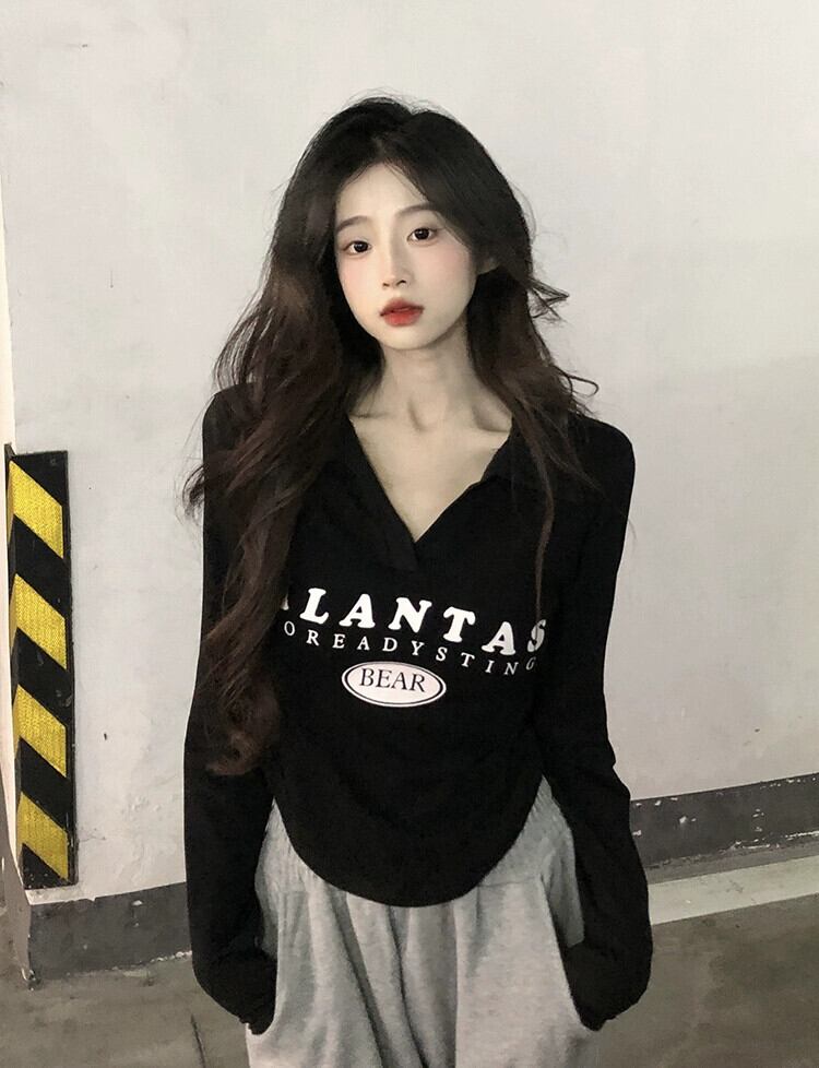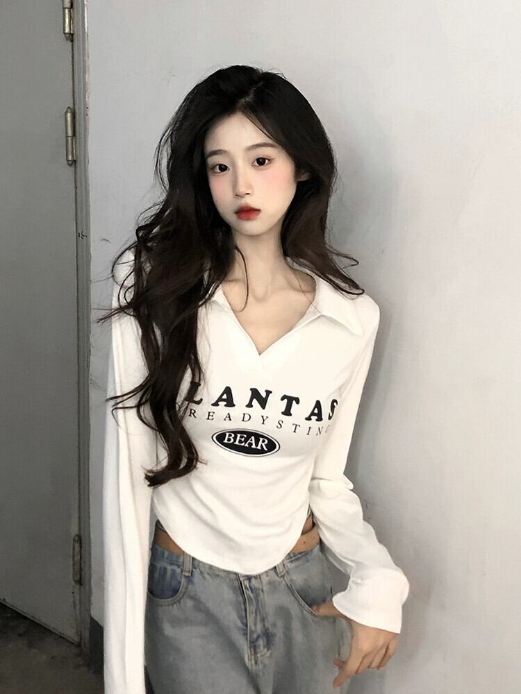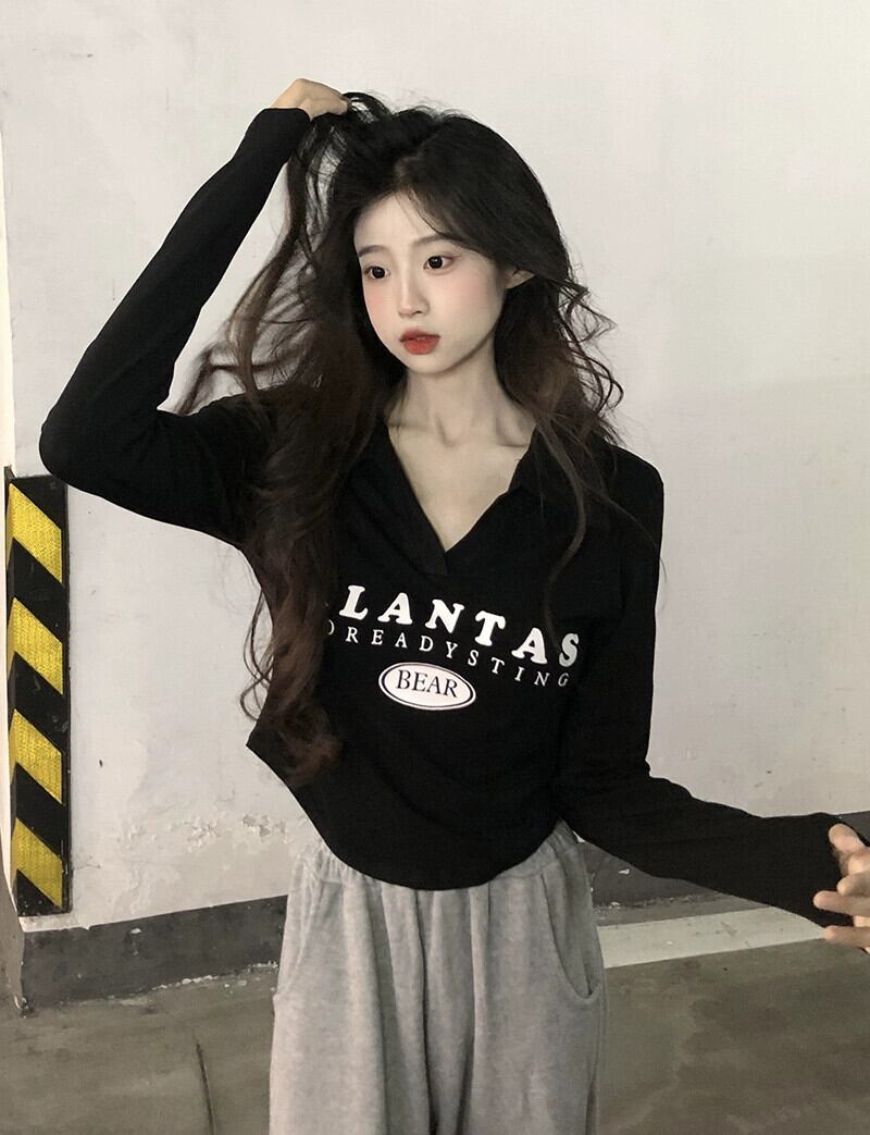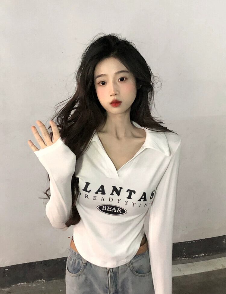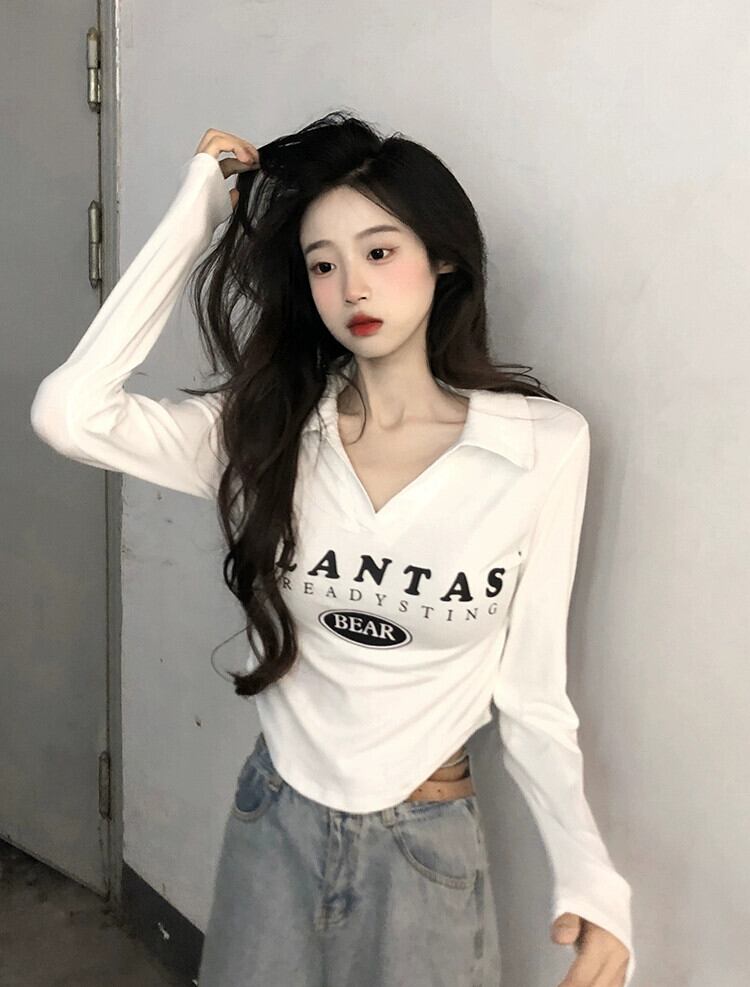 不規則な短い長袖トップス女性、春と秋のアメリカンファッションデザイン、内側にスリムフィット、カーブしたポロカラーTシャツ ショート ロング スプリング 春物 オータム 秋物 7460060261400914 | framboise21
