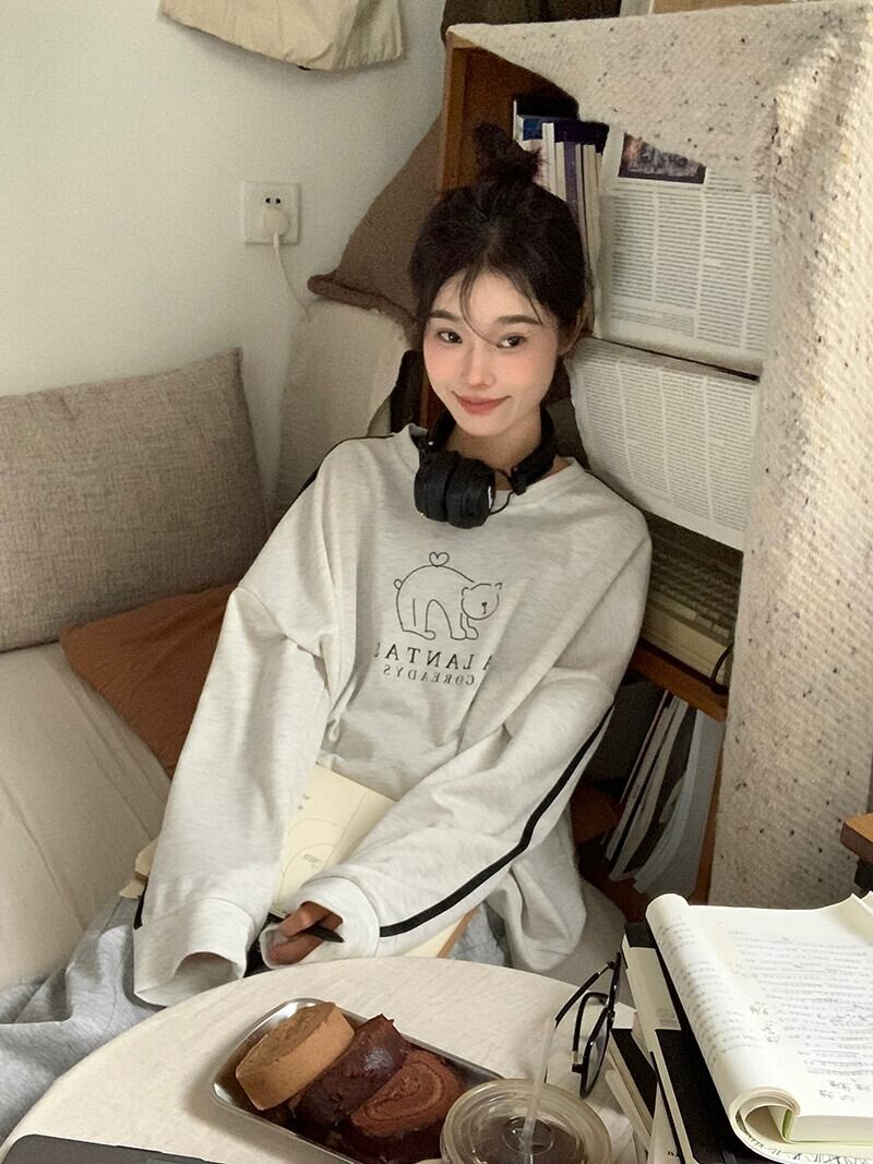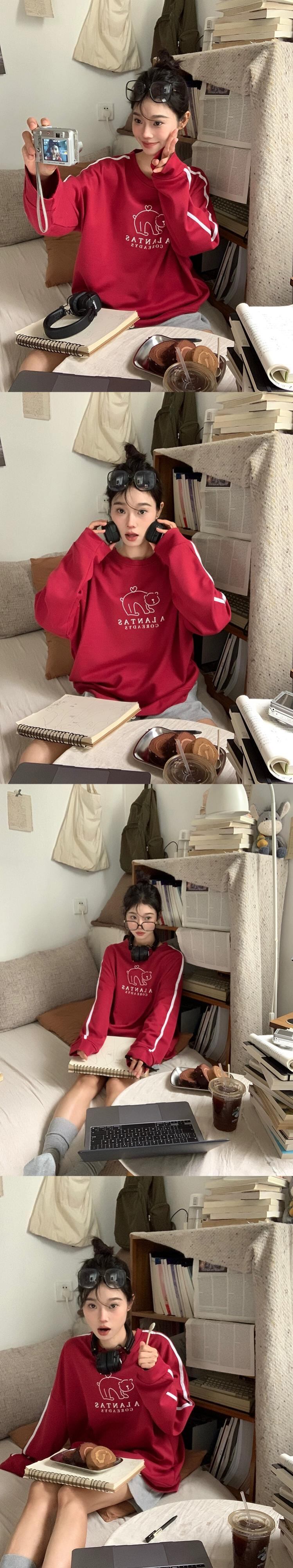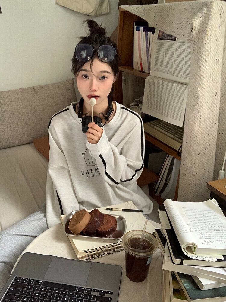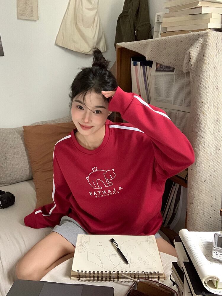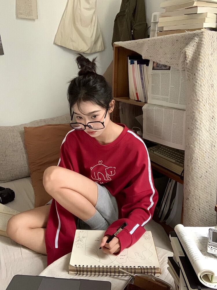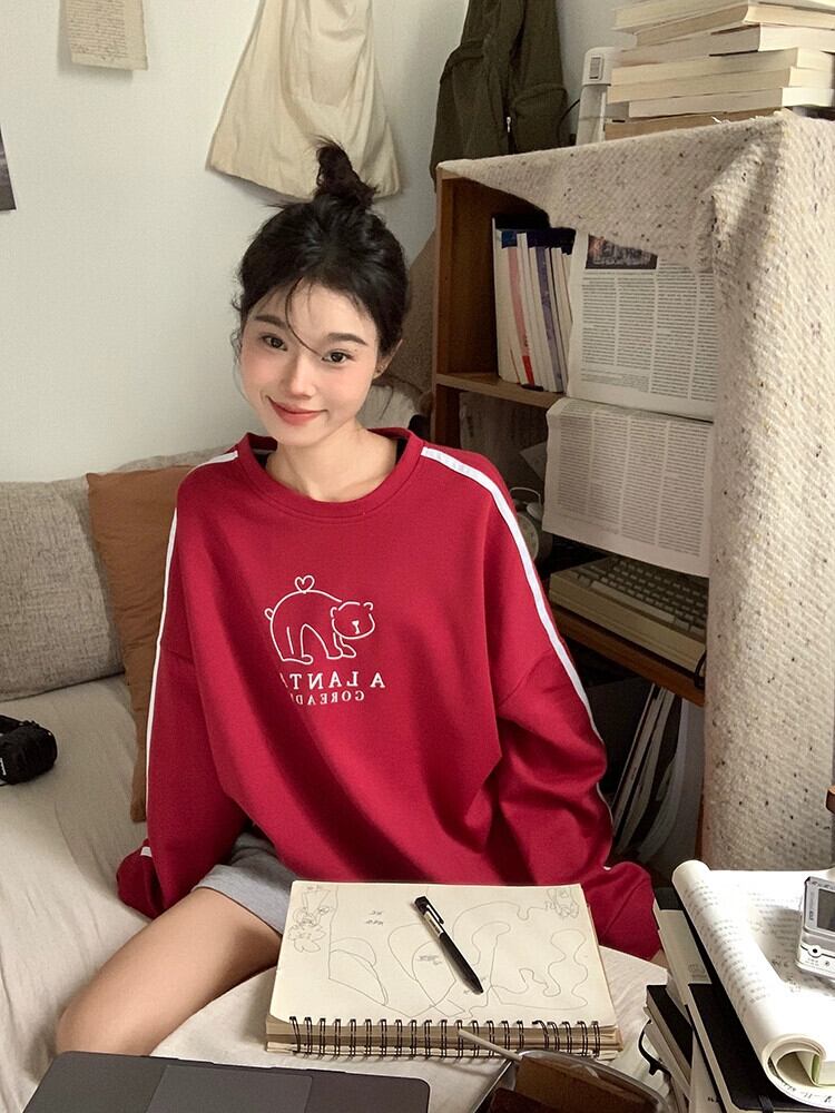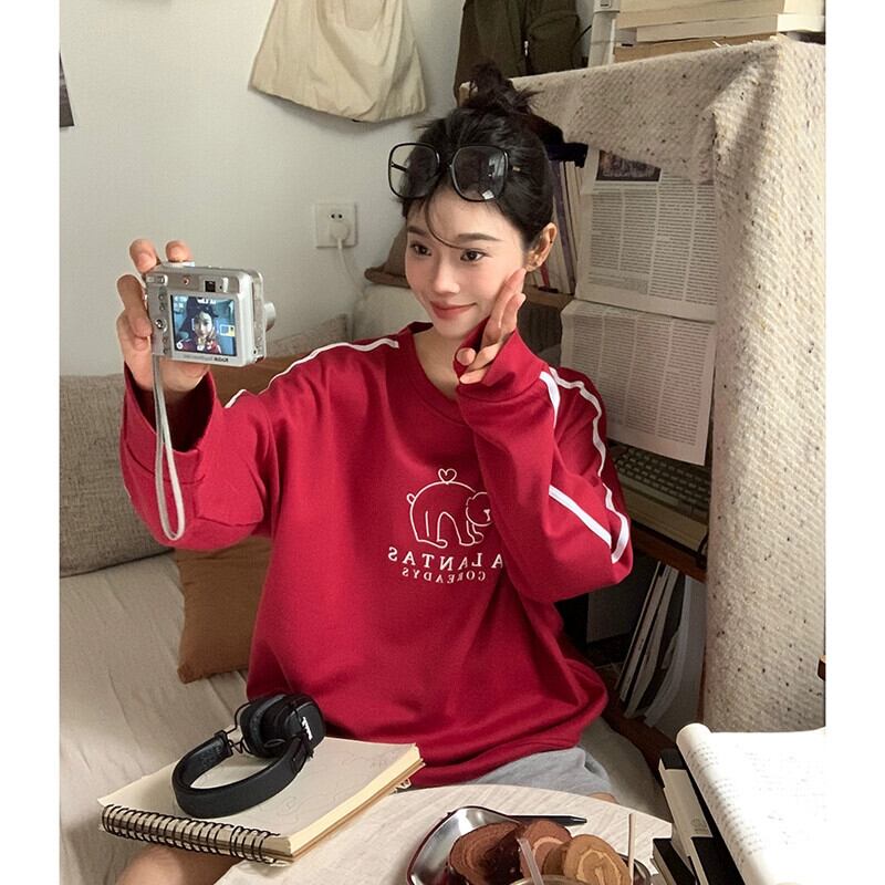 春と秋のバーガンディのラウンドネックスウェットシャツの女性、ルーズなスタイル、怠惰なスタイル、カジュアルで多用途なストライプの長袖トップ ロング スプリング 春物 オータム 秋物 Oネック 7460063985138210 | framboise21