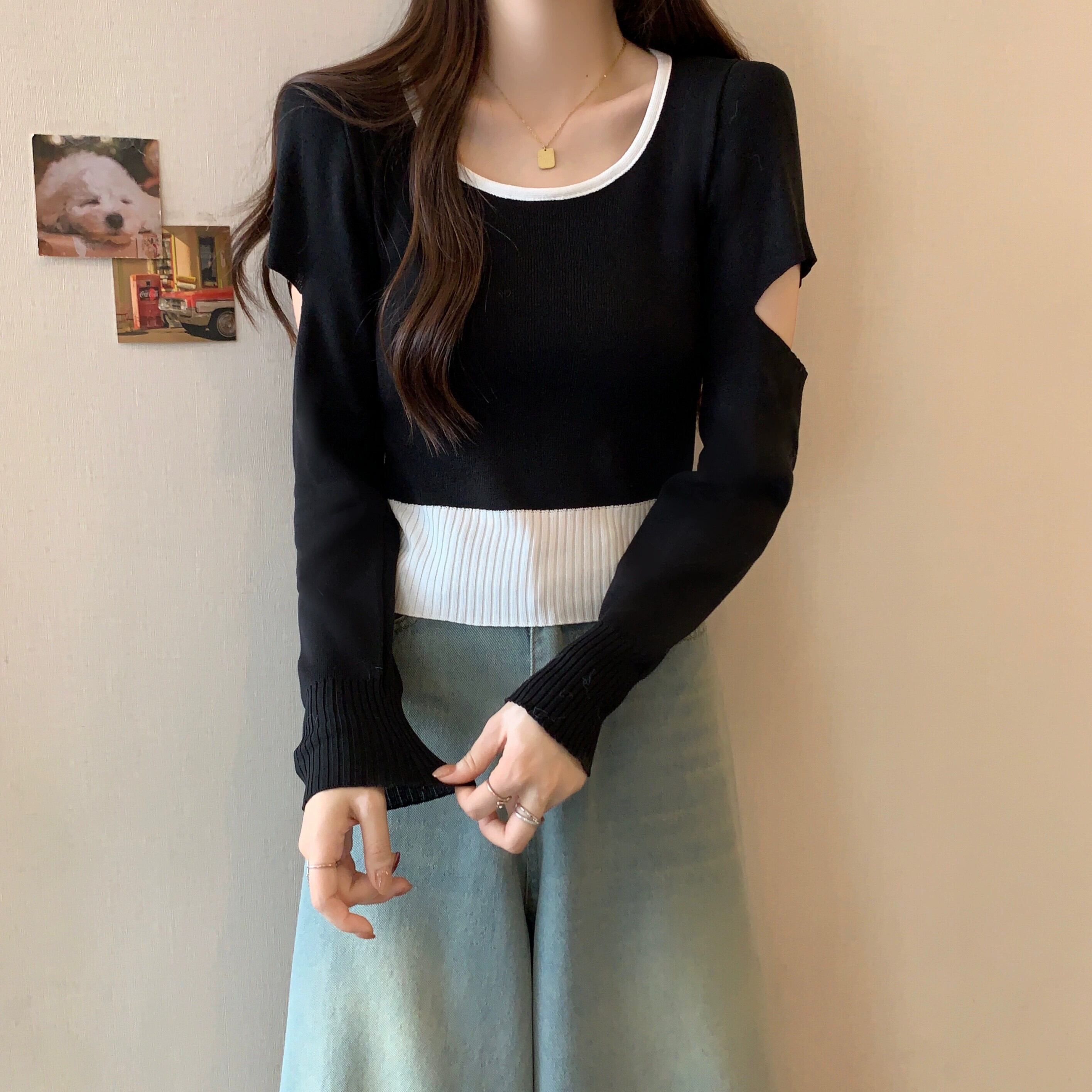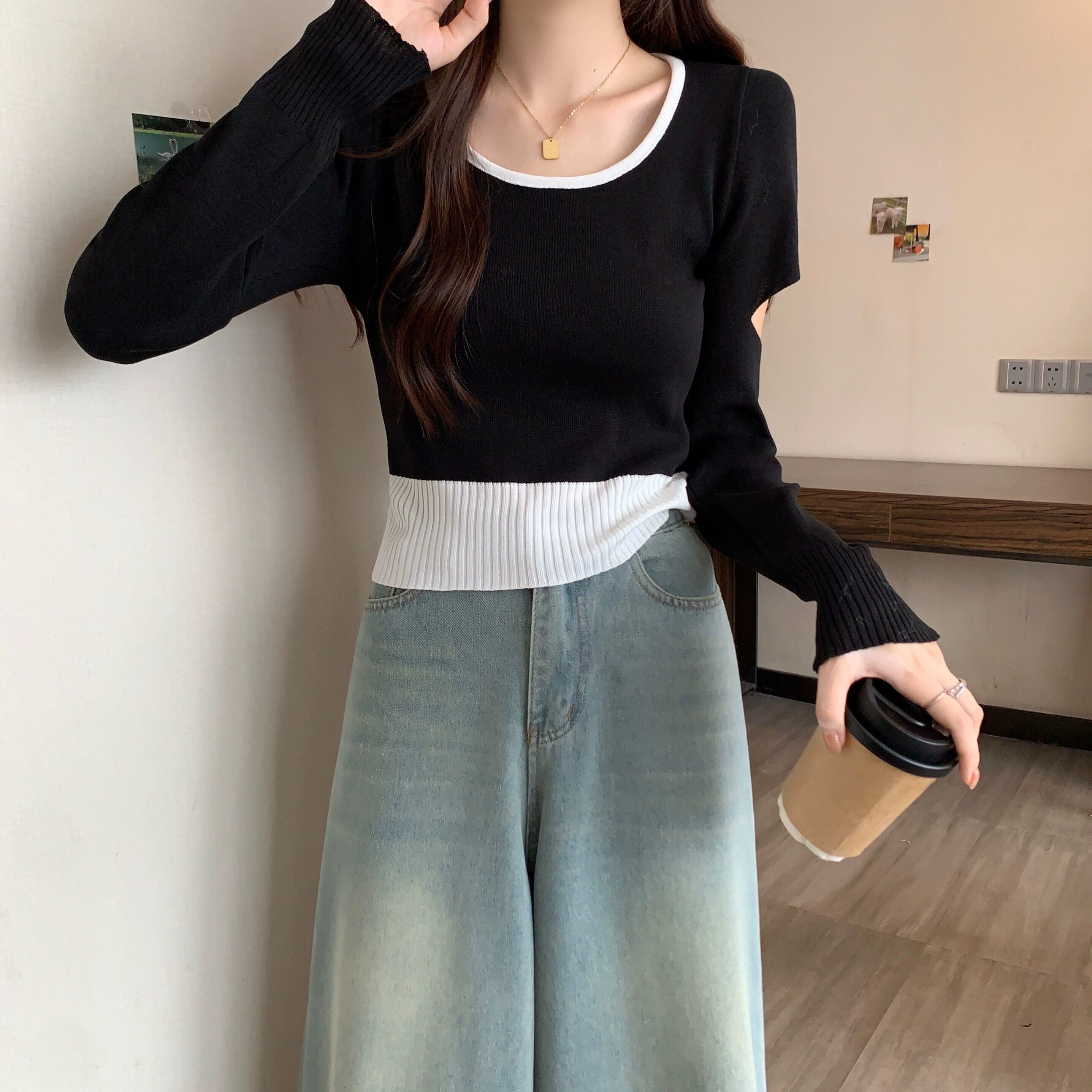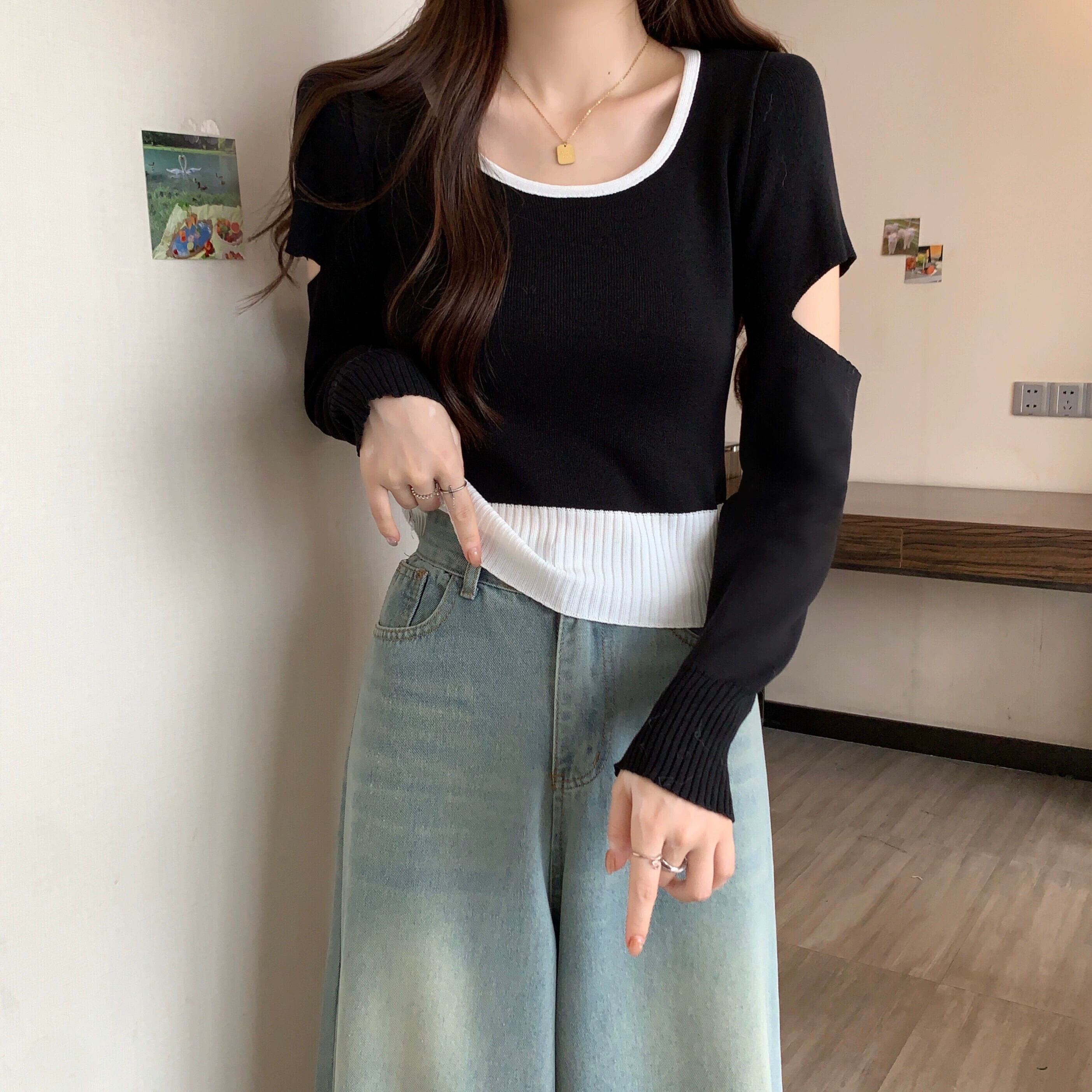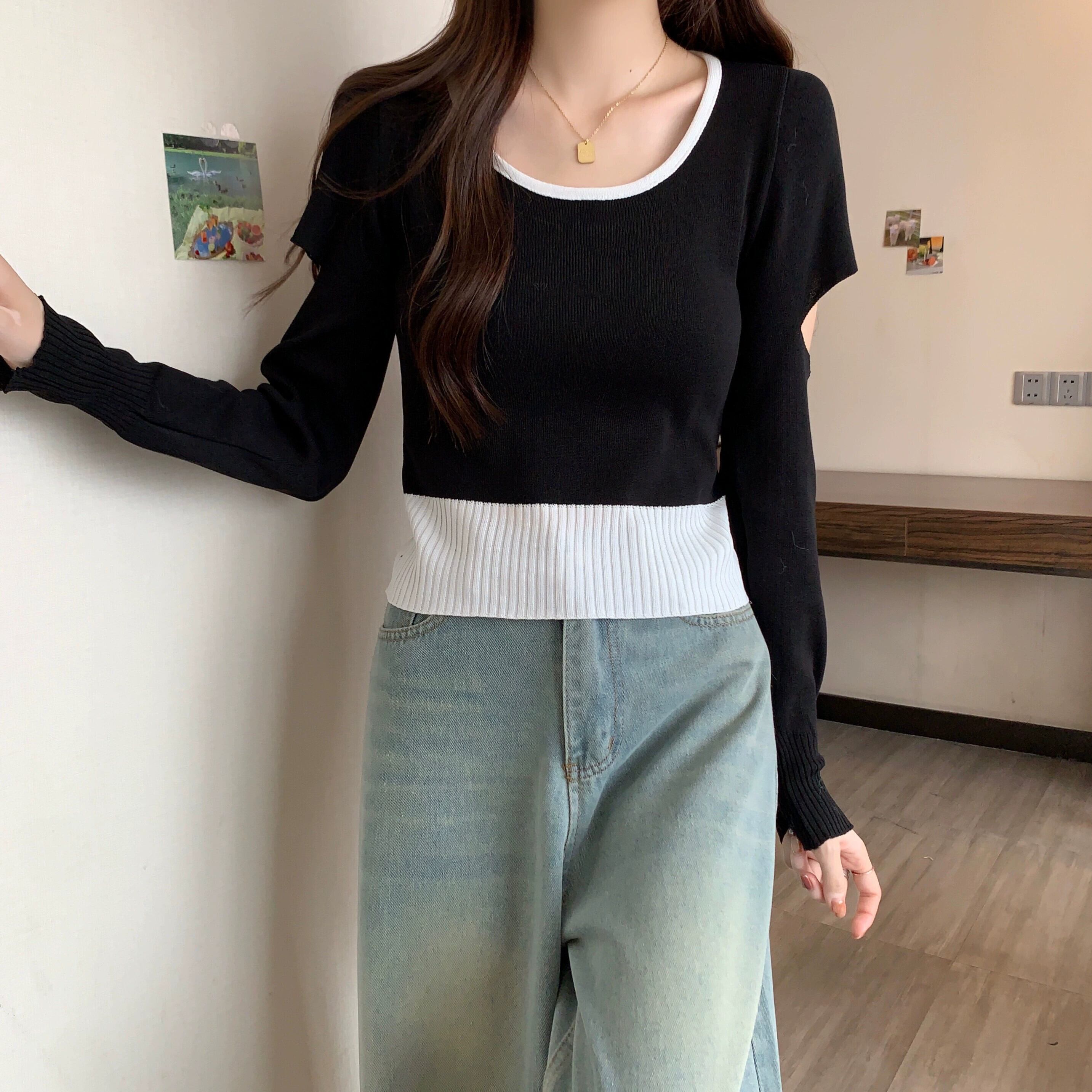 フェイクツーピースニットボトムシャツレディース、秋冬デザイン、ファッショナブルでアインスタイルのインナーウェア、ハイウエストショート中空長袖トップ ロング オータム 秋物 ウィンター 冬物 7460070563276342 | framboise21