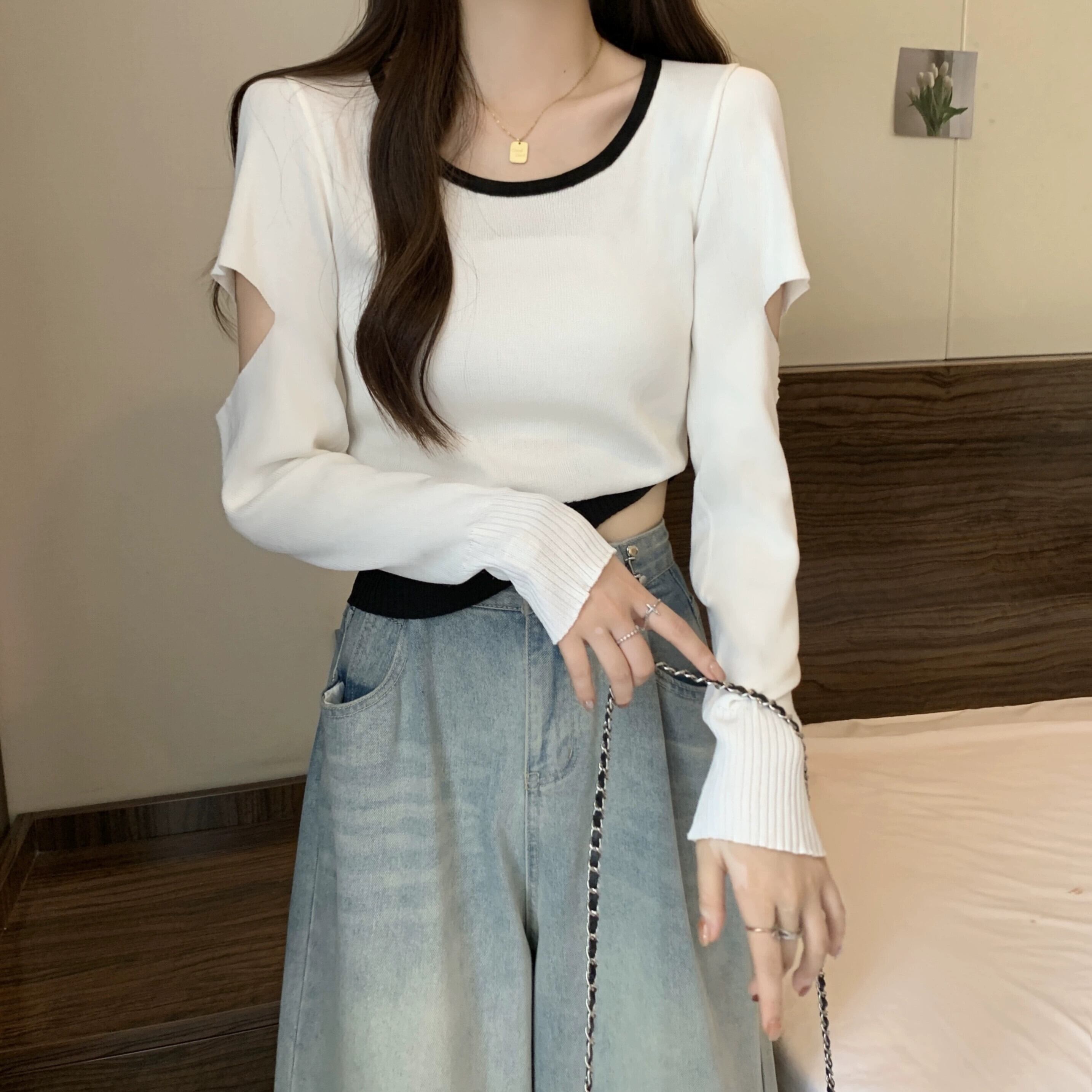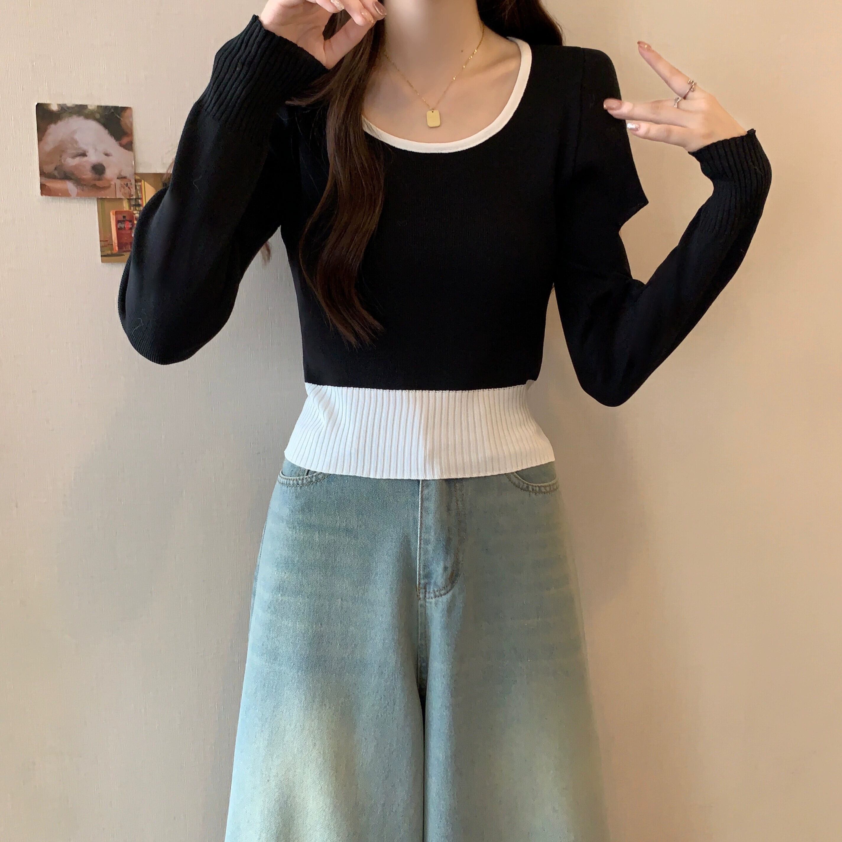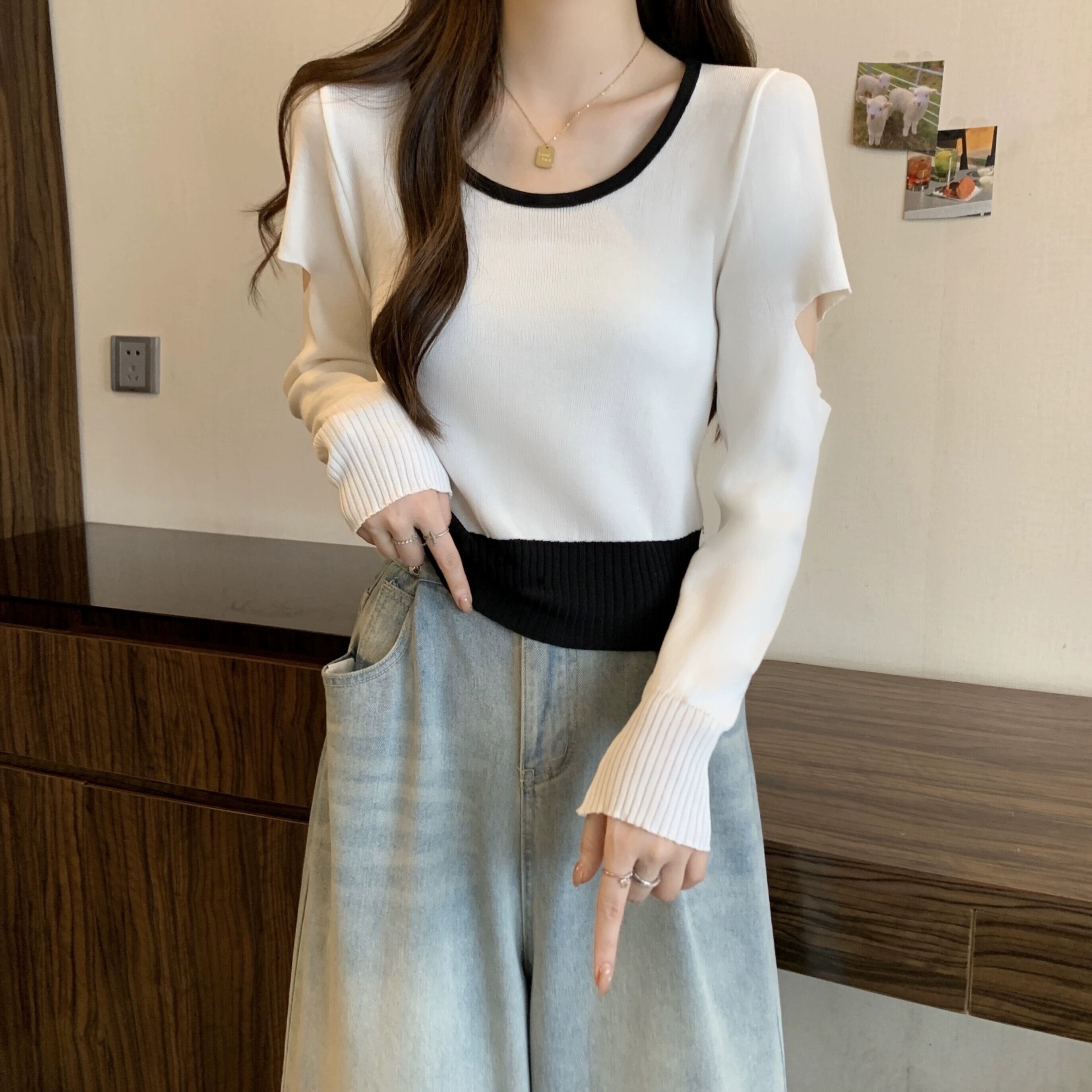 フェイクツーピースニットボトムシャツレディース、秋冬デザイン、ファッショナブルでアインスタイルのインナーウェア、ハイウエストショート中空長袖トップ ロング オータム 秋物 ウィンター 冬物 7460070563276342 | framboise21