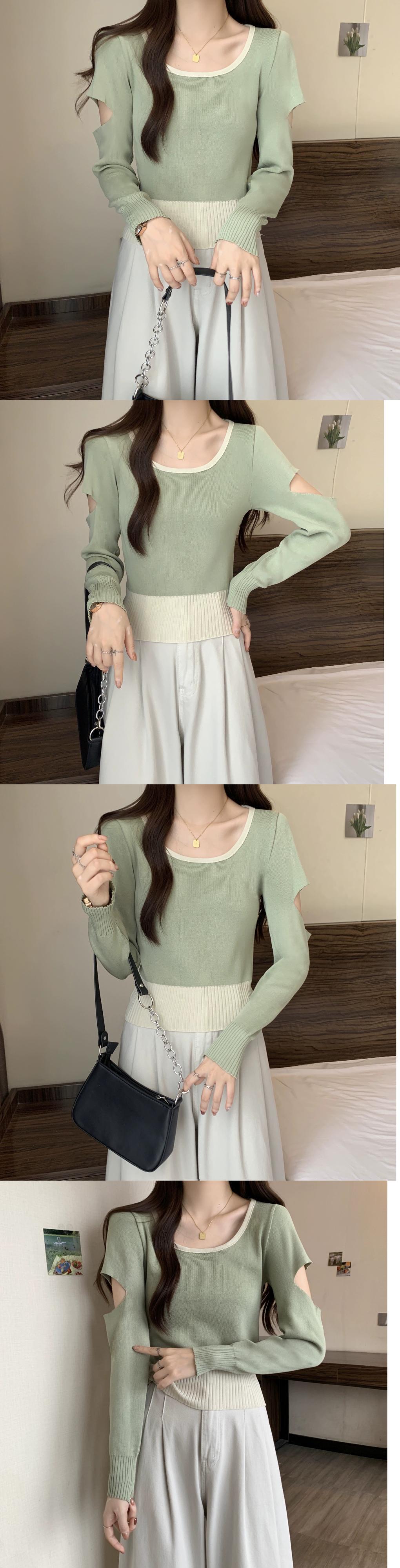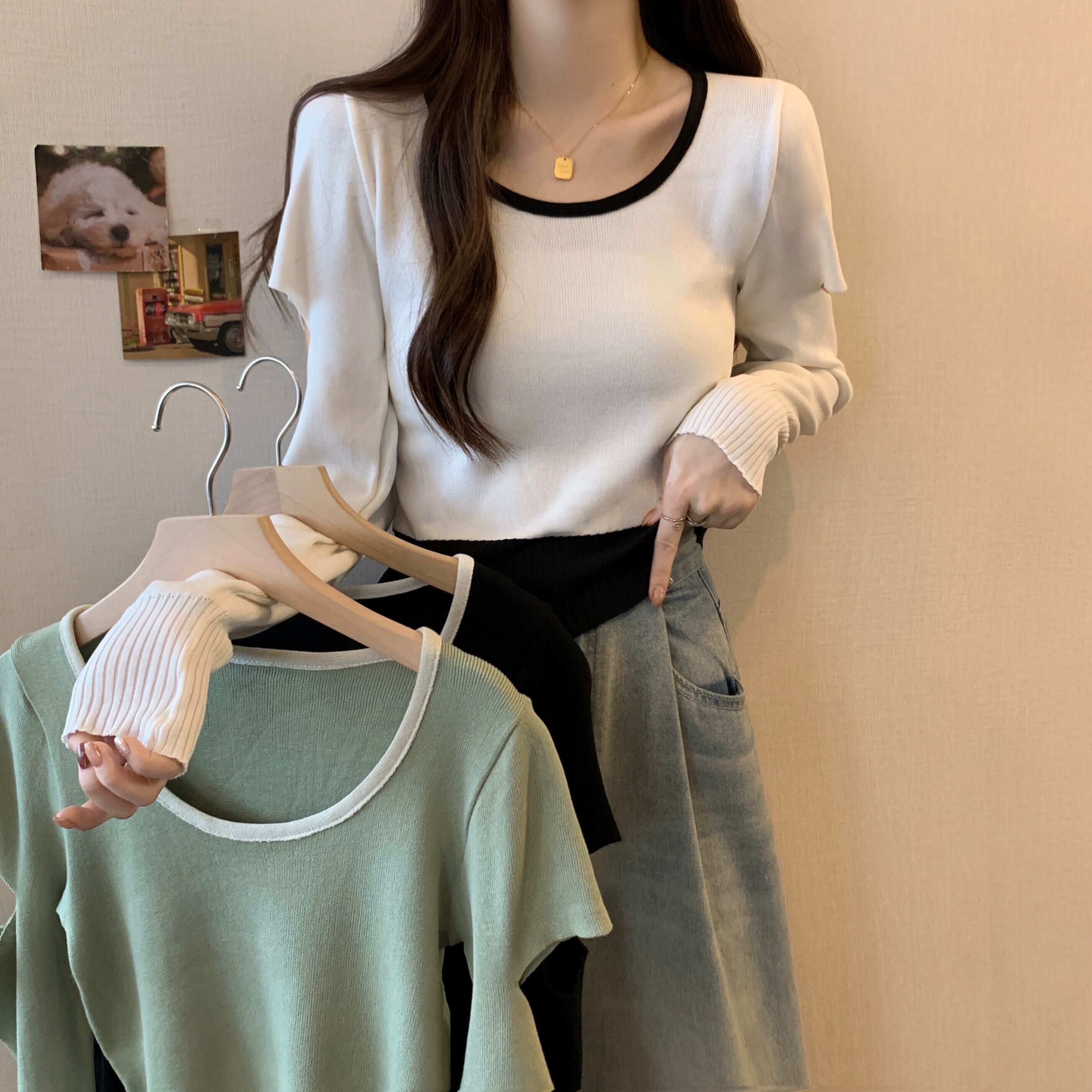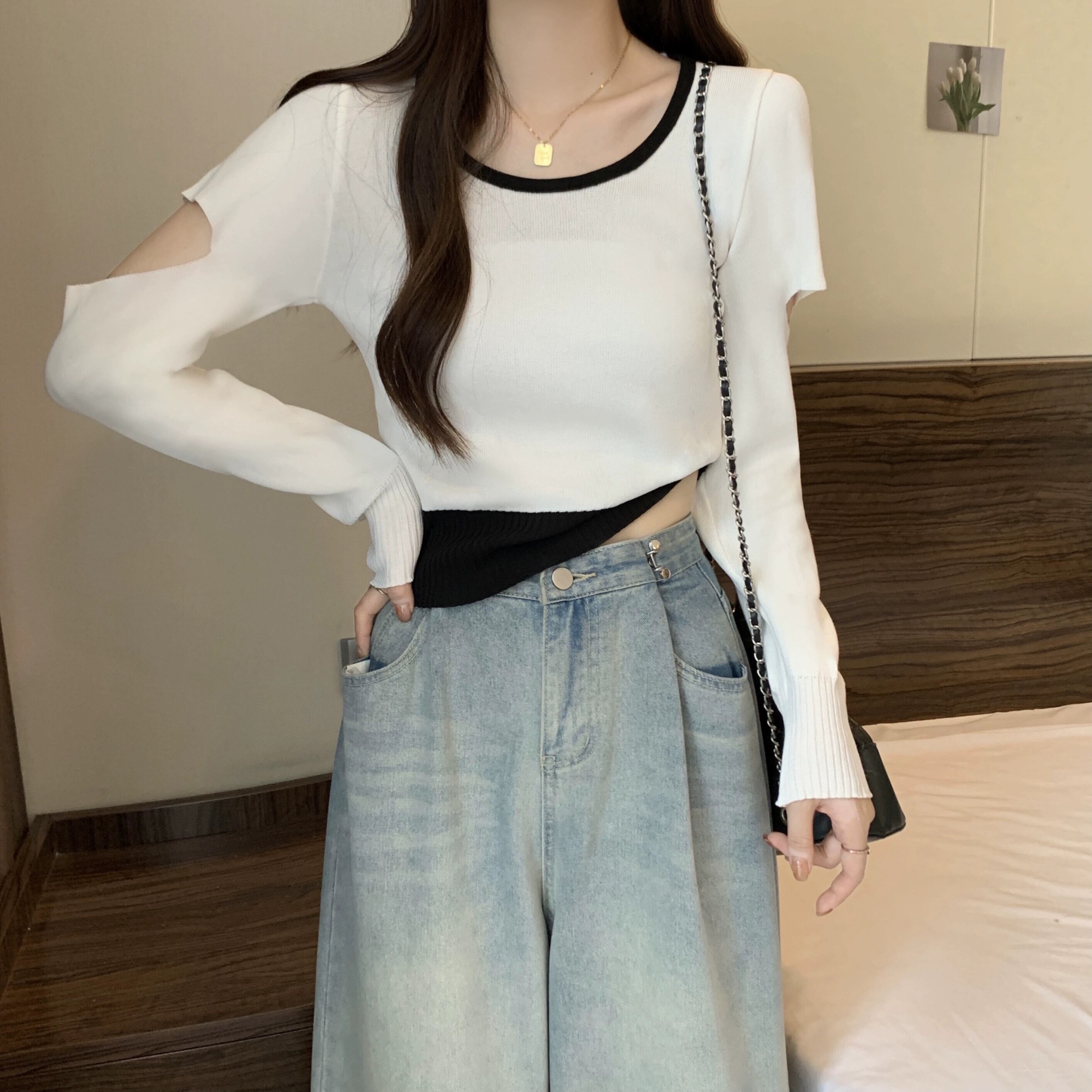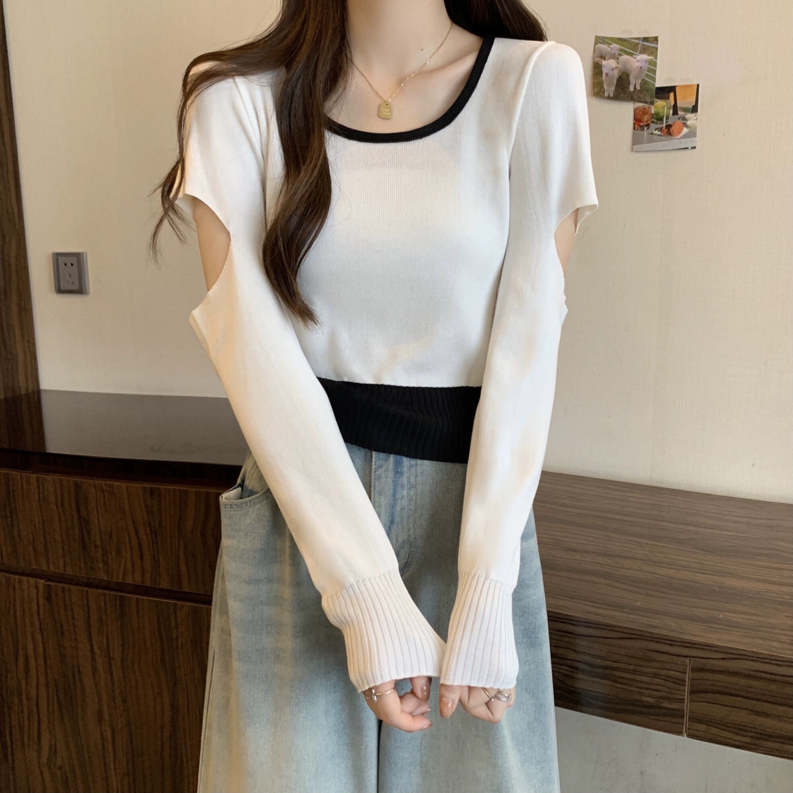 フェイクツーピースニットボトムシャツレディース、秋冬デザイン、ファッショナブルでアインスタイルのインナーウェア、ハイウエストショート中空長袖トップ ロング オータム 秋物 ウィンター 冬物 7460070563276342 | framboise21