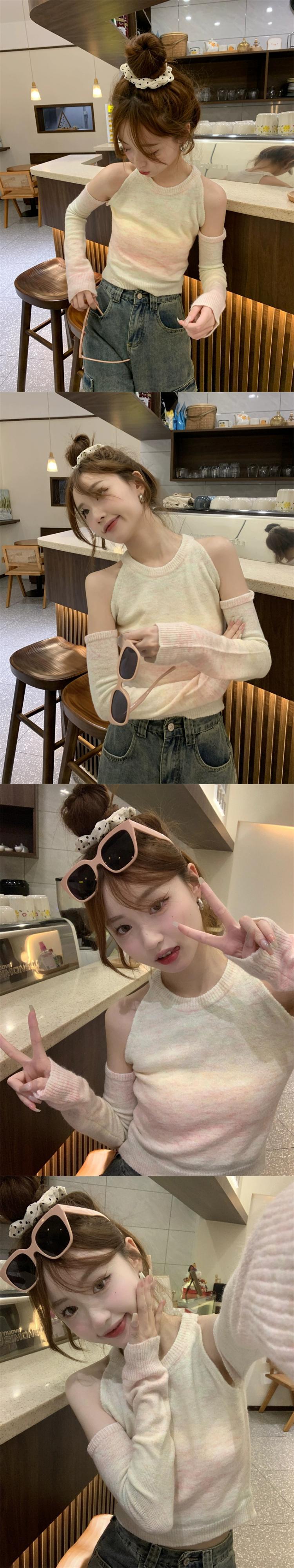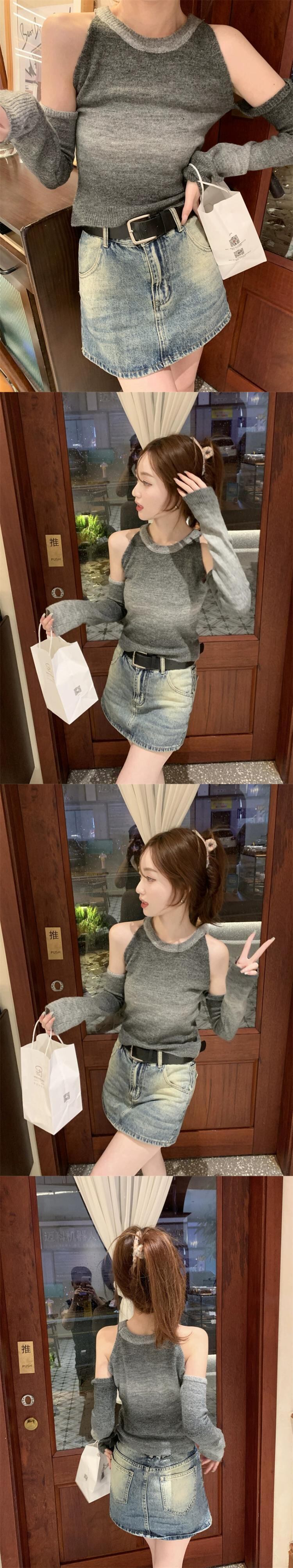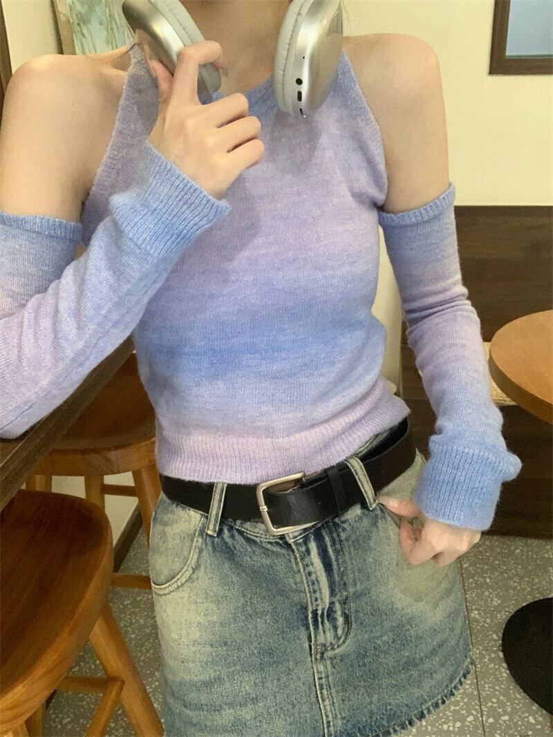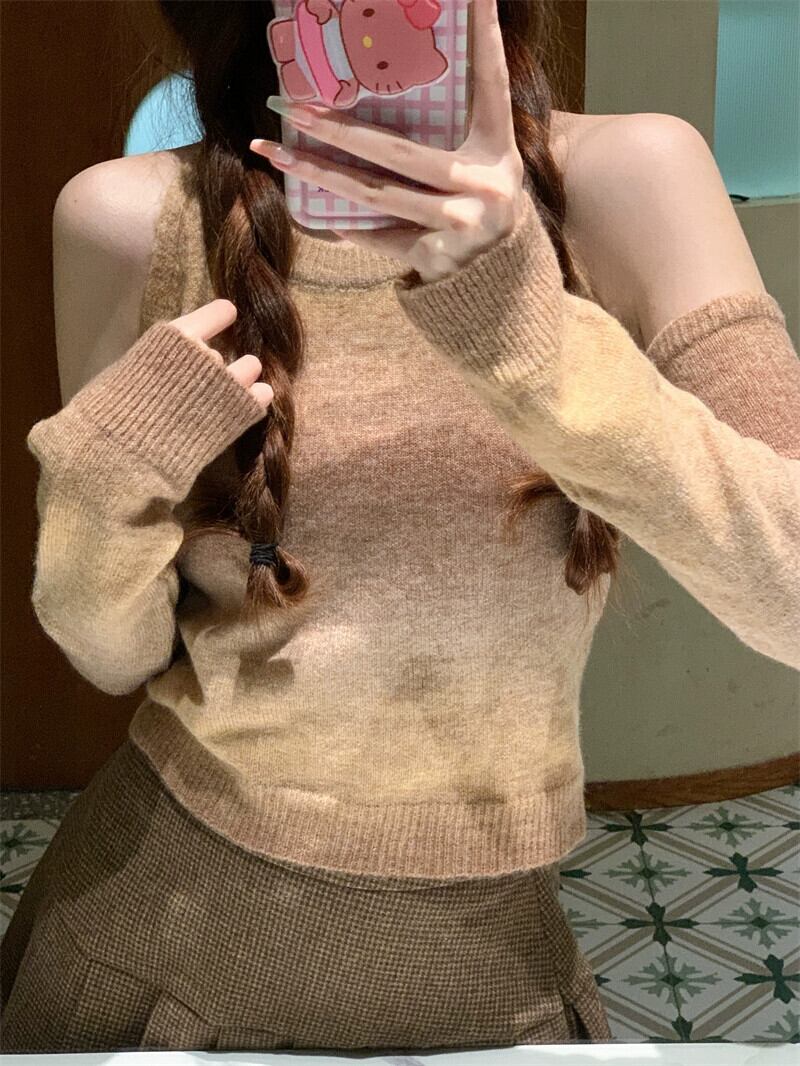 グラデーションオフショルダー長袖ニットボトムシャツレディース、秋冬デザイン、スリムフィット、ショートラウンドネックセーターレディース ロング オータム 秋物 ウィンター 冬物 Oネック 7460035541761302 | framboise21
