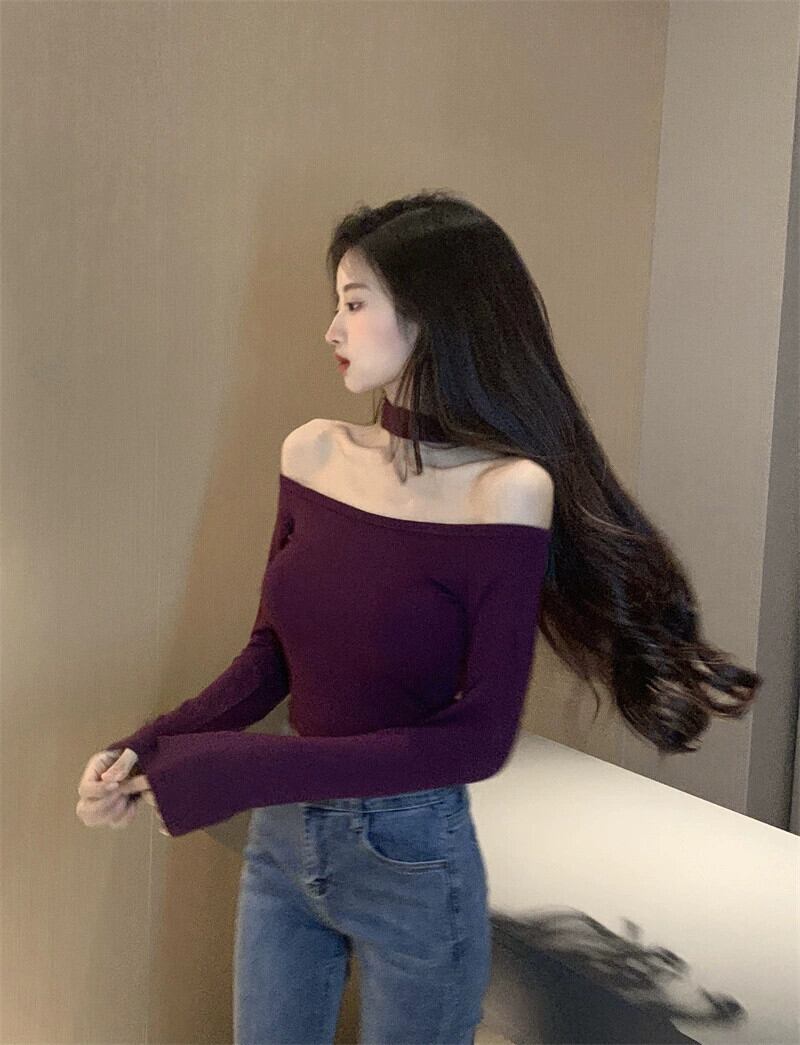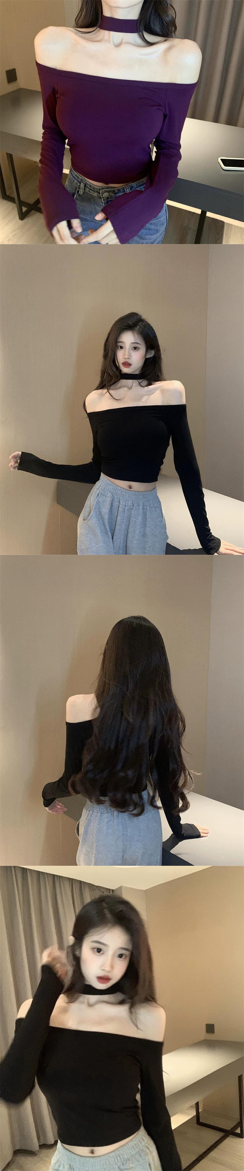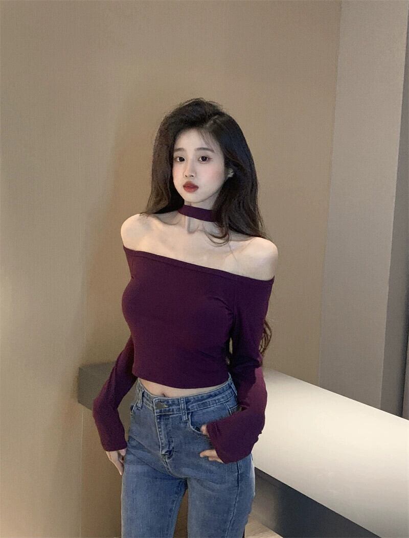 甘いホルターネックワンショルダートップ女性の春と秋のデザインタイトでスリムなセクシーなハイウエストショート長袖Tシャツ ハイウェスト ロング 大人ガーリー スウィート キュート カジュアル スプリング 春物 オータム 秋物 7460061466031544 | framboise21