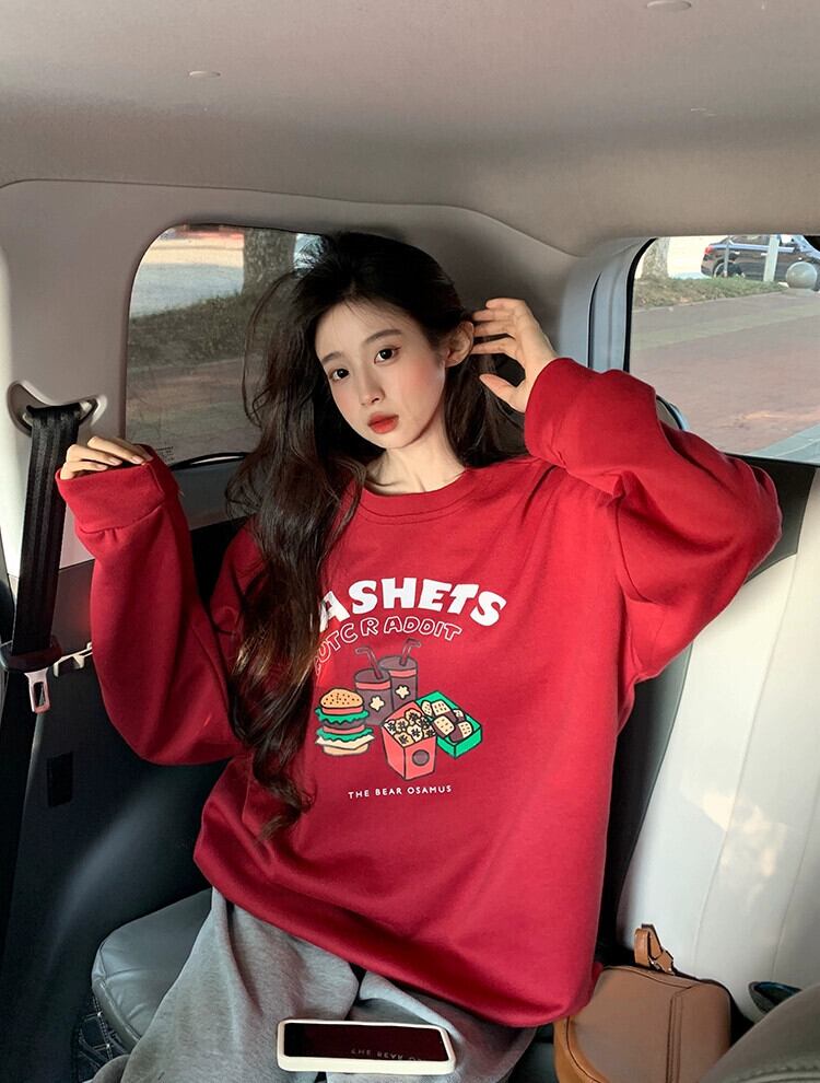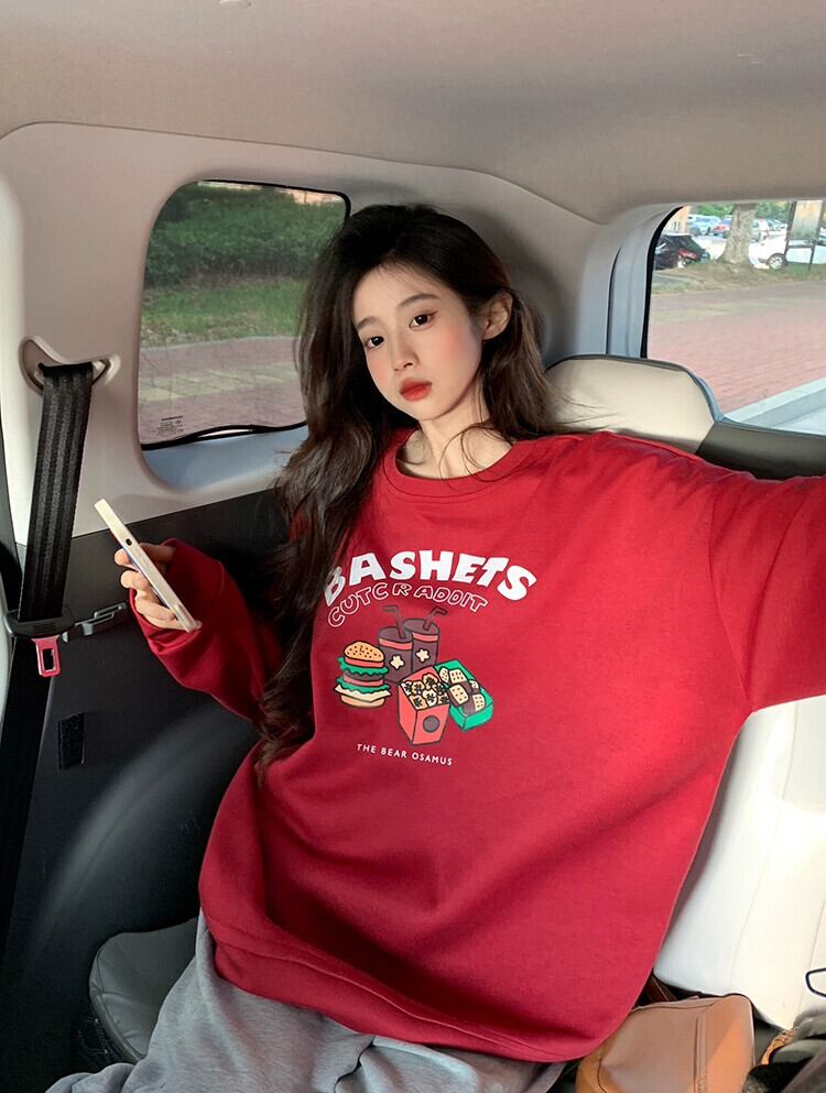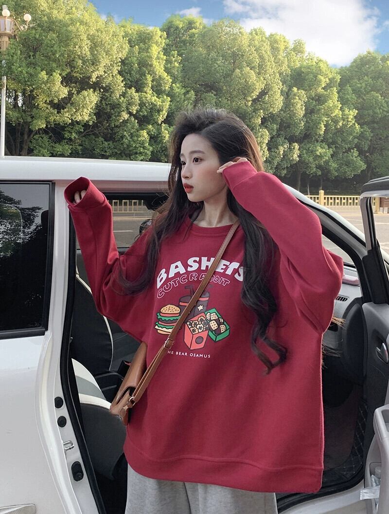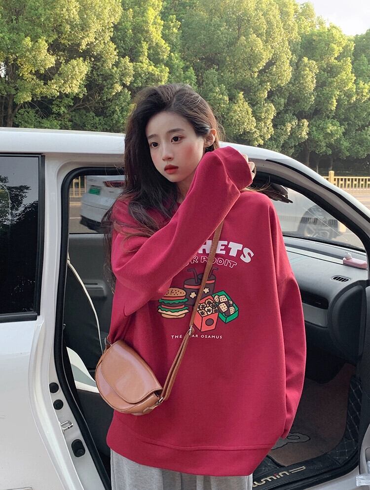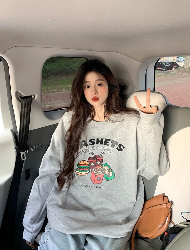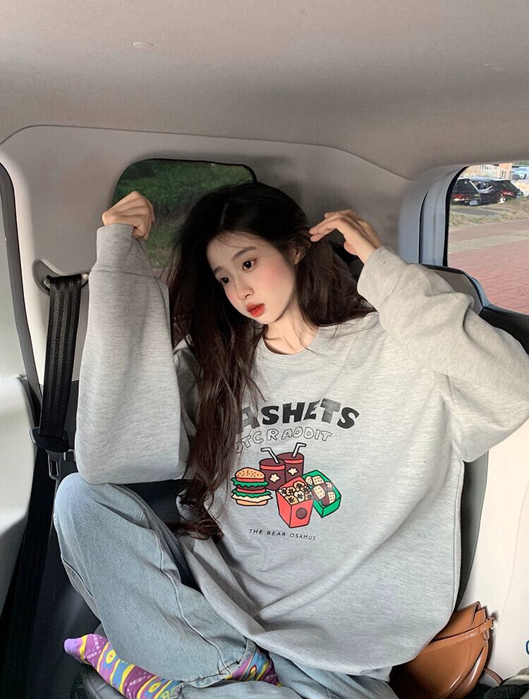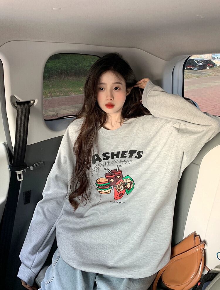 グレーのラウンドネックスウェットシャツフード付き女性の 2023 春と秋の新しいスタイルのルーズスタイル怠惰なスタイルのプリント長袖トップ ロング スプリング 春物 オータム 秋物 Oネック 7460036743492003 | framboise21