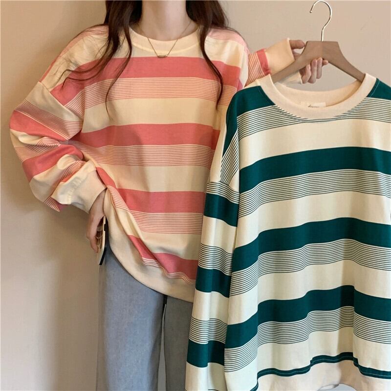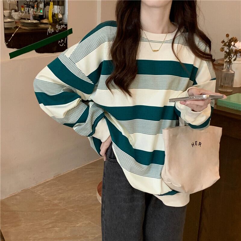 ミッドレングスのストライプのスウェットシャツの女性、春と秋の新しいスタイル、2023スタイル、スタイリッシュ、ルーズ、レイジー、ラウンドネック、長袖トップ ロング スプリング 春物 オータム 秋物 Oネック 746003352465442 | framboise21