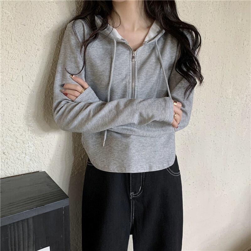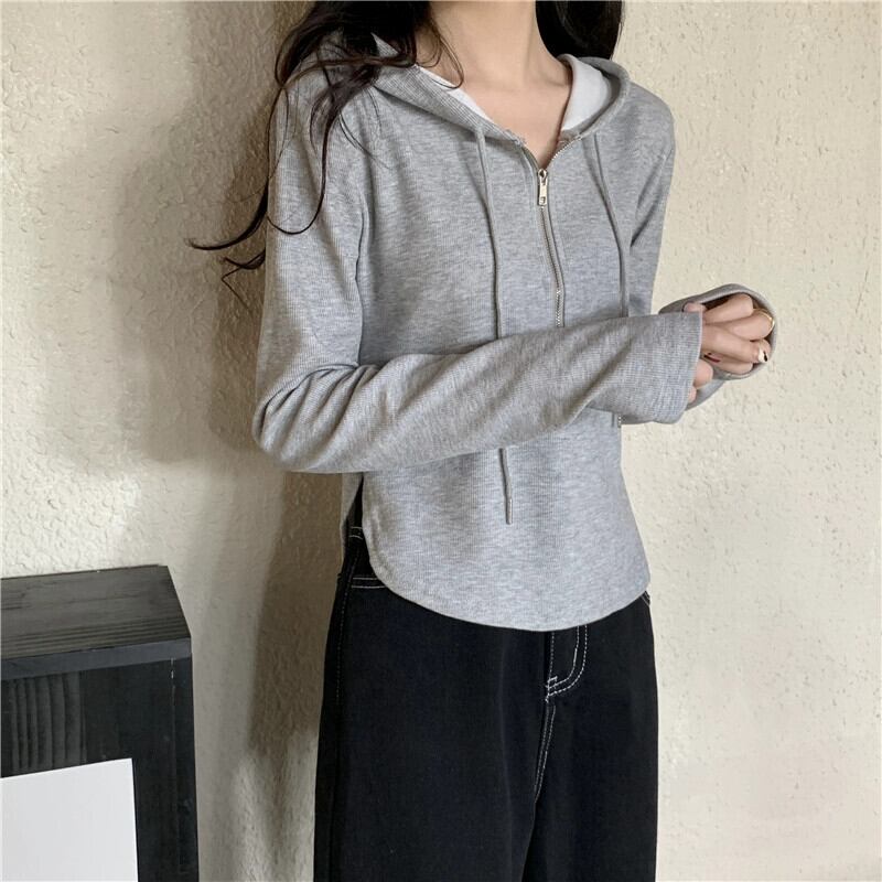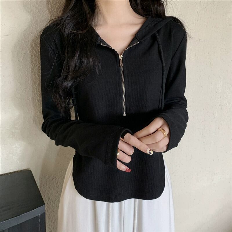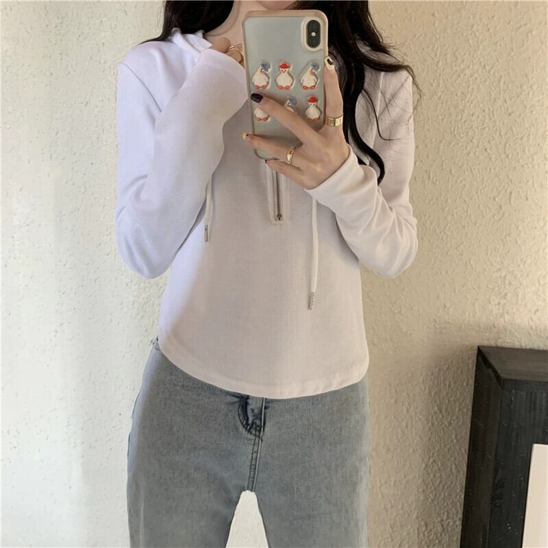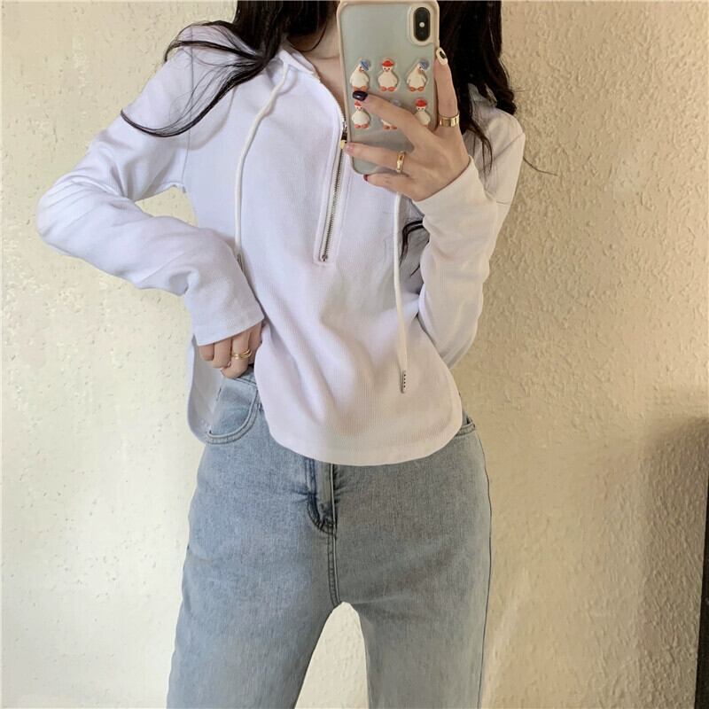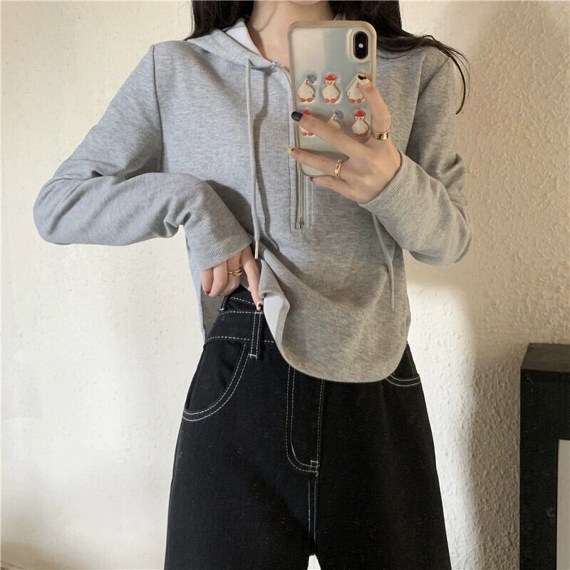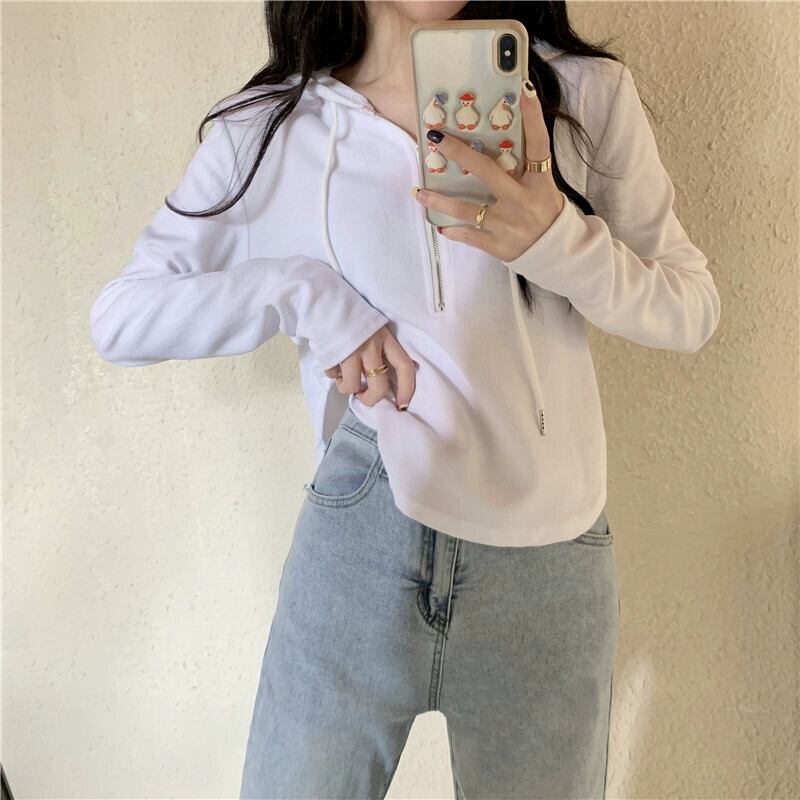 ハーフジップフード付き長袖Tシャツスウェットシャツレディース、春と秋のデザイン、スリム、不規則なカーブのショートトップ ロング スプリング 春物 オータム 秋物 7460024010152106 | framboise21