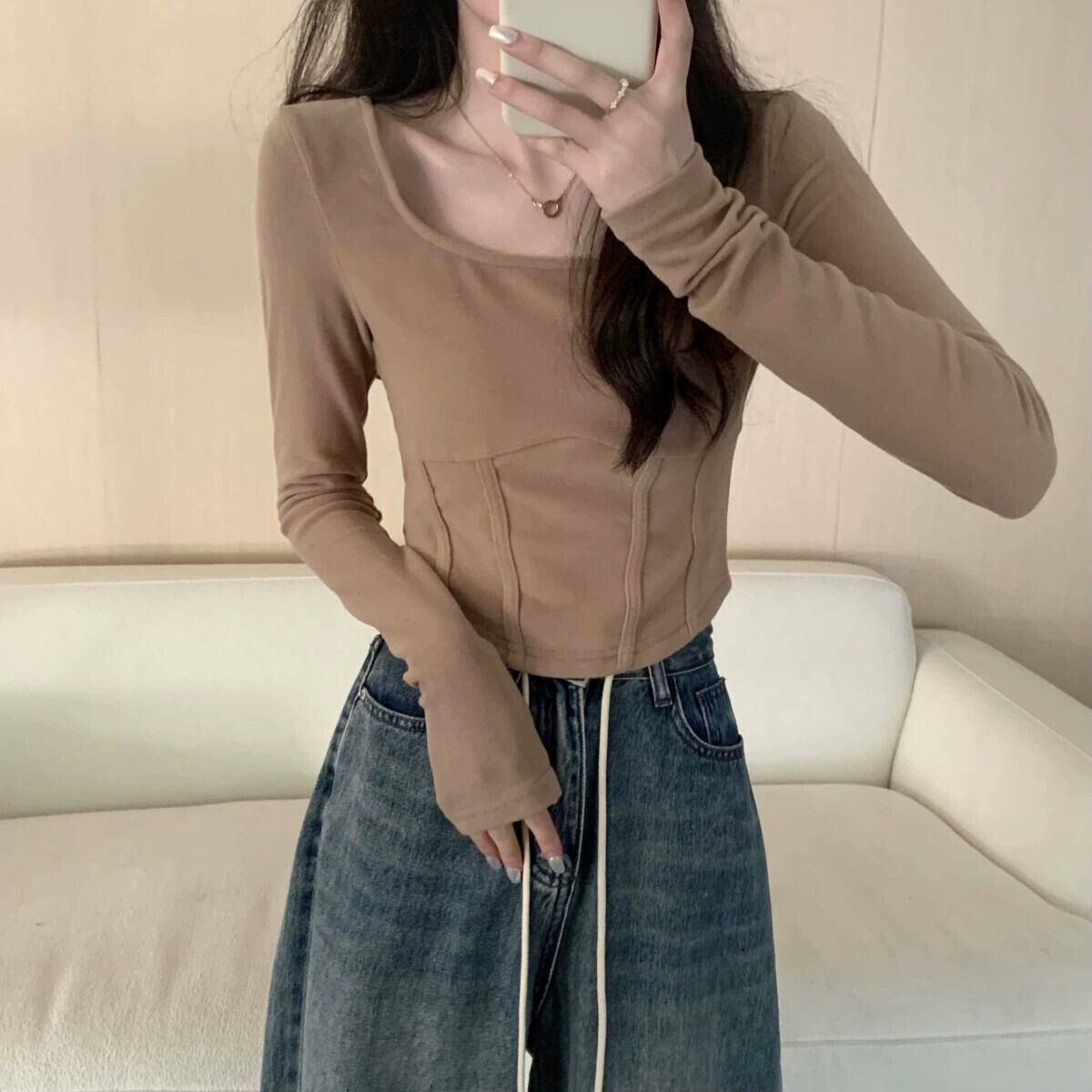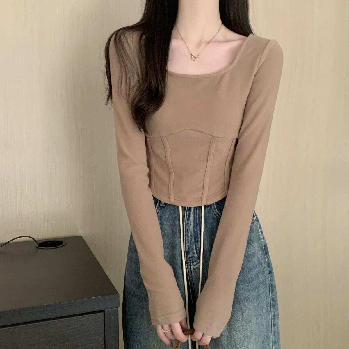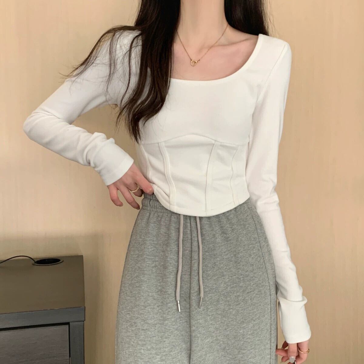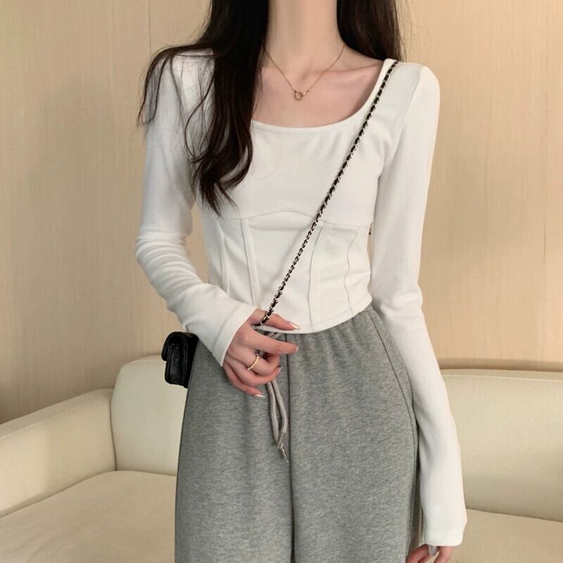 春と秋の短い長袖トップスの女性、ファッショナブルでスリム、スクエアネックのボトムシャツ、小柄な人、スリムフィットのインナーTシャツ、白 ショート ロング ホワイト スプリング 春物 オータム 秋物 スクウェア 7460083618427592 | framboise21
