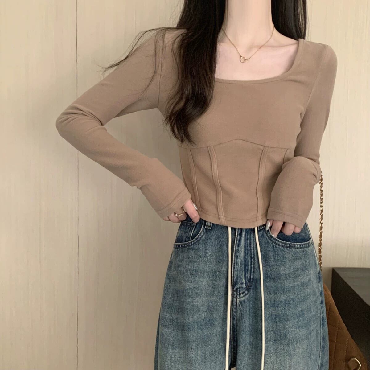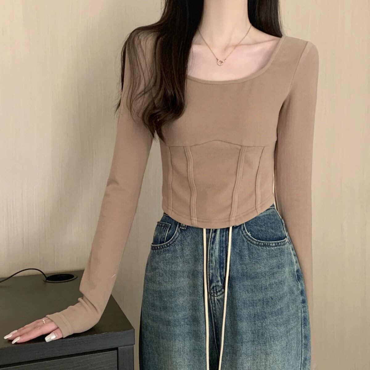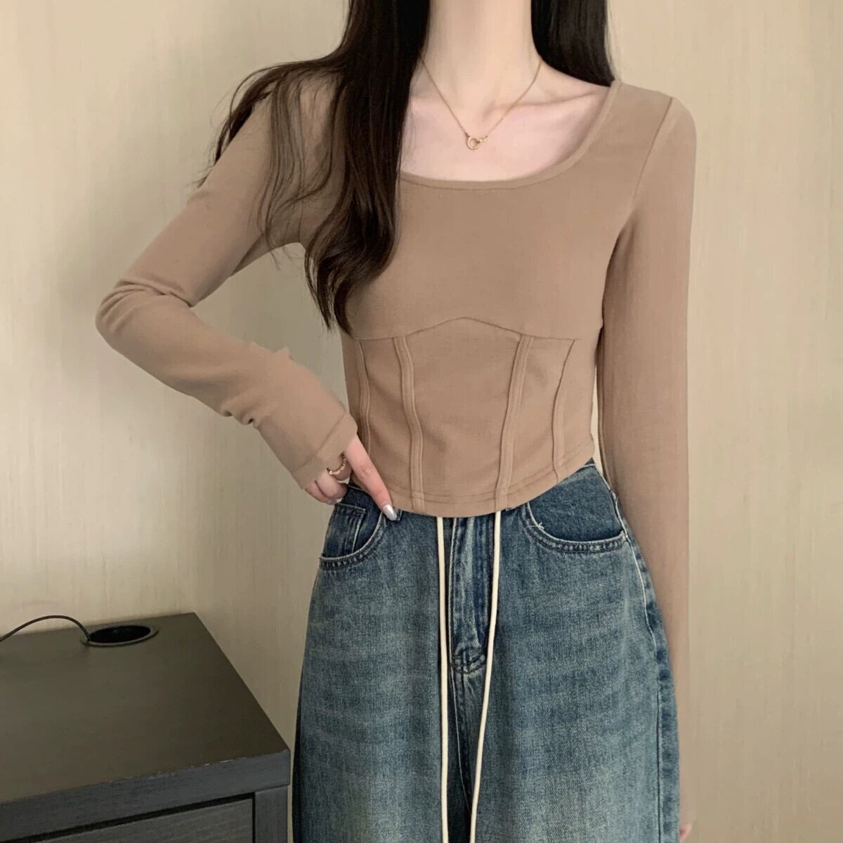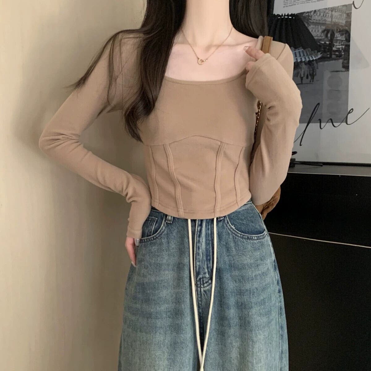 春と秋の短い長袖トップスの女性、ファッショナブルでスリム、スクエアネックのボトムシャツ、小柄な人、スリムフィットのインナーTシャツ、白 ショート ロング ホワイト スプリング 春物 オータム 秋物 スクウェア 7460083618427592 | framboise21