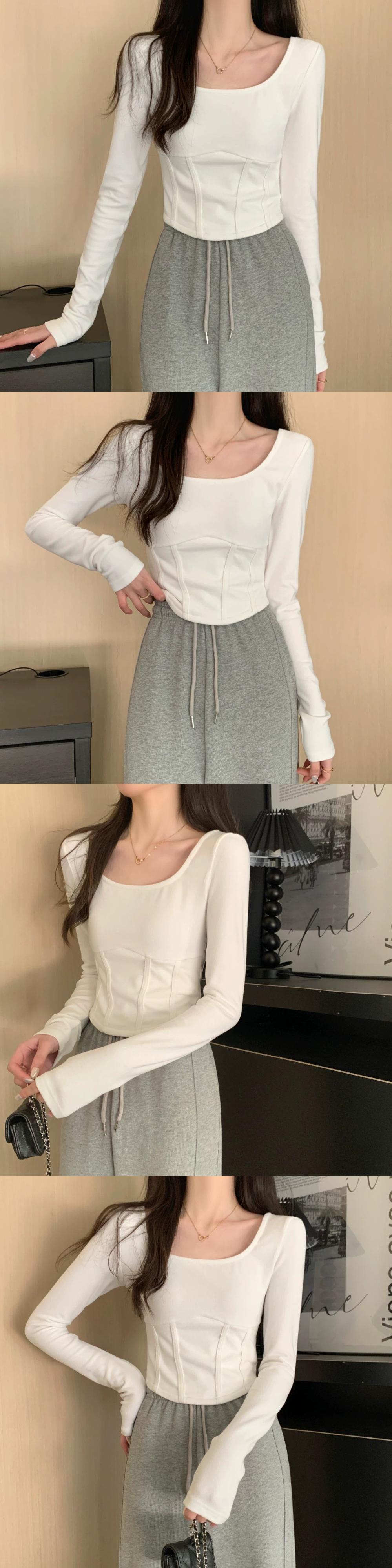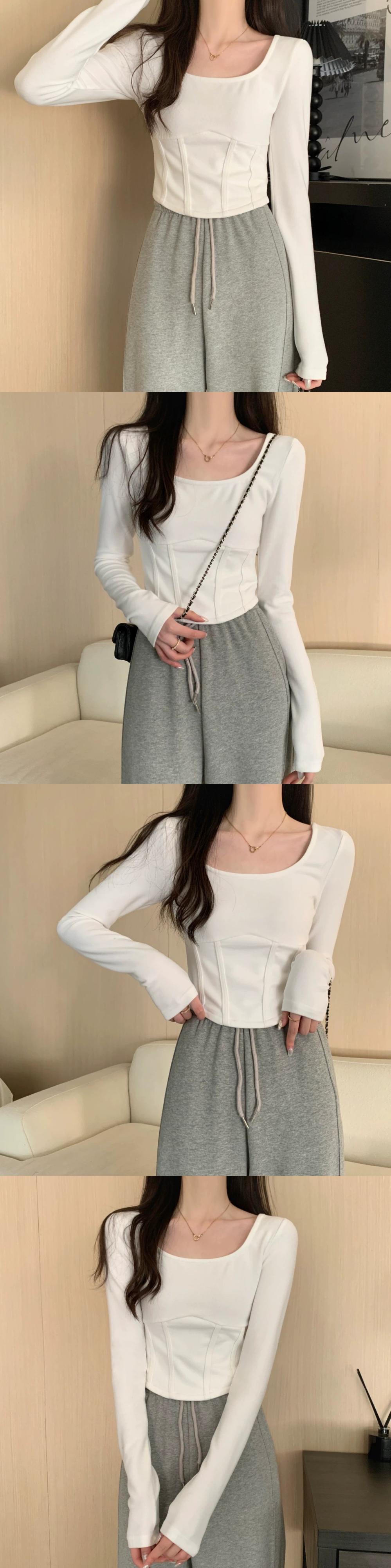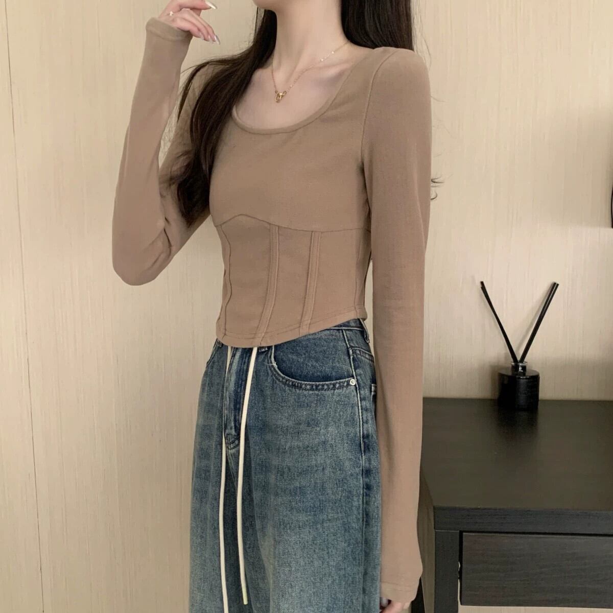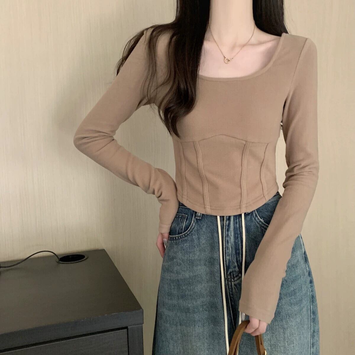 春と秋の短い長袖トップスの女性、ファッショナブルでスリム、スクエアネックのボトムシャツ、小柄な人、スリムフィットのインナーTシャツ、白 ショート ロング ホワイト スプリング 春物 オータム 秋物 スクウェア 7460083618427592 | framboise21