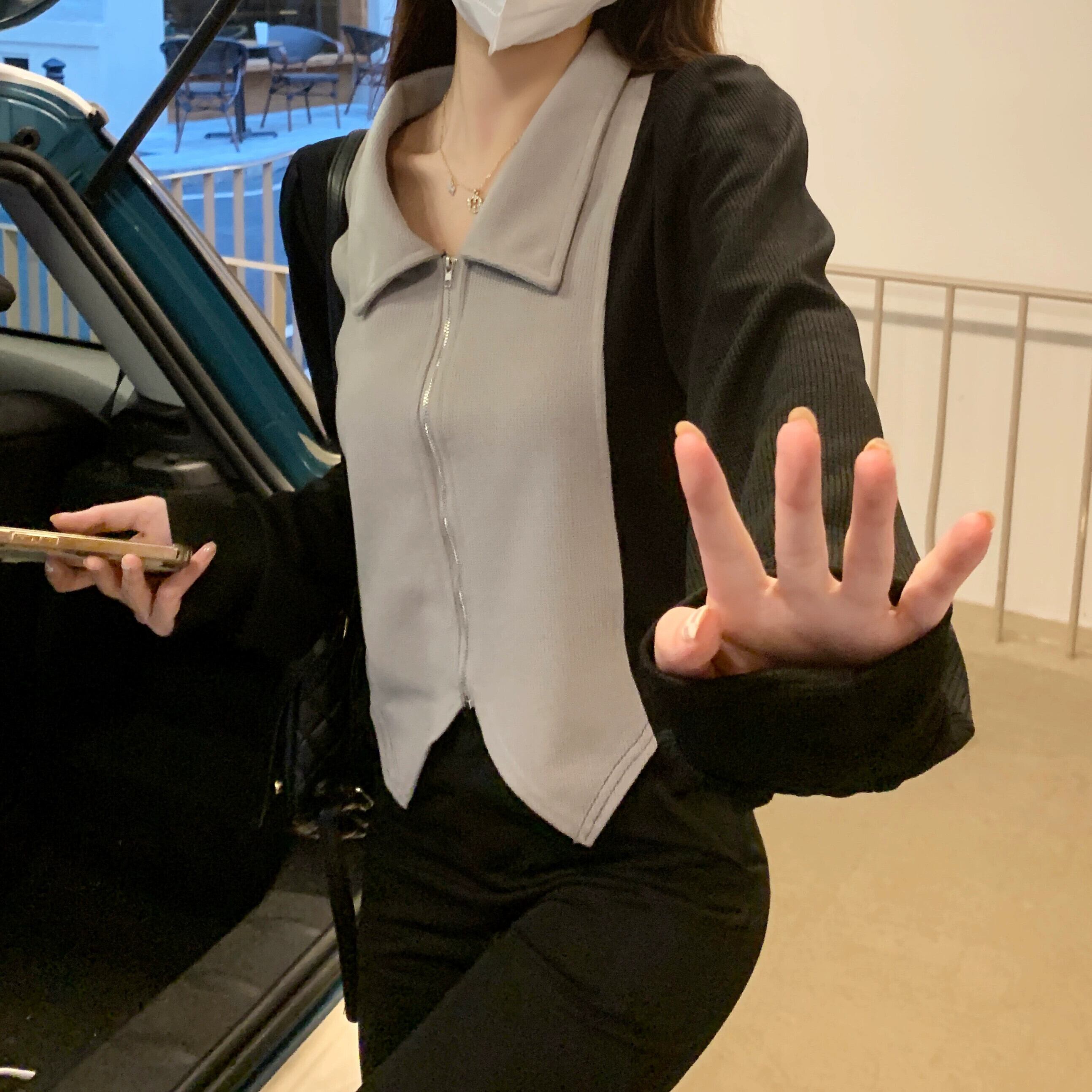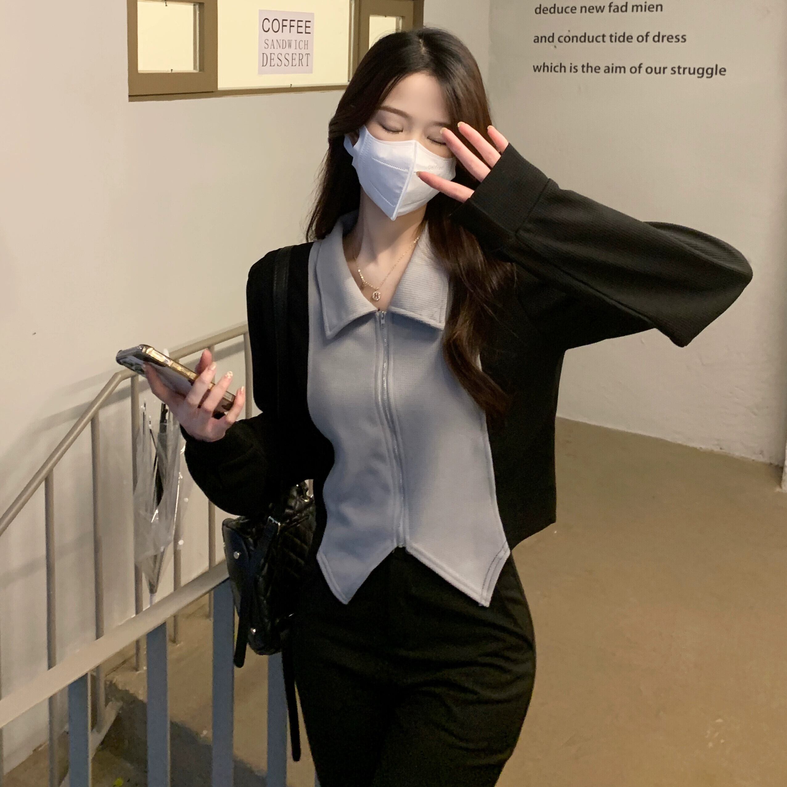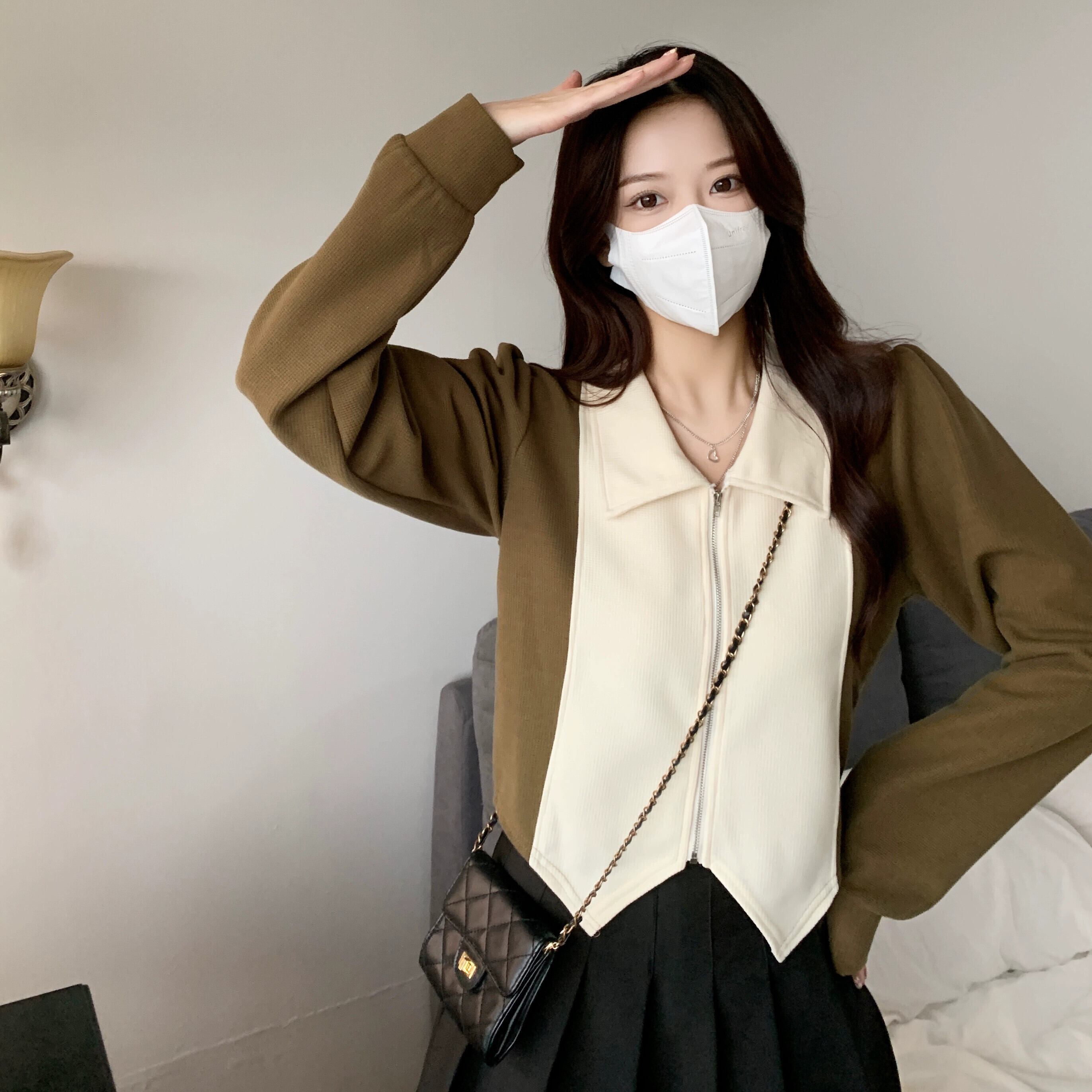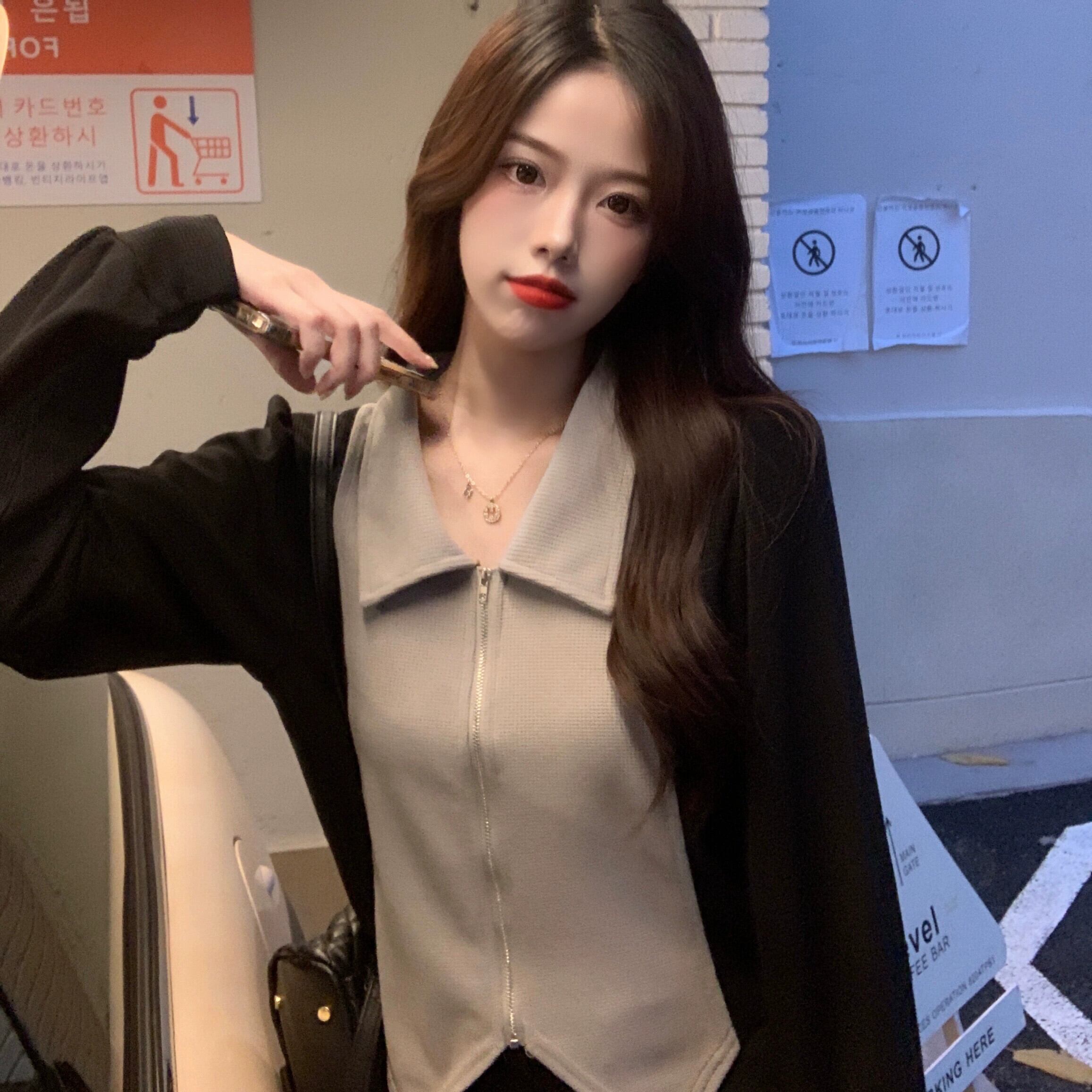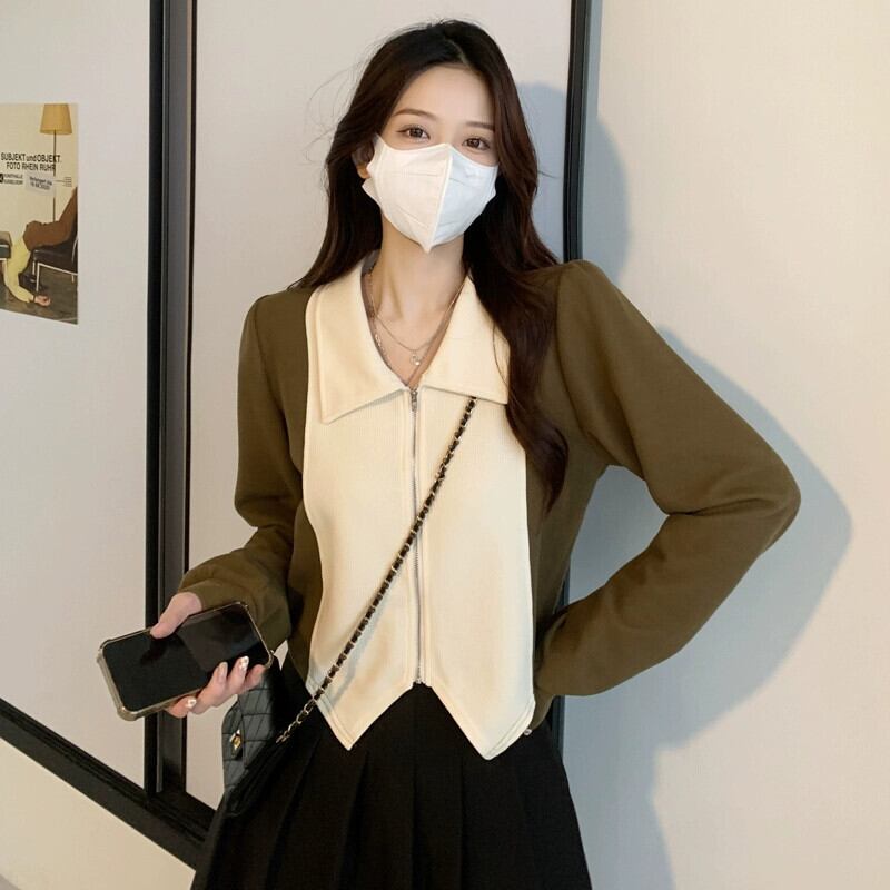 短い不規則なポロカラーカーディガンスウェットシャツ女性の春と秋のアメリカンレトロデザインスリムスリムジッパージャケット ショート スプリング 春物 オータム 秋物 7460091850241202 | framboise21