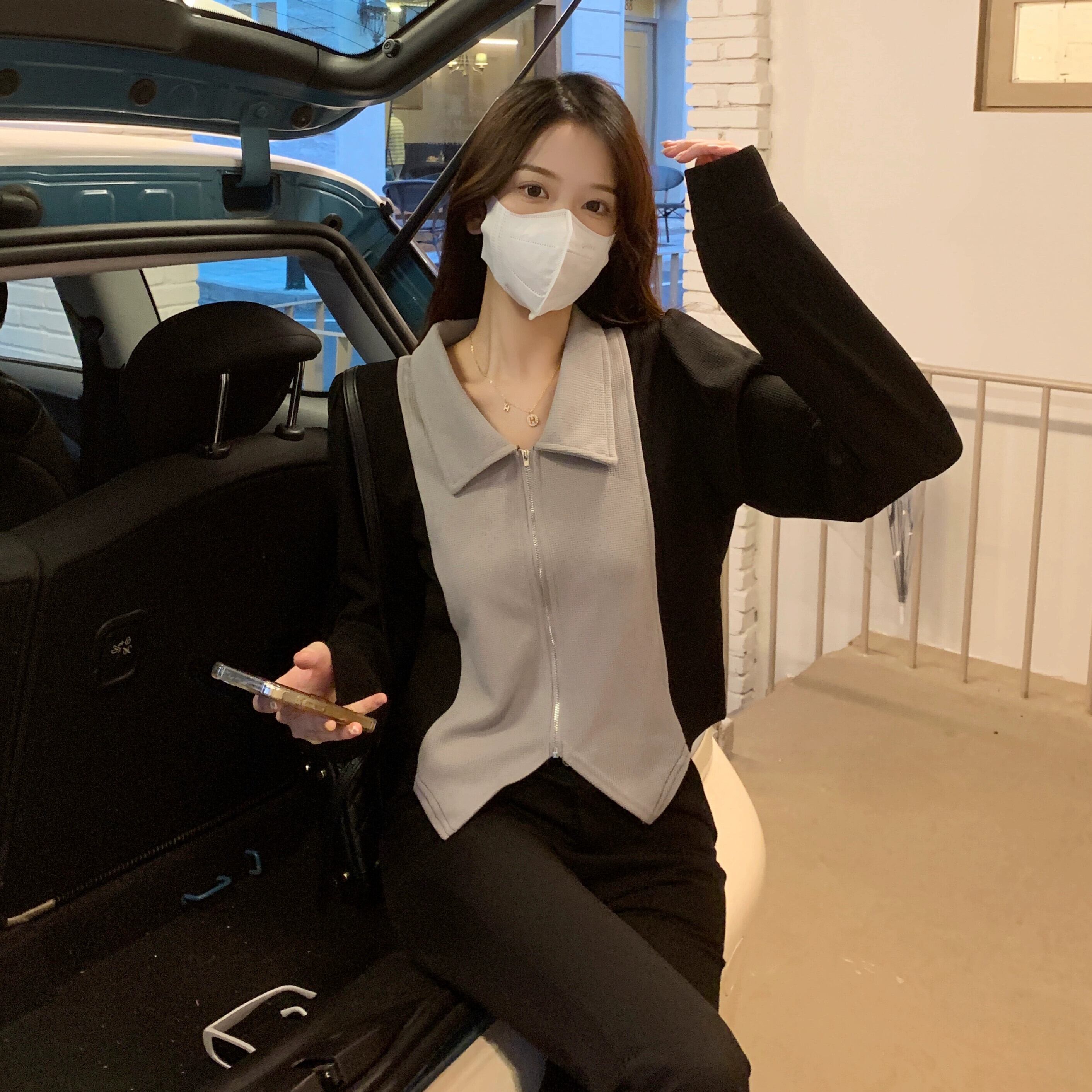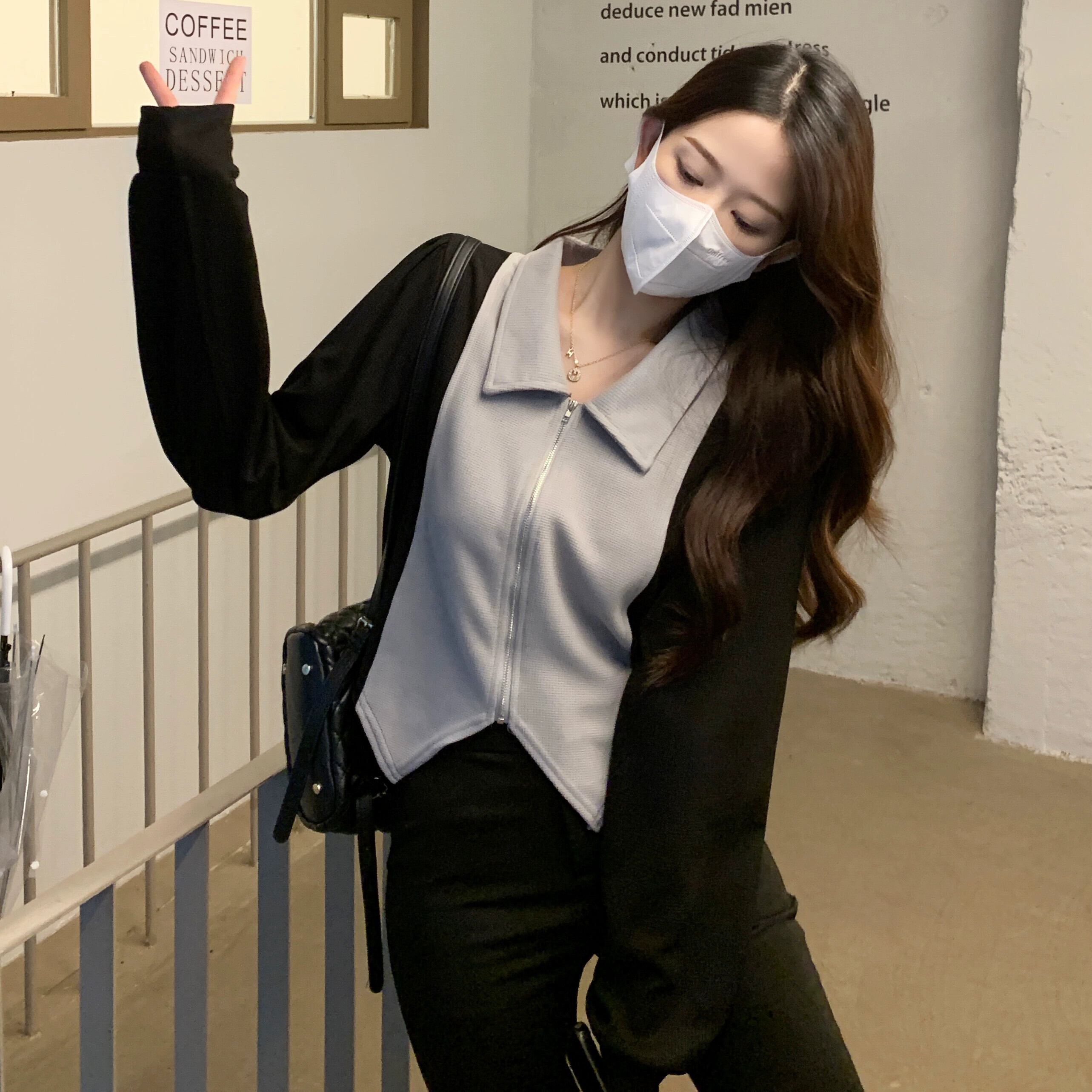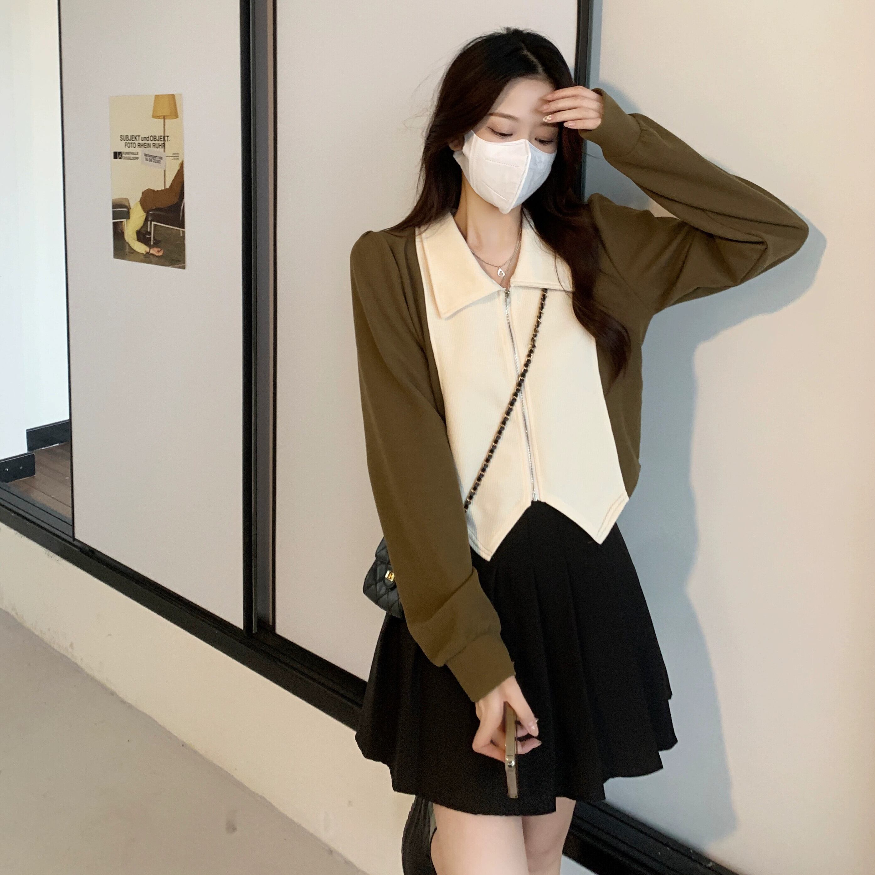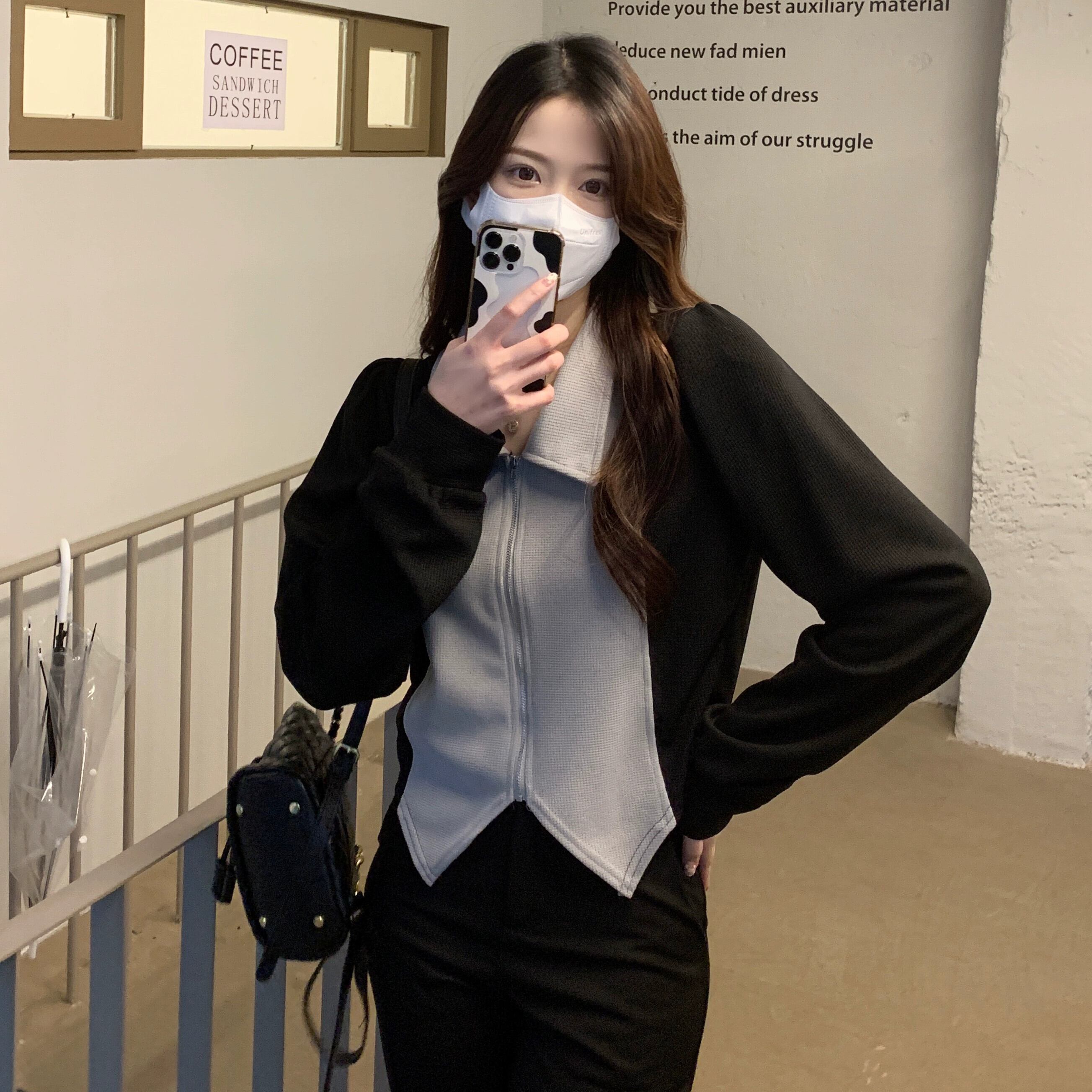 短い不規則なポロカラーカーディガンスウェットシャツ女性の春と秋のアメリカンレトロデザインスリムスリムジッパージャケット ショート スプリング 春物 オータム 秋物 7460091850241202 | framboise21