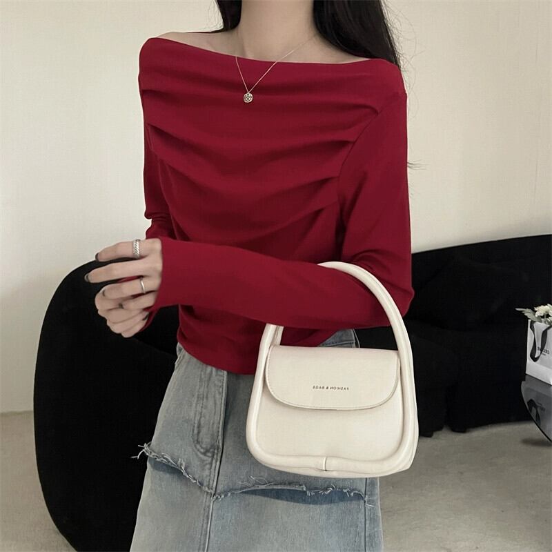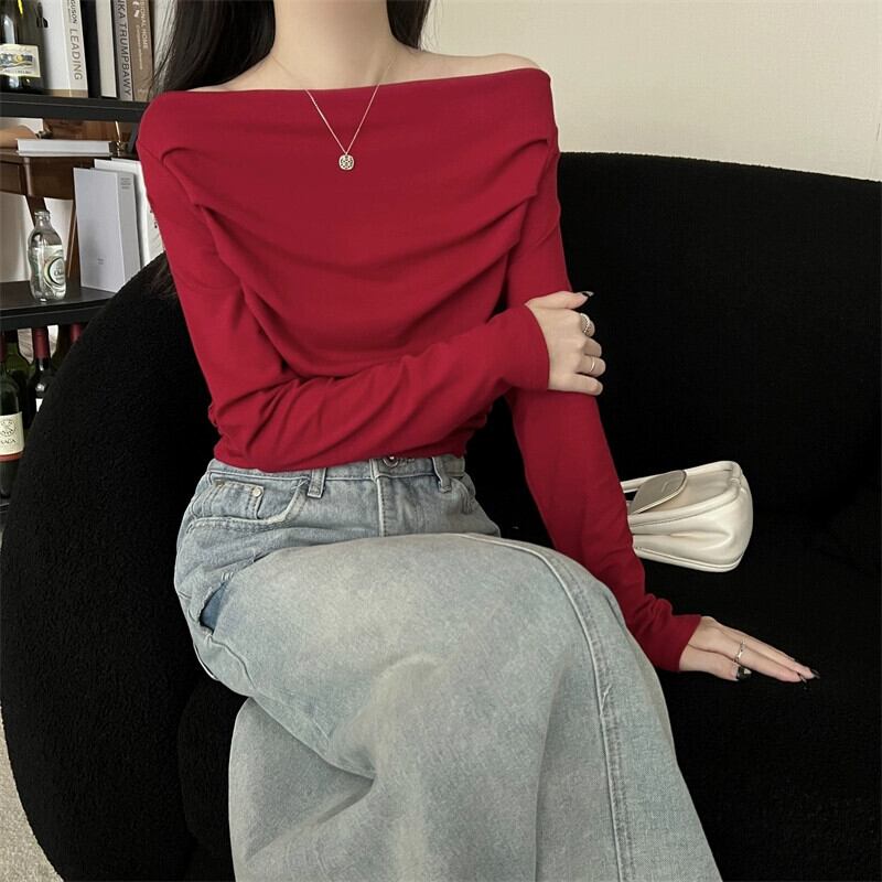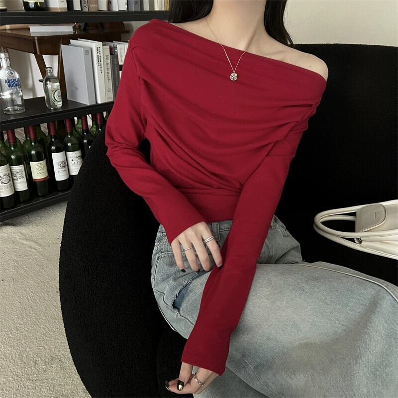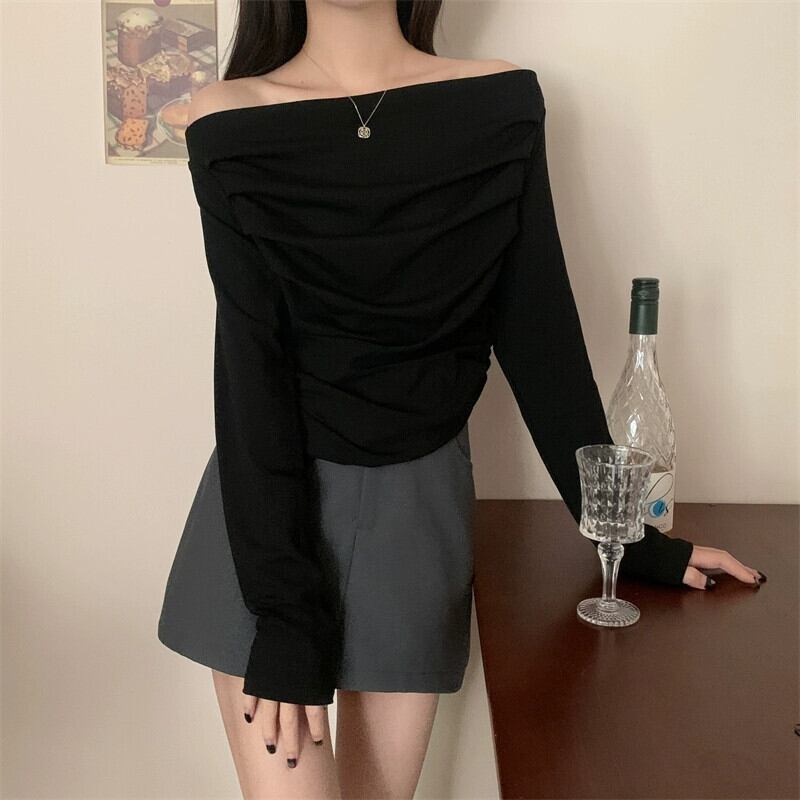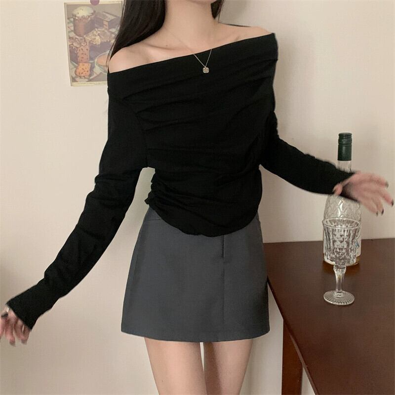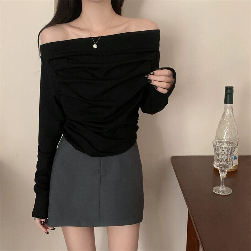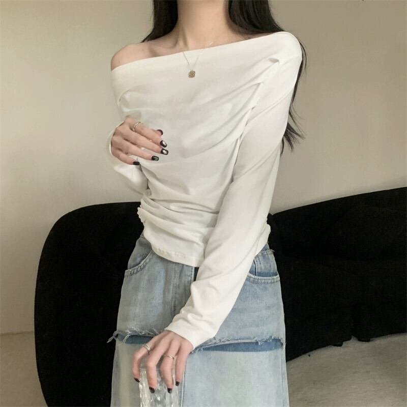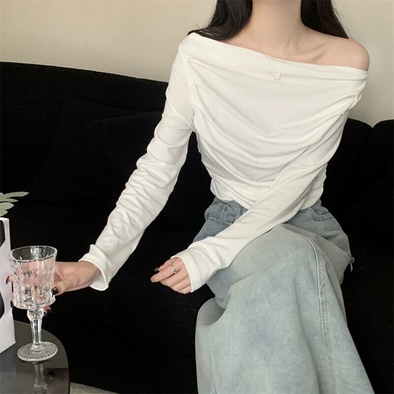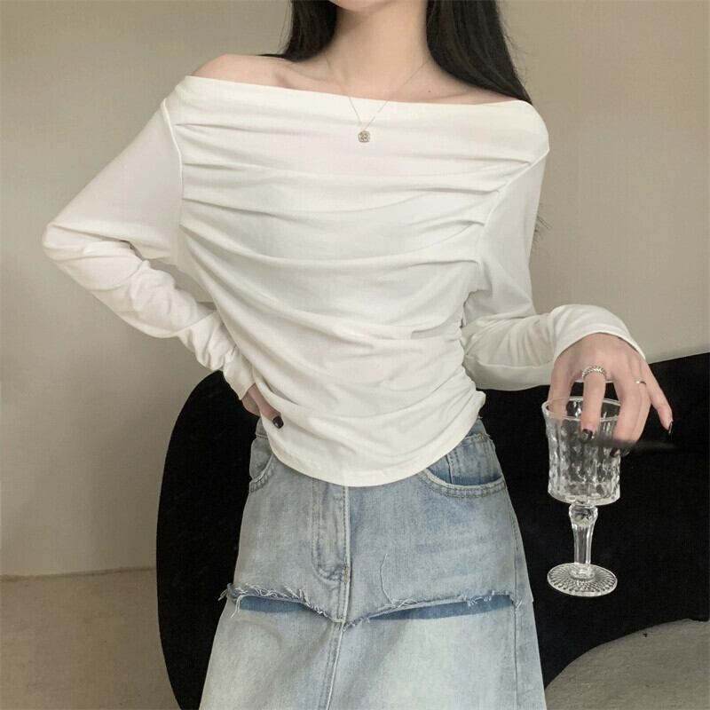 鎖骨ワンショルダートップ女性、2023春秋の新デザイン、西洋スタイル、スリムプリーツショート長袖Tシャツ ロング スプリング 春物 オータム 秋物 7460032488363730 | framboise21