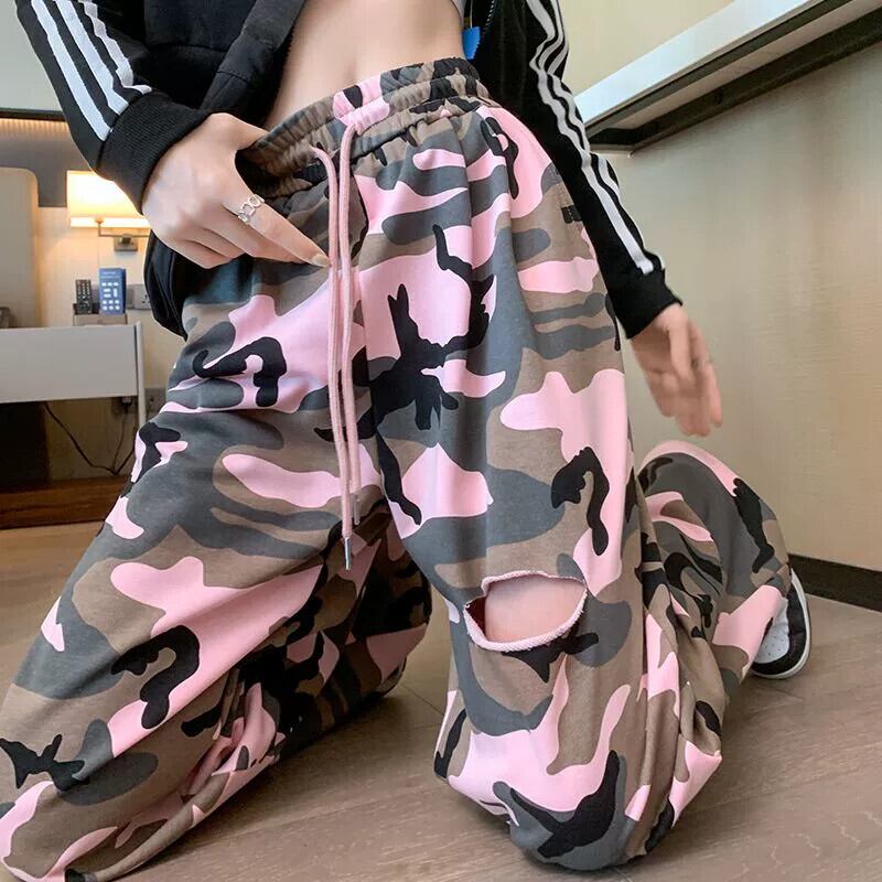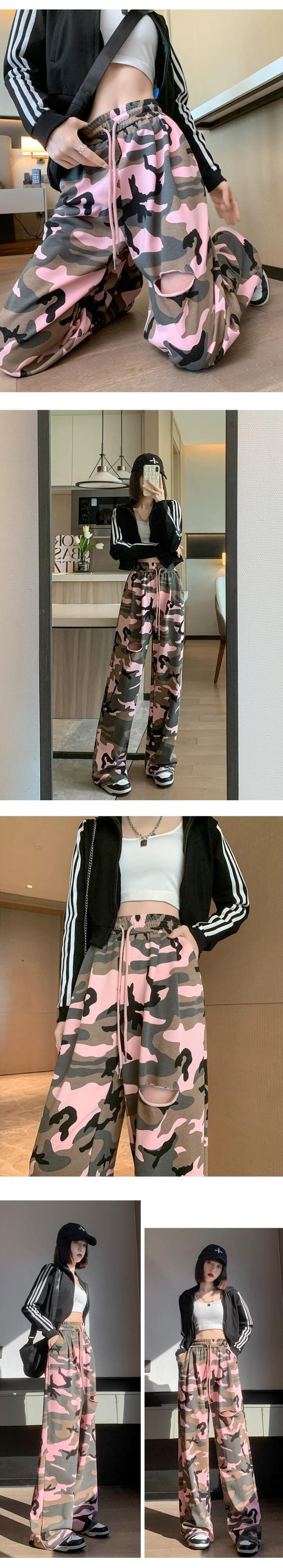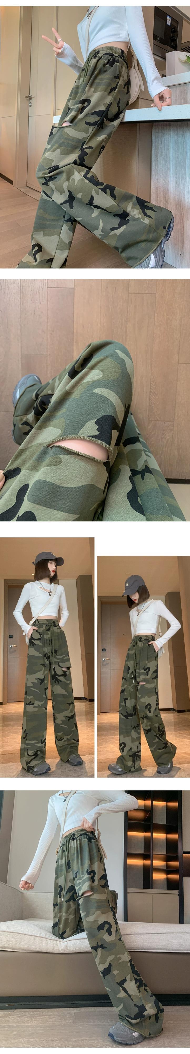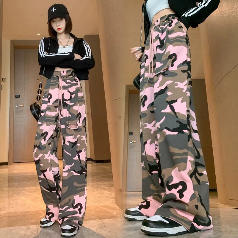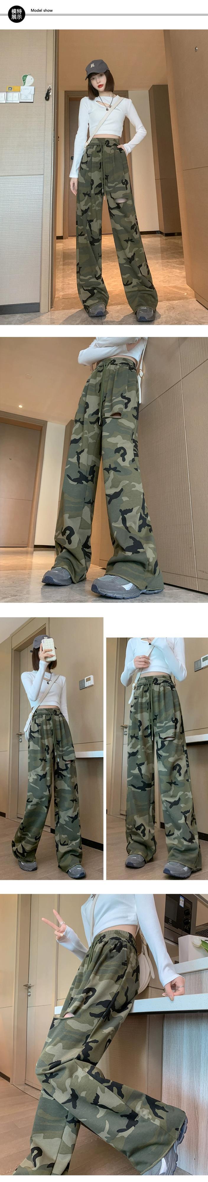 アメリカンスタイルのリップド迷彩ワイドレッグパンツレディース、春と秋のスタイルのハイウエストドレープパンツ、ルーズでスリムな、リップドストレートレッグカジュアルパンツ スプリング 春物 オータム 秋物 7460064268352480 | framboise21