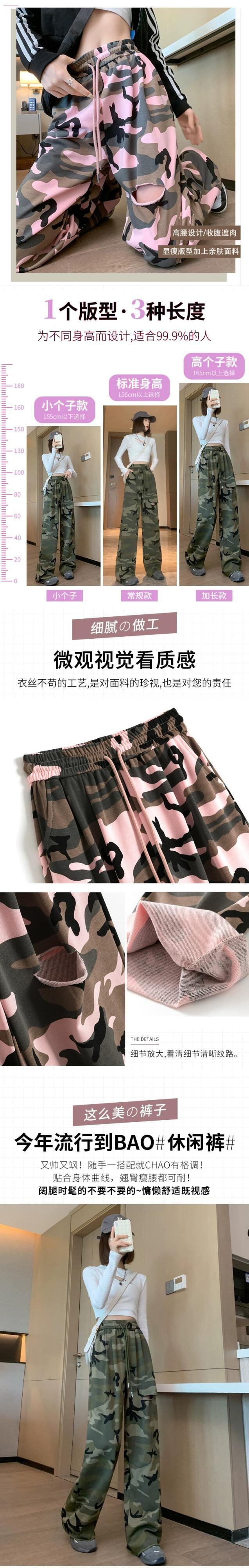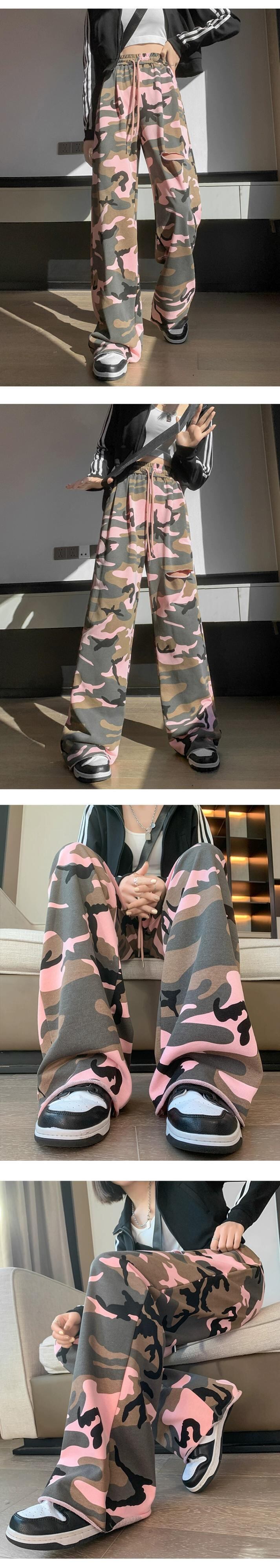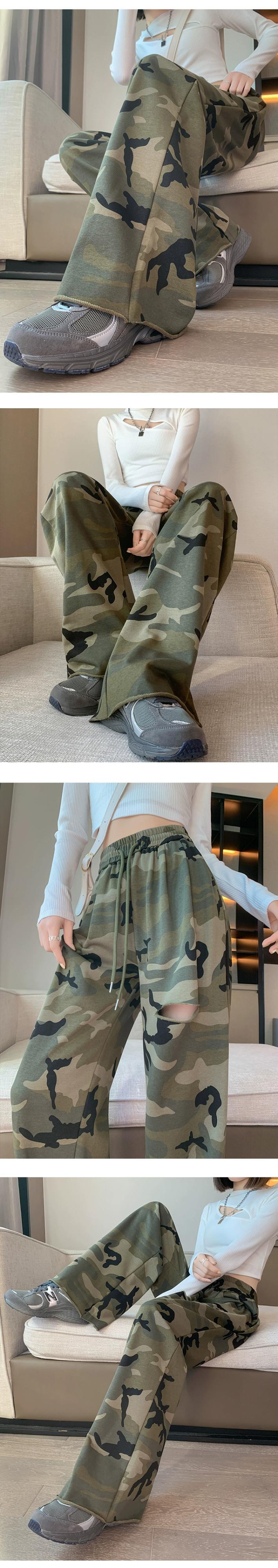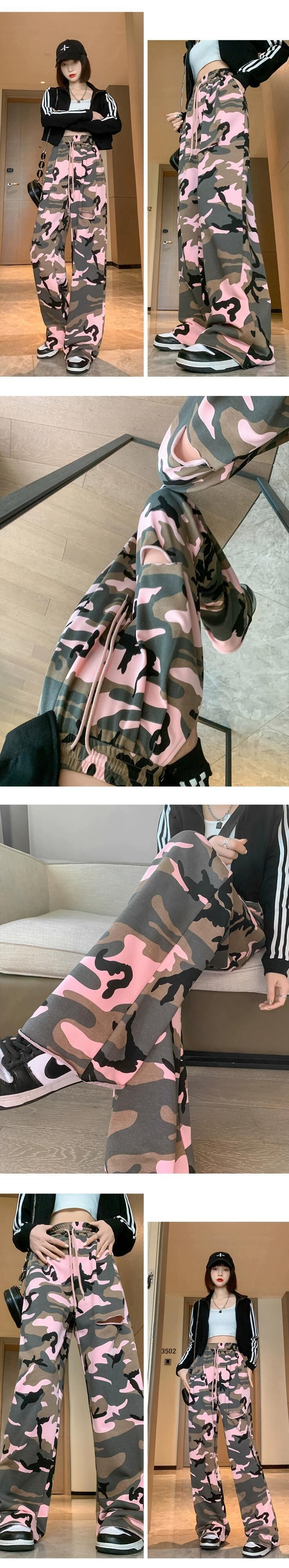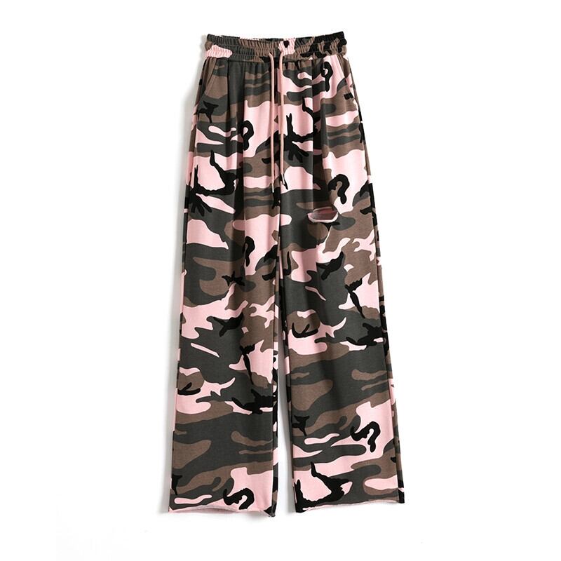 アメリカンスタイルのリップド迷彩ワイドレッグパンツレディース、春と秋のスタイルのハイウエストドレープパンツ、ルーズでスリムな、リップドストレートレッグカジュアルパンツ スプリング 春物 オータム 秋物 7460064268352480 | framboise21
