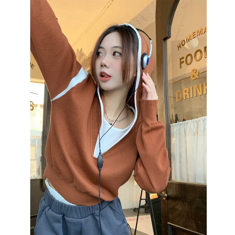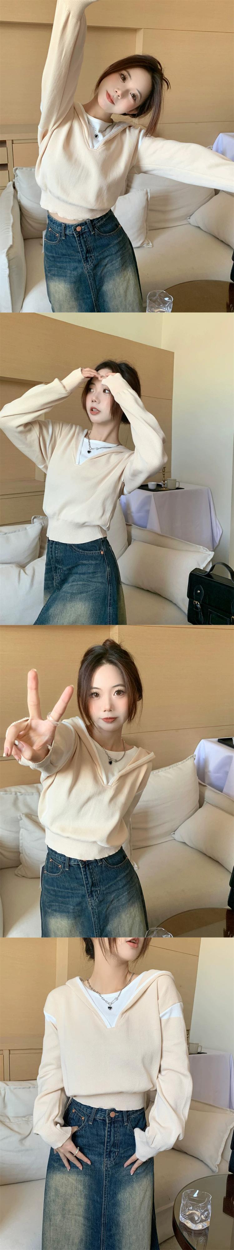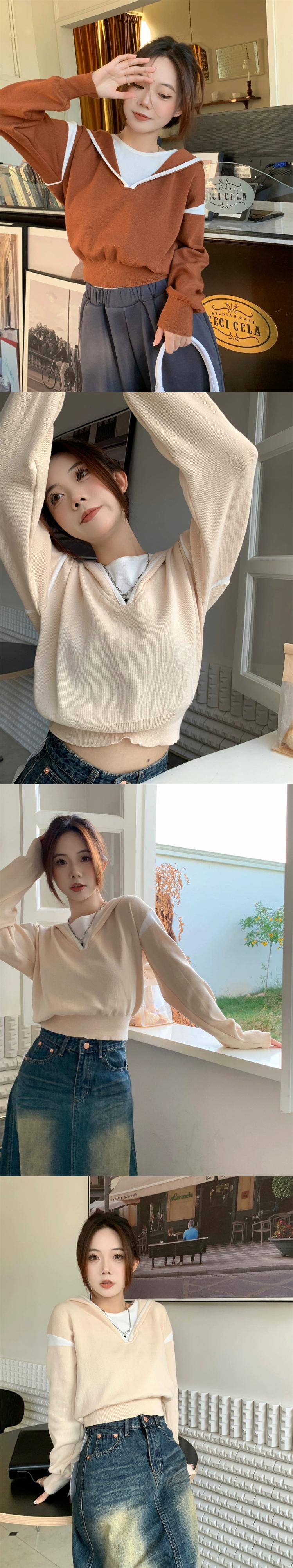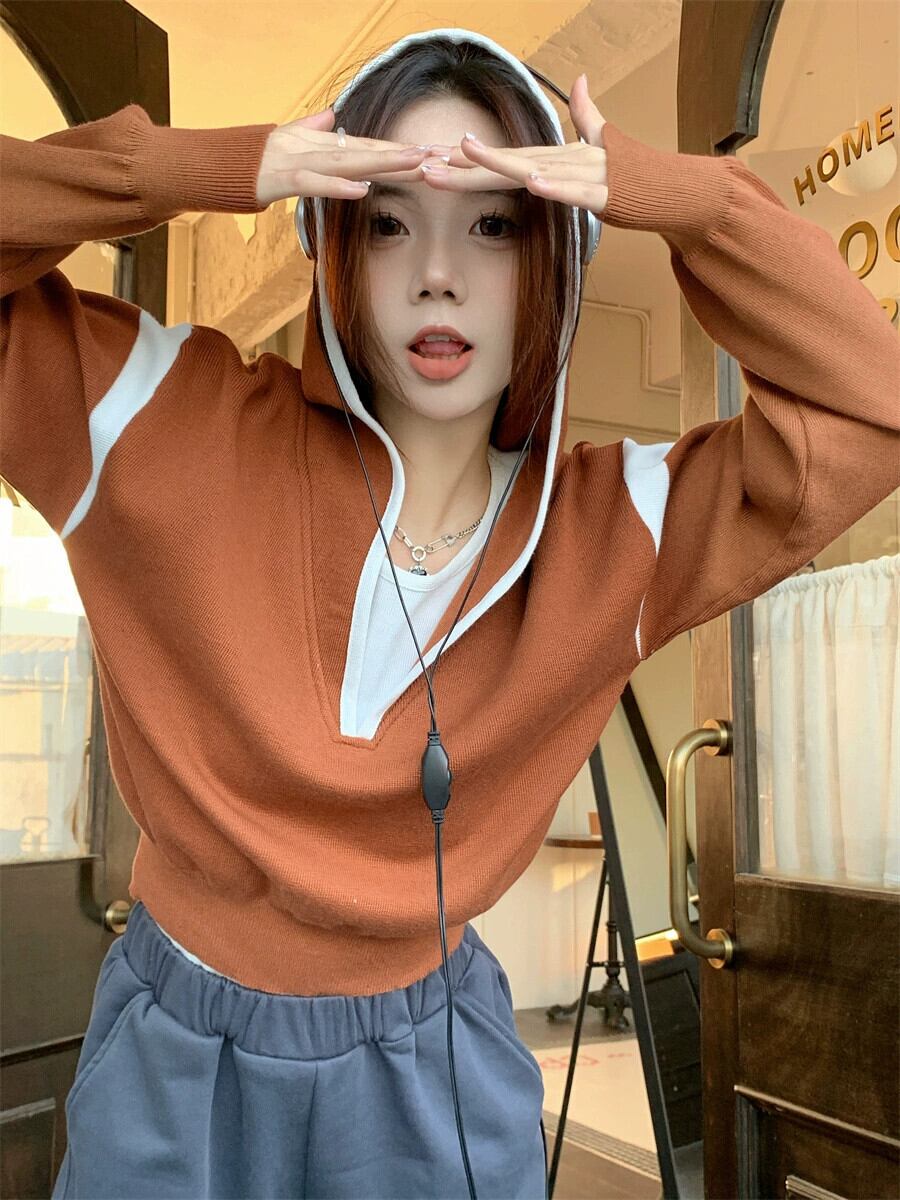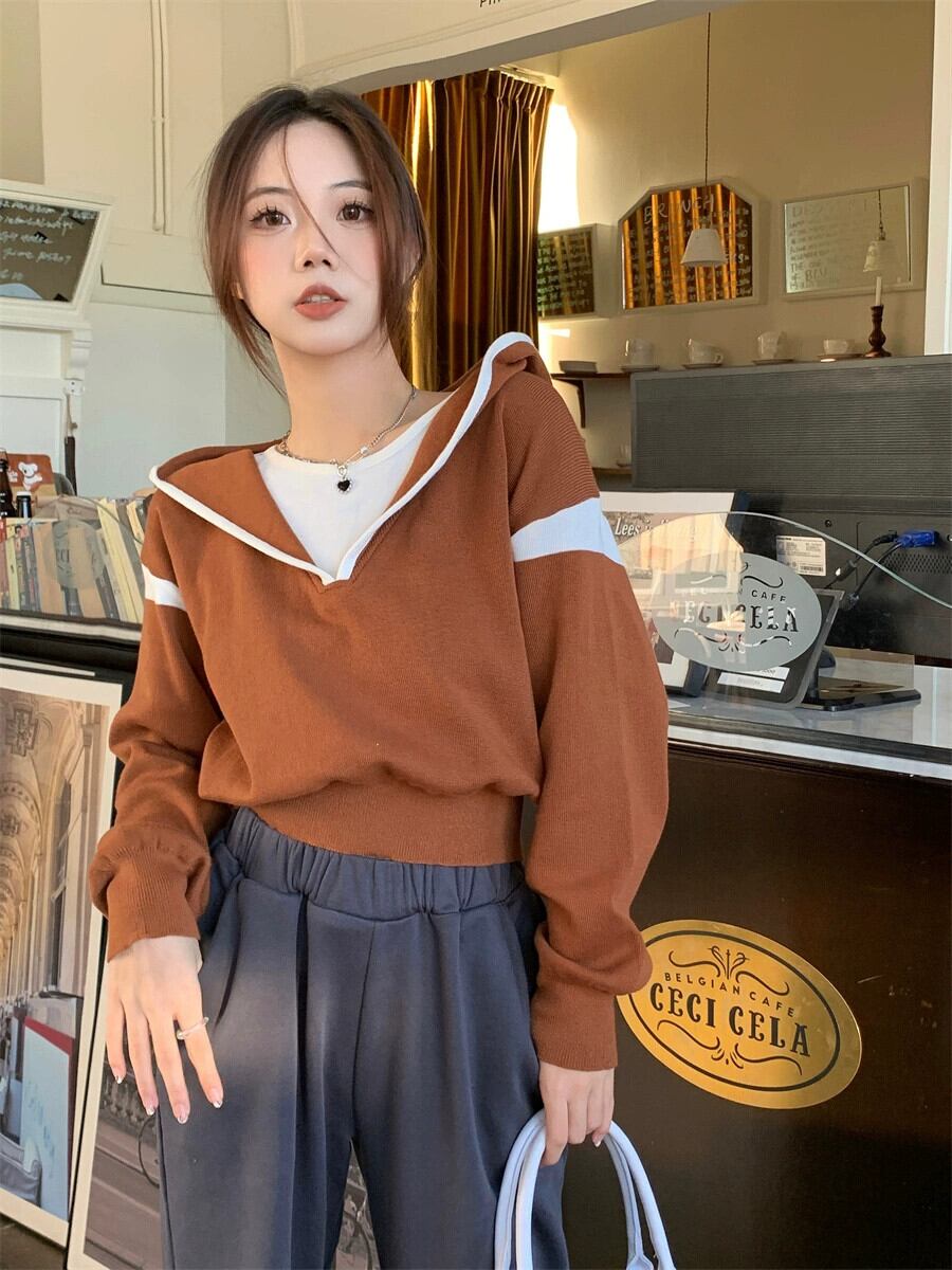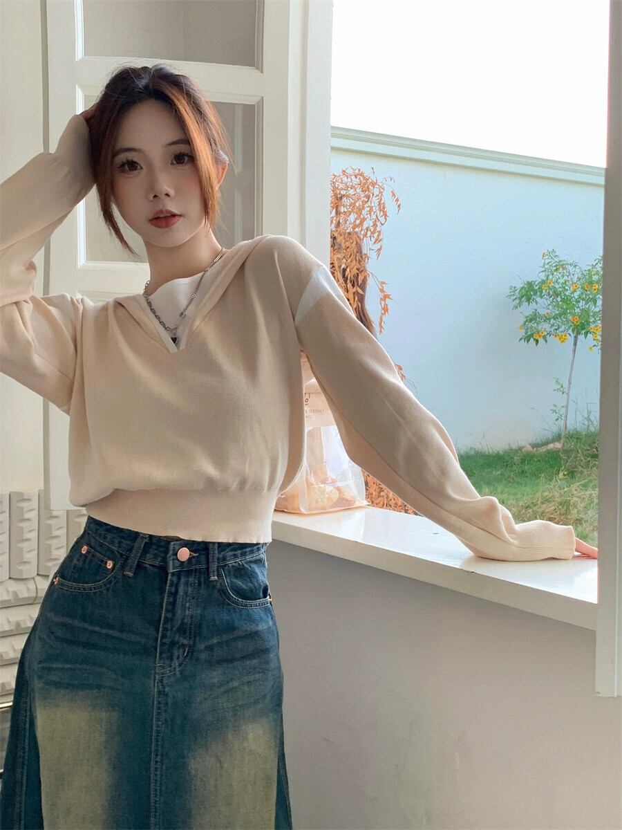 偽ツーピースフード付きセーター女性の秋と冬の 2023 新しいスタイルルーズアウターウェア小さな短い長袖セーター ショート ロング オータム 秋物 ウィンター 冬物 746008840391071 | framboise21