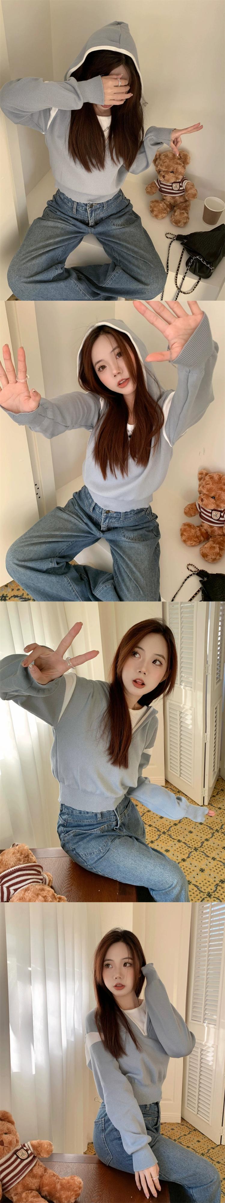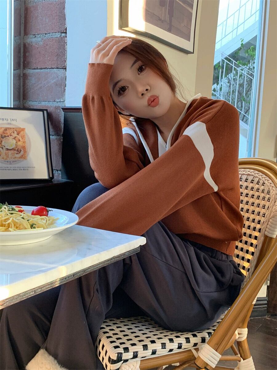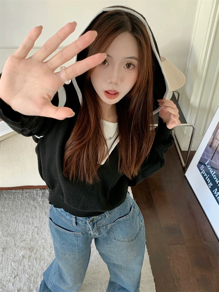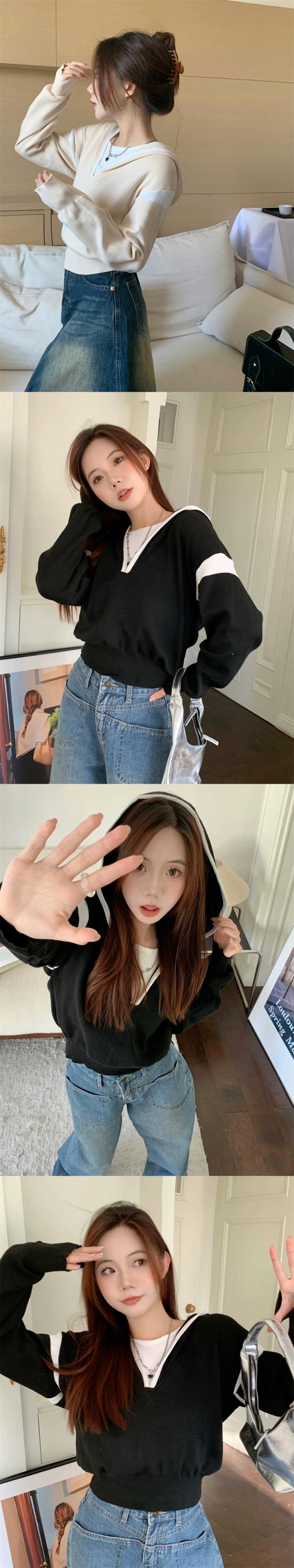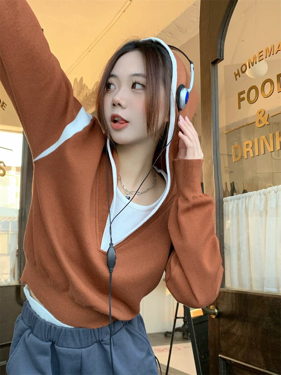 偽ツーピースフード付きセーター女性の秋と冬の 2023 新しいスタイルルーズアウターウェア小さな短い長袖セーター ショート ロング オータム 秋物 ウィンター 冬物 746008840391071 | framboise21