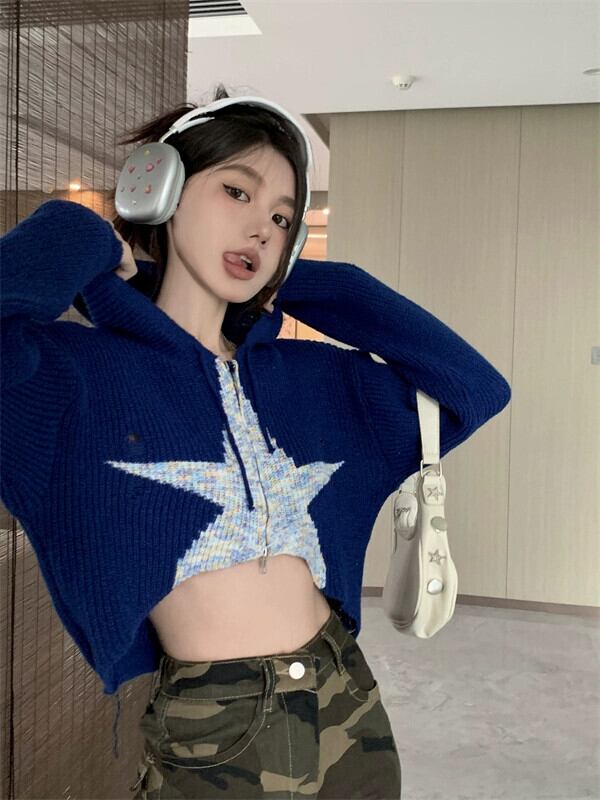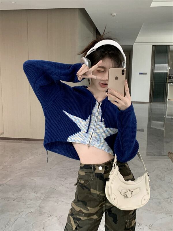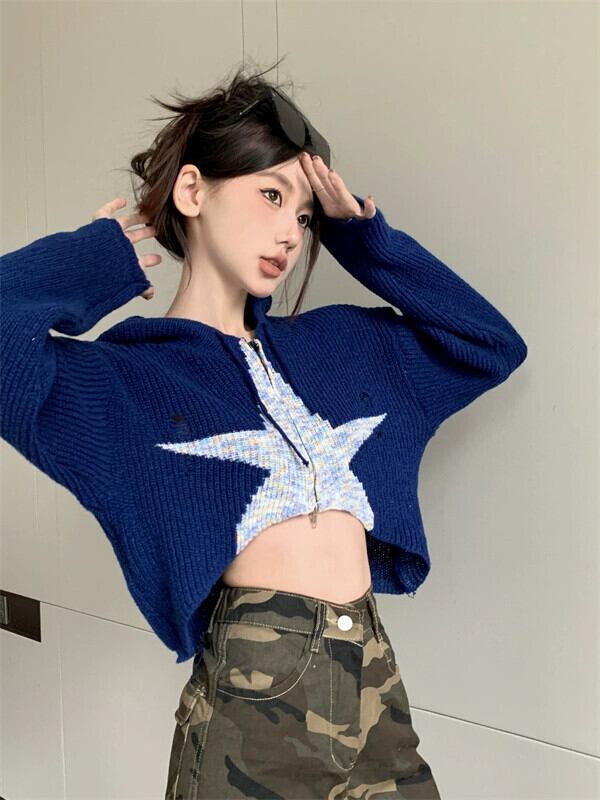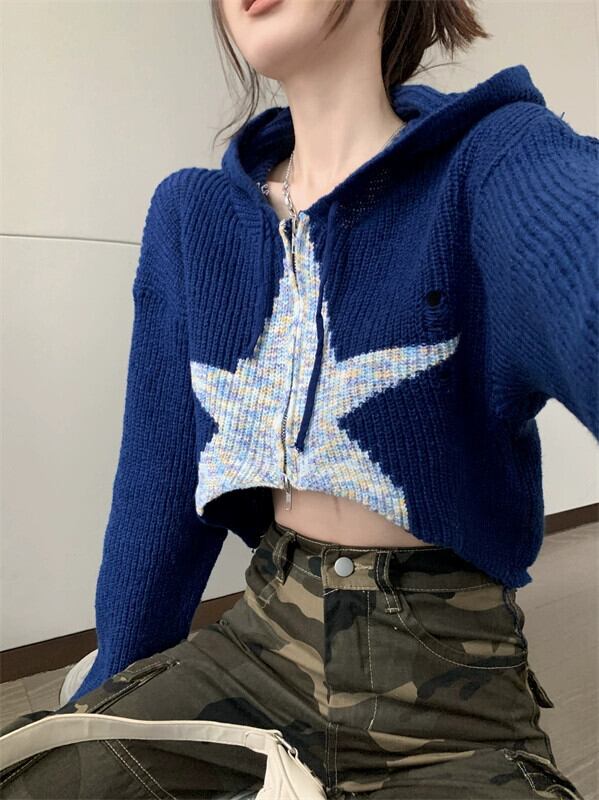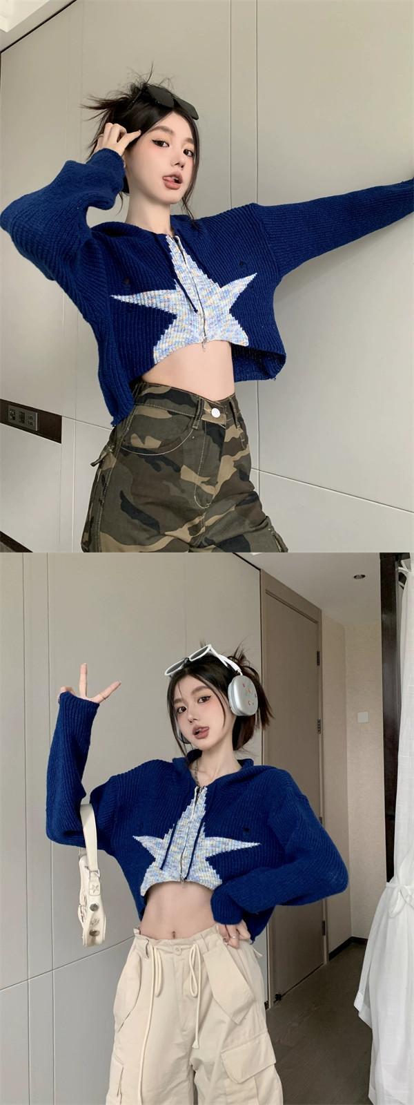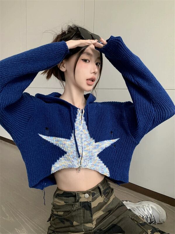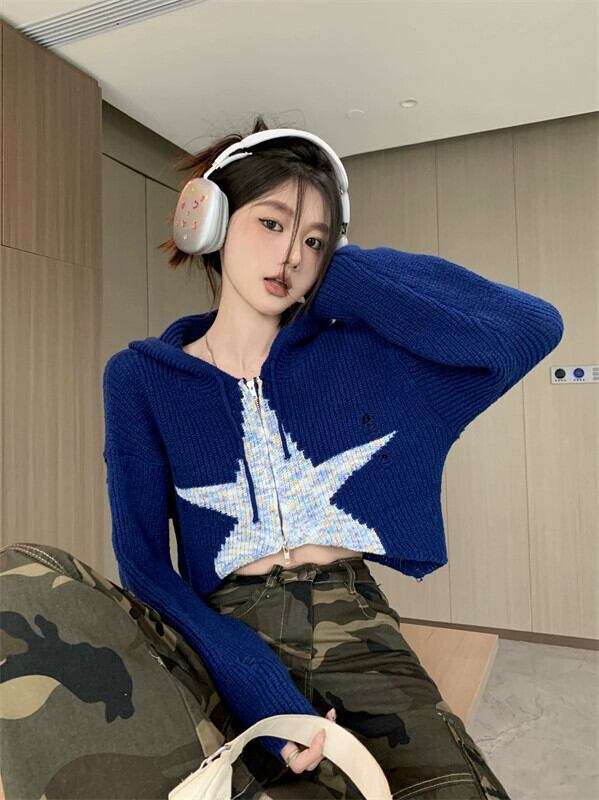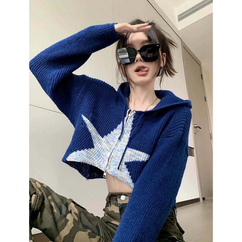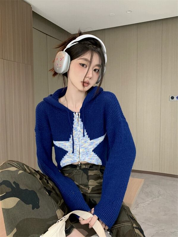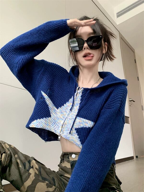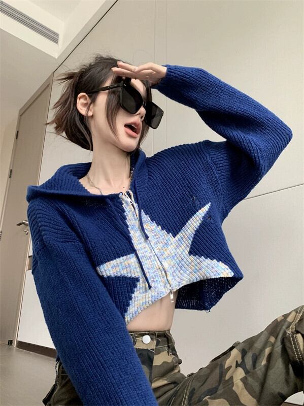 ジッパーフード付きカーディガンセータージャケット女性の秋と冬のレトロなルーズスリムアウターウェア長袖ハイウエストショートセーター ロング オータム 秋物 ウィンター 冬物 7460031393702926 | framboise21
