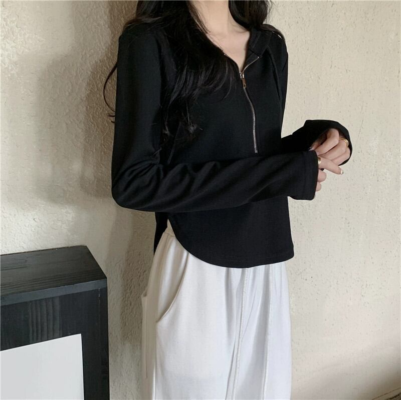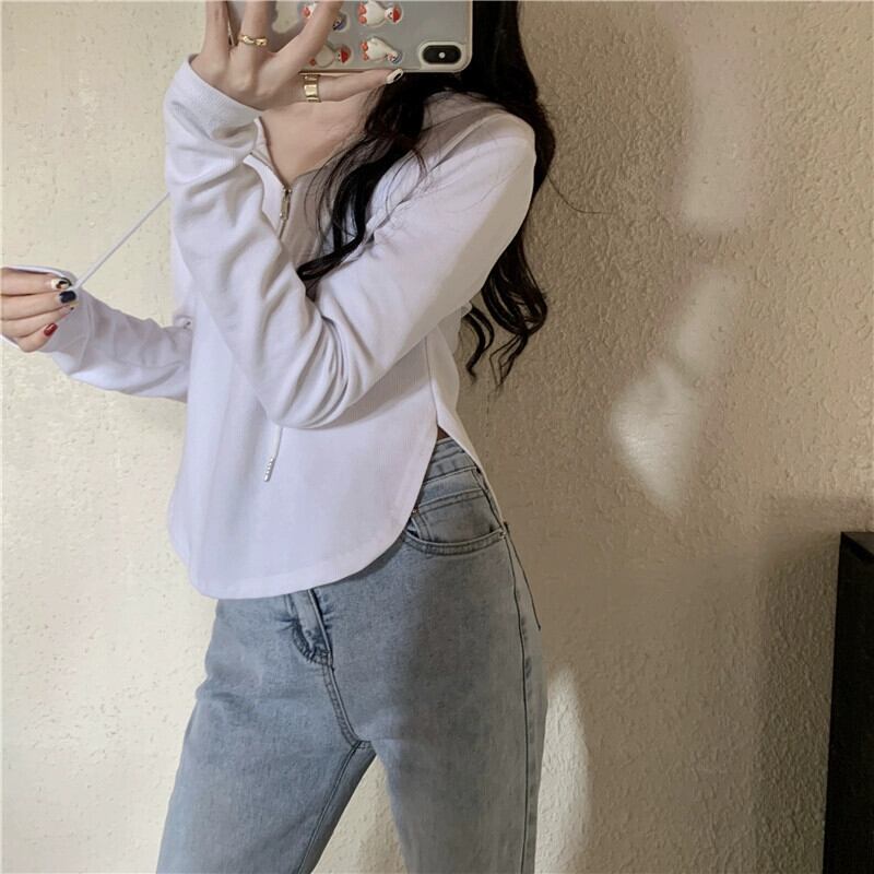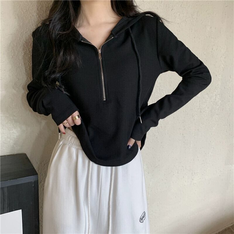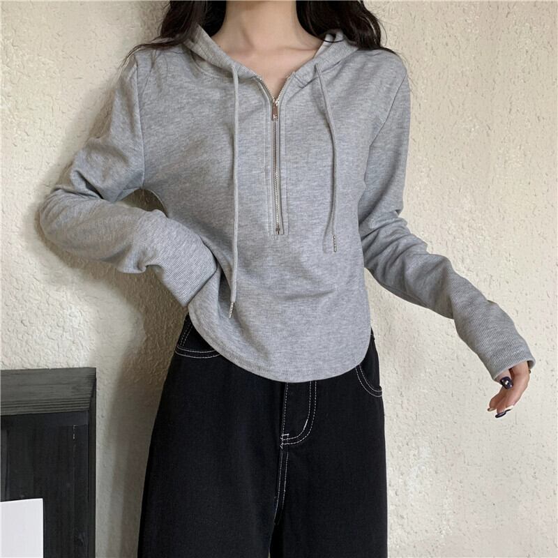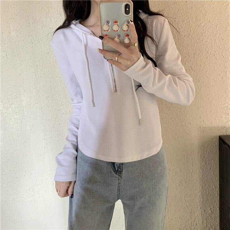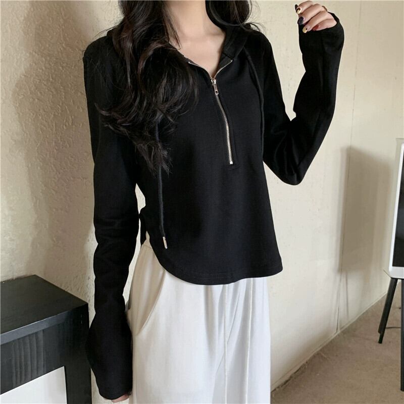 不規則なジッパーのフード付き長袖トップ女性、春と秋のスタイル、スタイリッシュでスリムフィット、ショートボトムTシャツ ロング スプリング 春物 オータム 秋物 7460095881649943 | framboise21