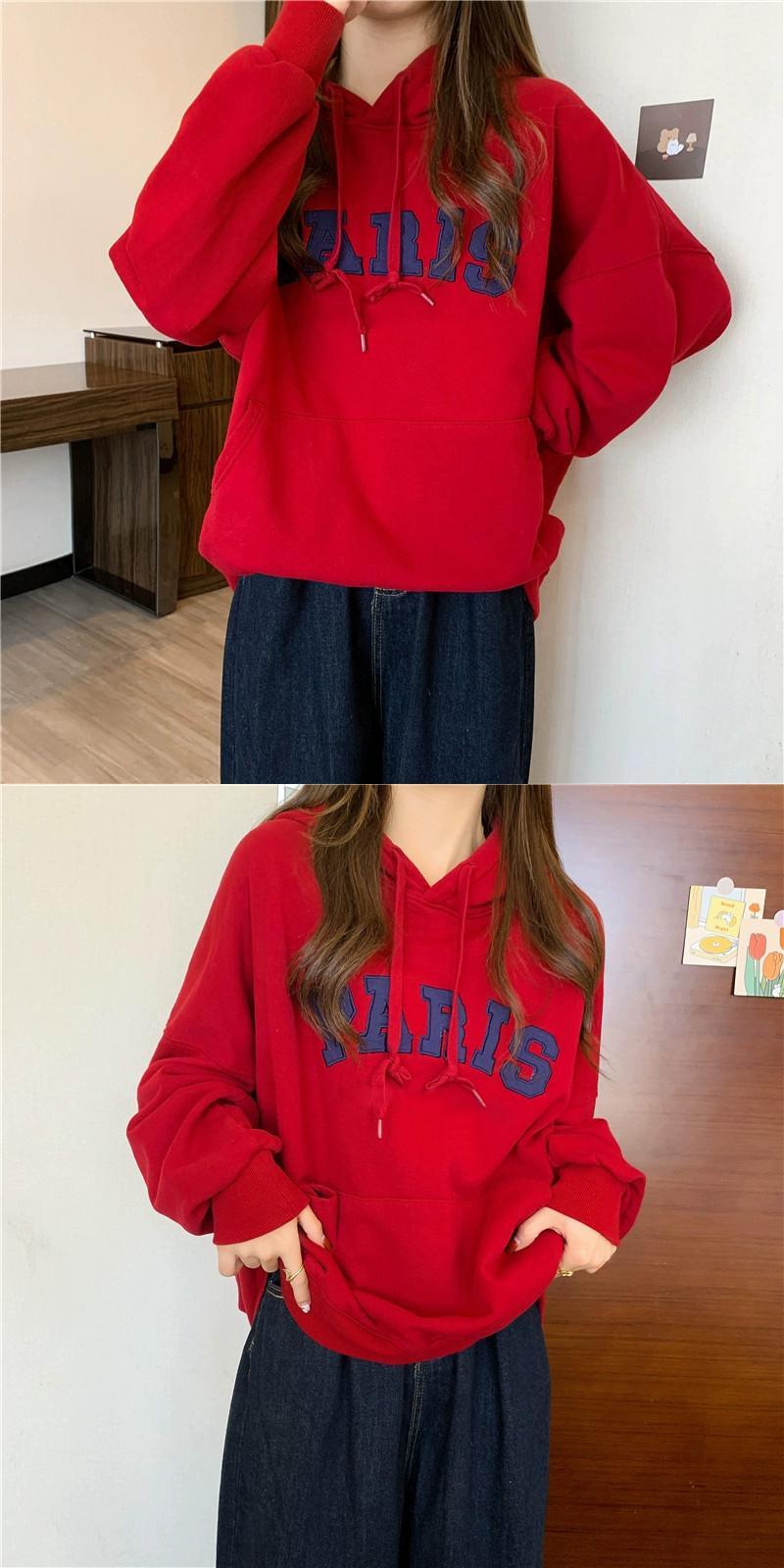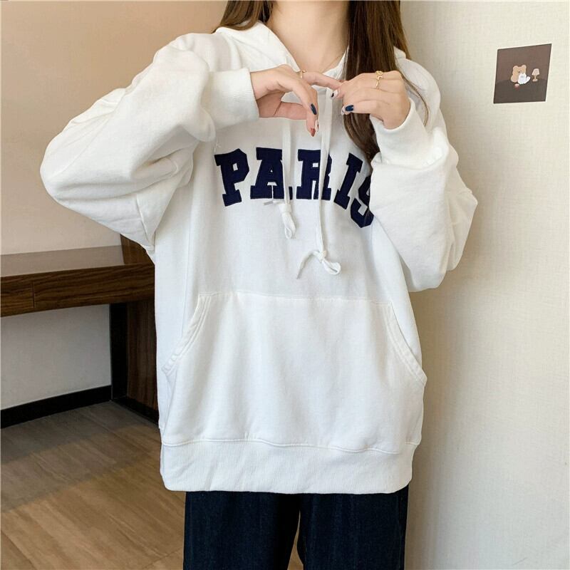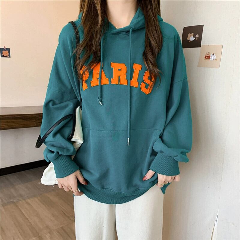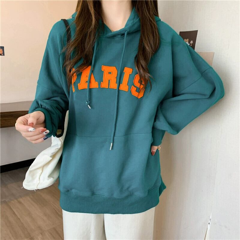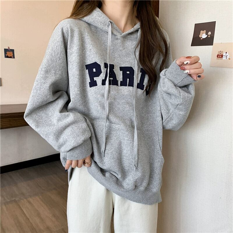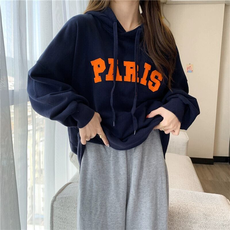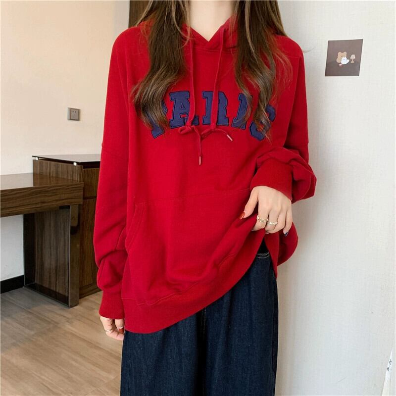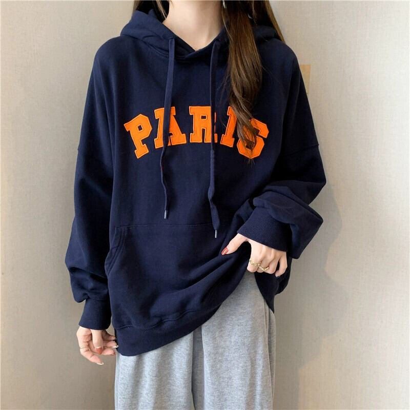 アメリカのミッドレングスのフード付きスウェットシャツの女性の秋と冬のルーズなスタイルのBF怠惰なスタイルのレタープリントプルオーバー長袖トップ ロング オータム 秋物 ウィンター 冬物 7460014623867103 | framboise21