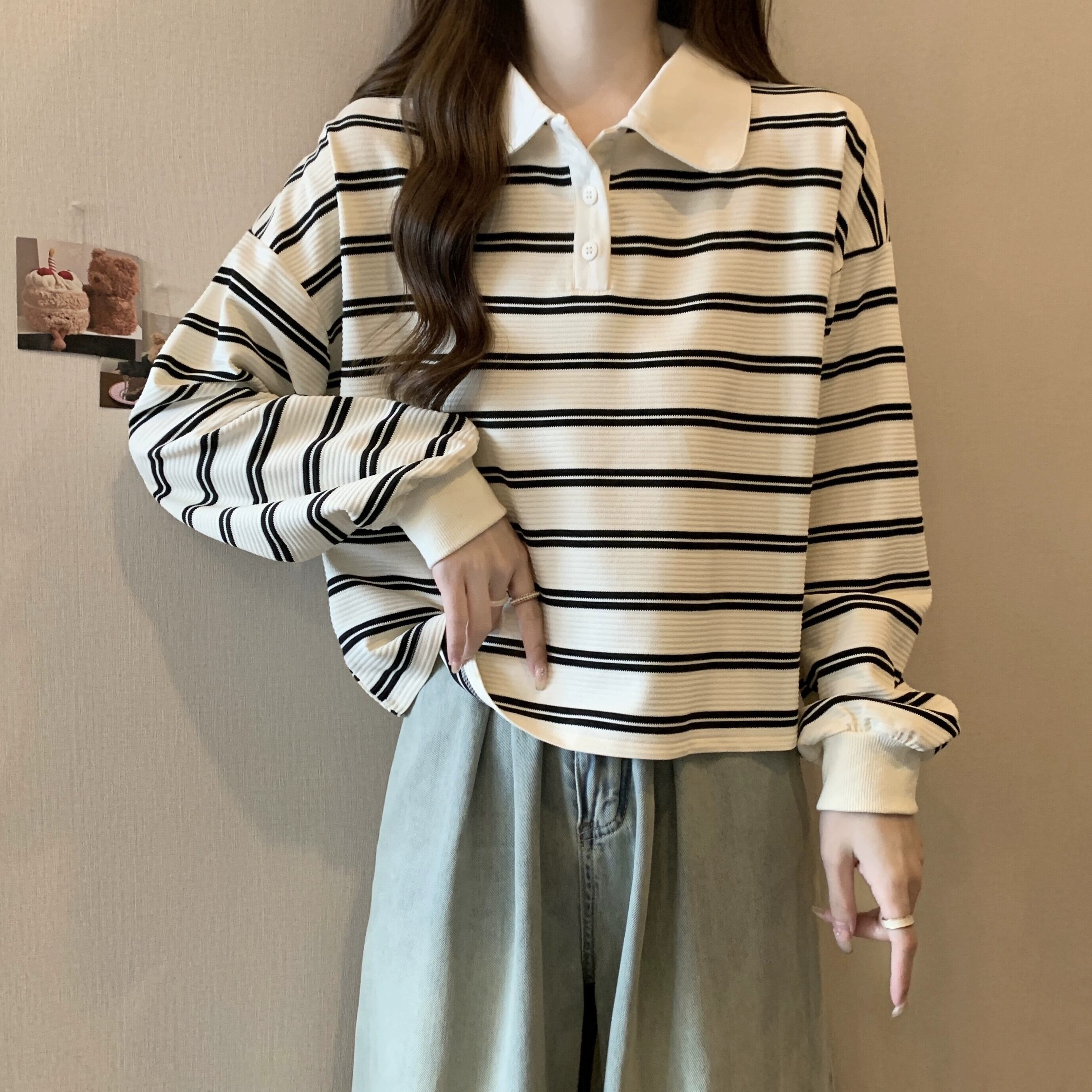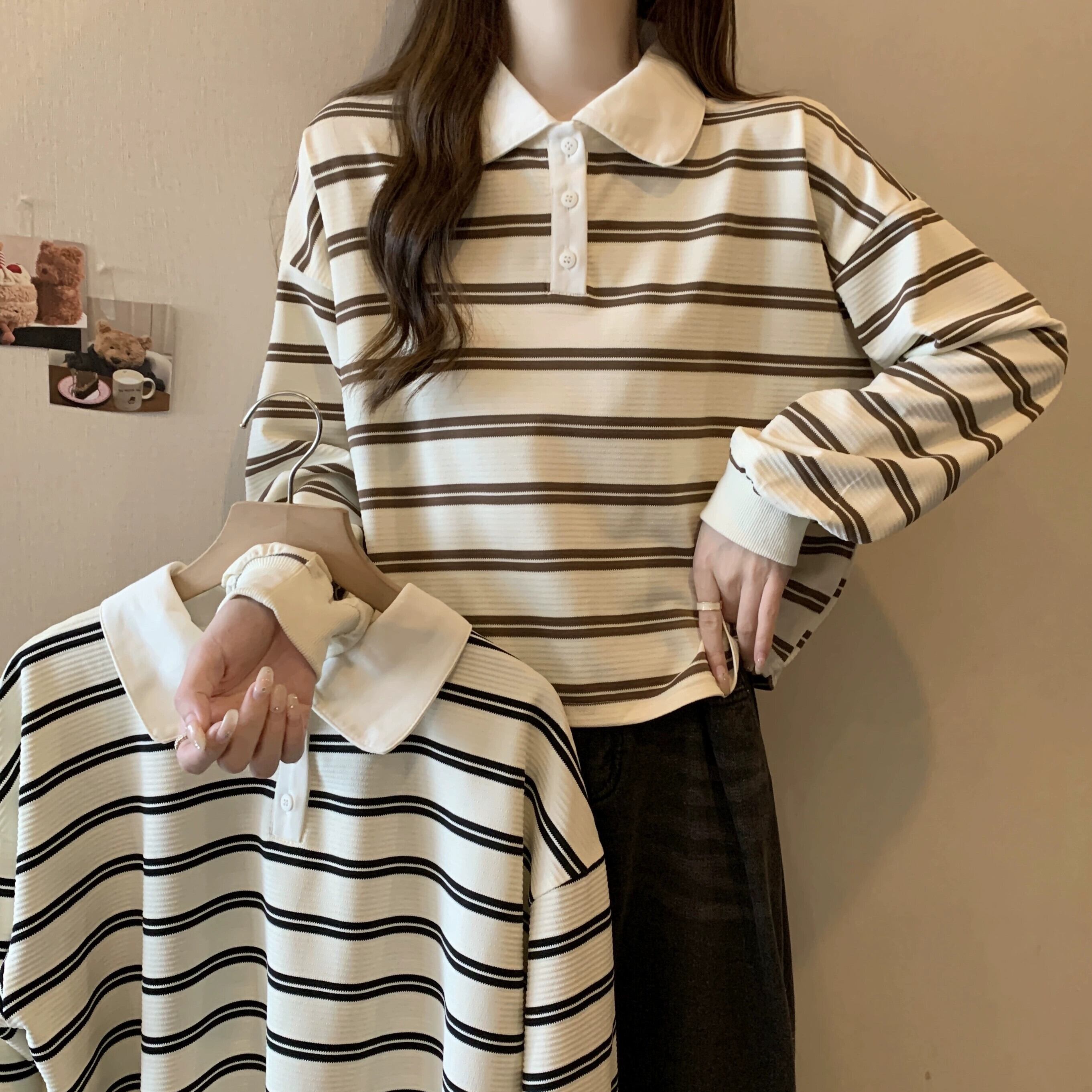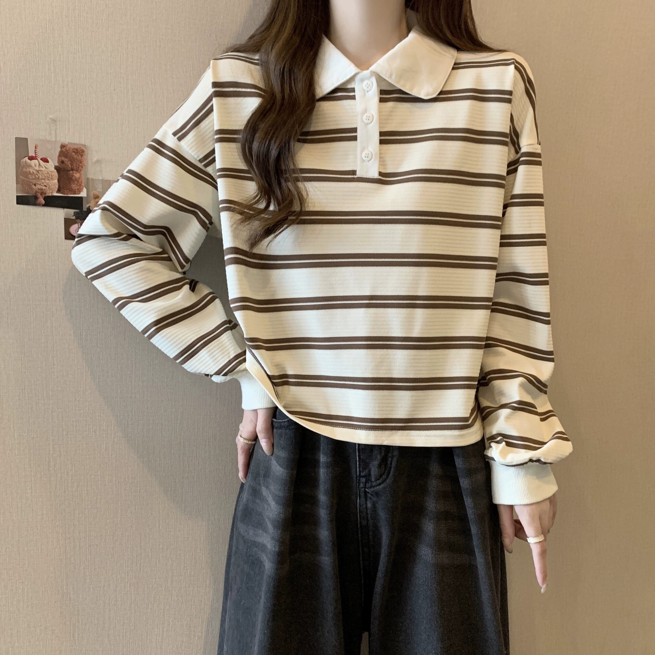 ポロカラーストライプショートスウェットシャツ女性 2023 新しい人気の春と秋のデザインルーズカジュアルプルオーバートップ スプリング 春物 オータム 秋物 7460096427266632 | framboise21